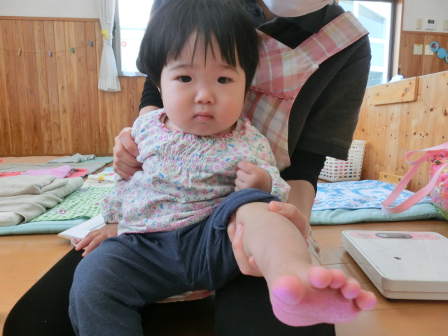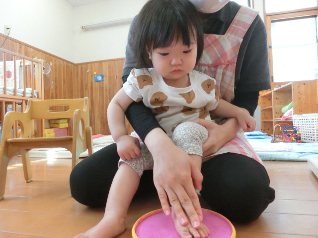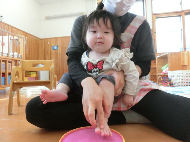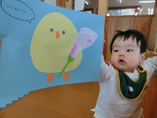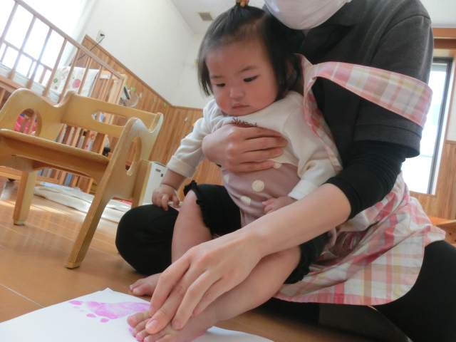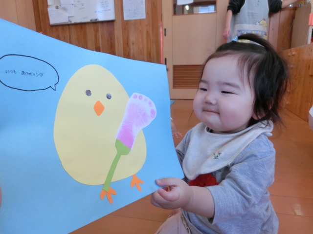 明日は母の日! ひよこ組さんでは、あとがとうの気持ちを込めて製作を行いました。 今回は、足形に挑戦です。冷たさや感触に驚く様子もありましたが、 「お?」、「うわー。」と、声に出しながら、上手に足形をすることができた子どもたち♪ かわいらしい足形をカーネーションに見立てて、完成です! 完成後は、製作を上手に手に持ったり、指を差したりするひよこ組さんでした。