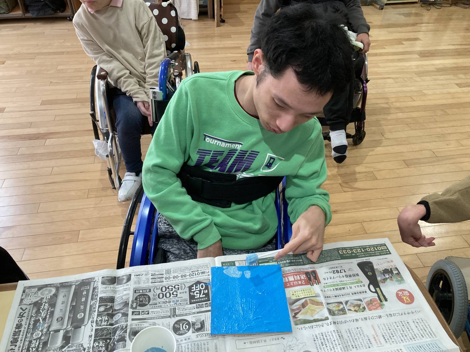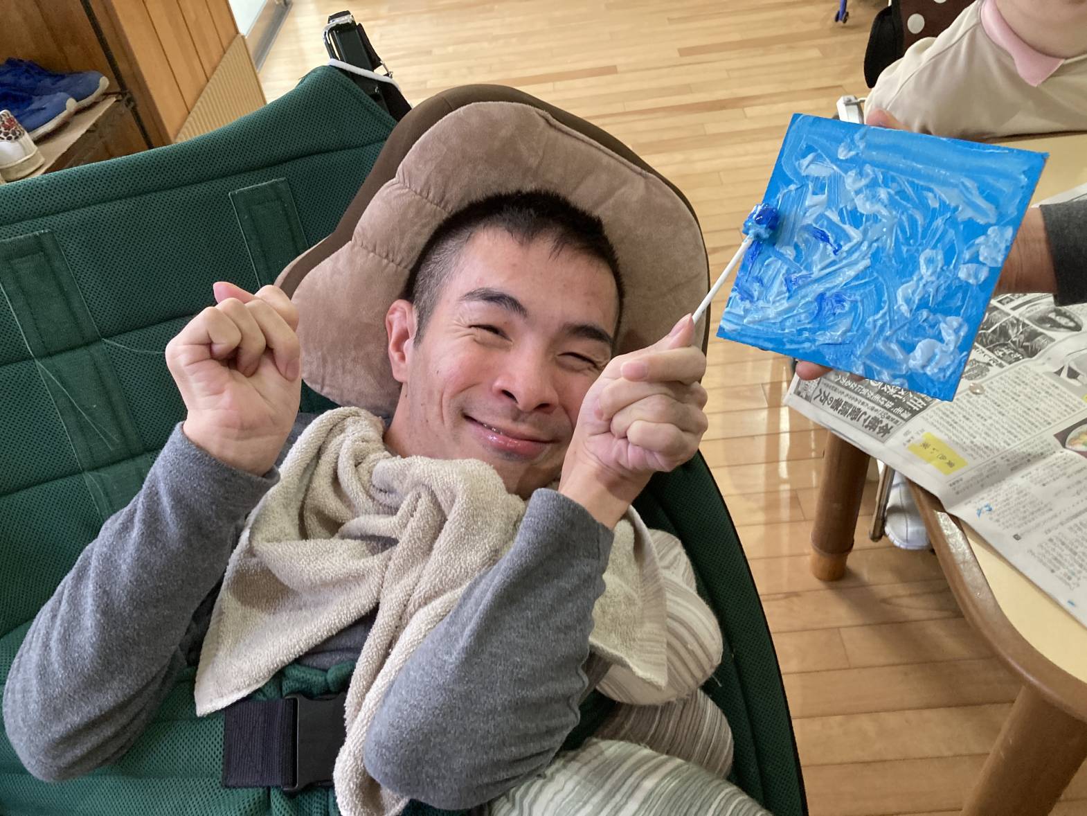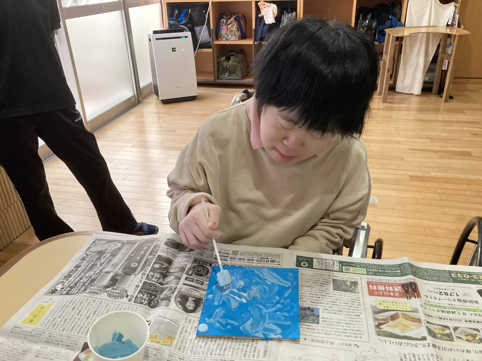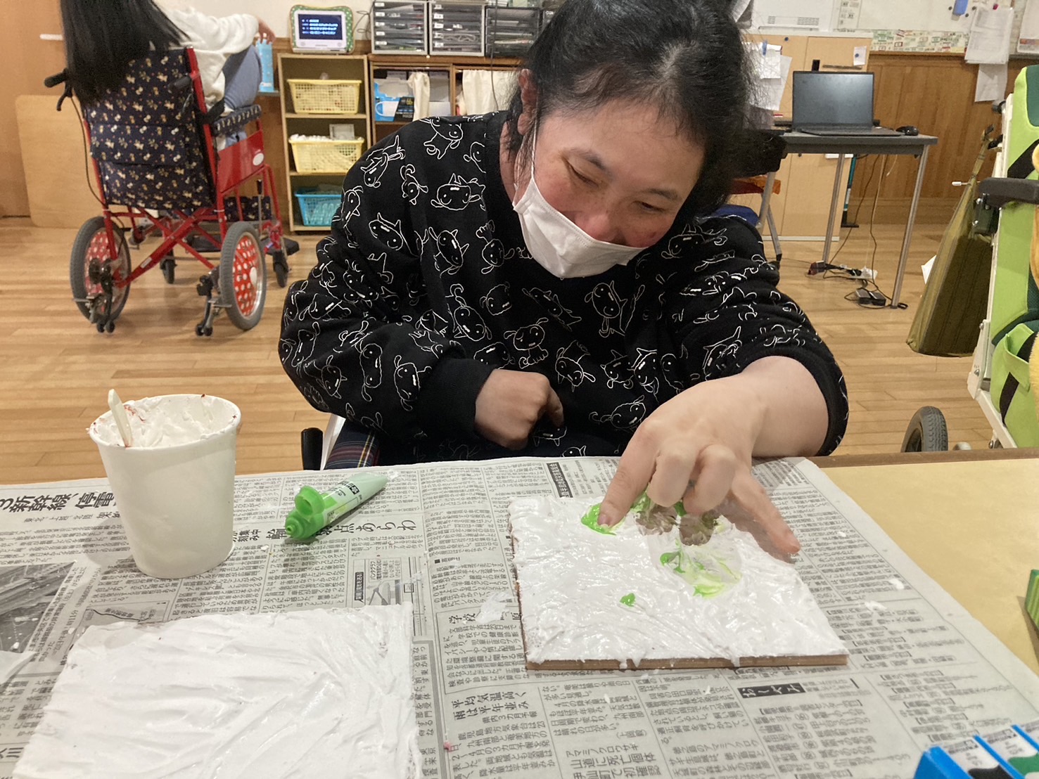 2月10日、13日でテクスチャーアートを行いました。 10日での活動は、皆さん好きな色をチョイスし、ホワイトをベースにデコレーションするように色を重ねていきました。 完成品がコチラ↓↓↓ それぞれ色合いやタッチが違い、どれも綺麗です★ 13日は、天気が良かったこともあり、ブルーをベースに空をイメージして色を重ねていきました。 利用者さんに色々な濃さのブルーを重ねていただき・・・ 出来上がったものを外で写真を撮ってみました!綺麗ですね★