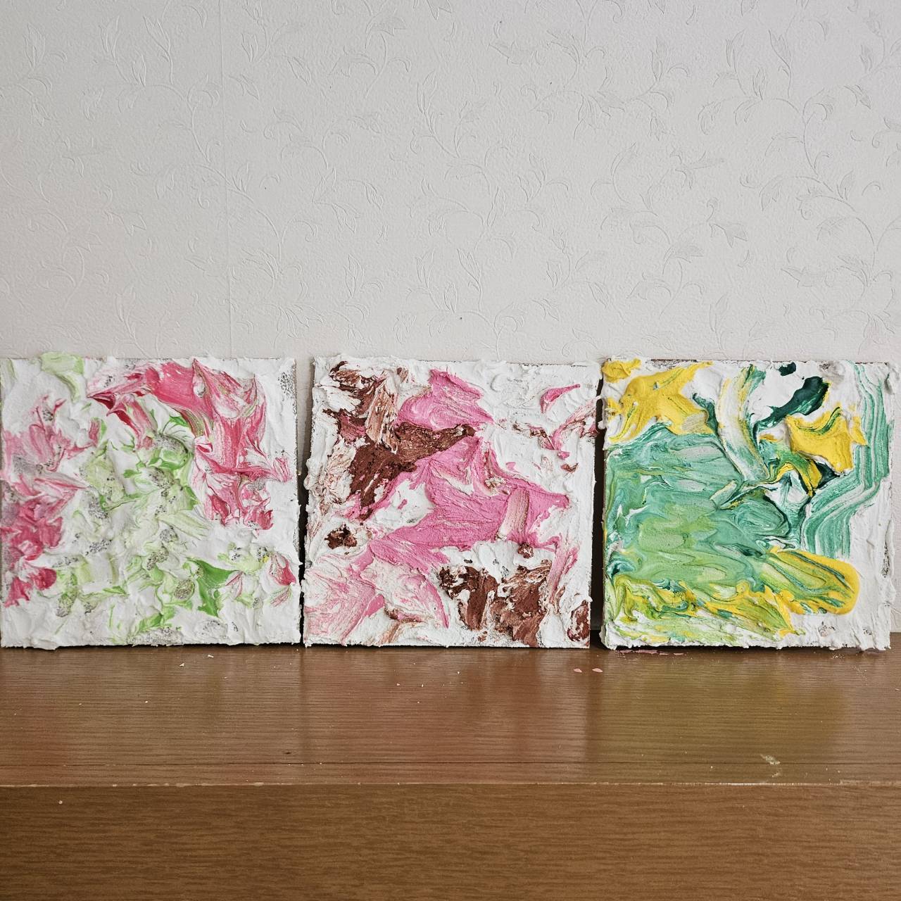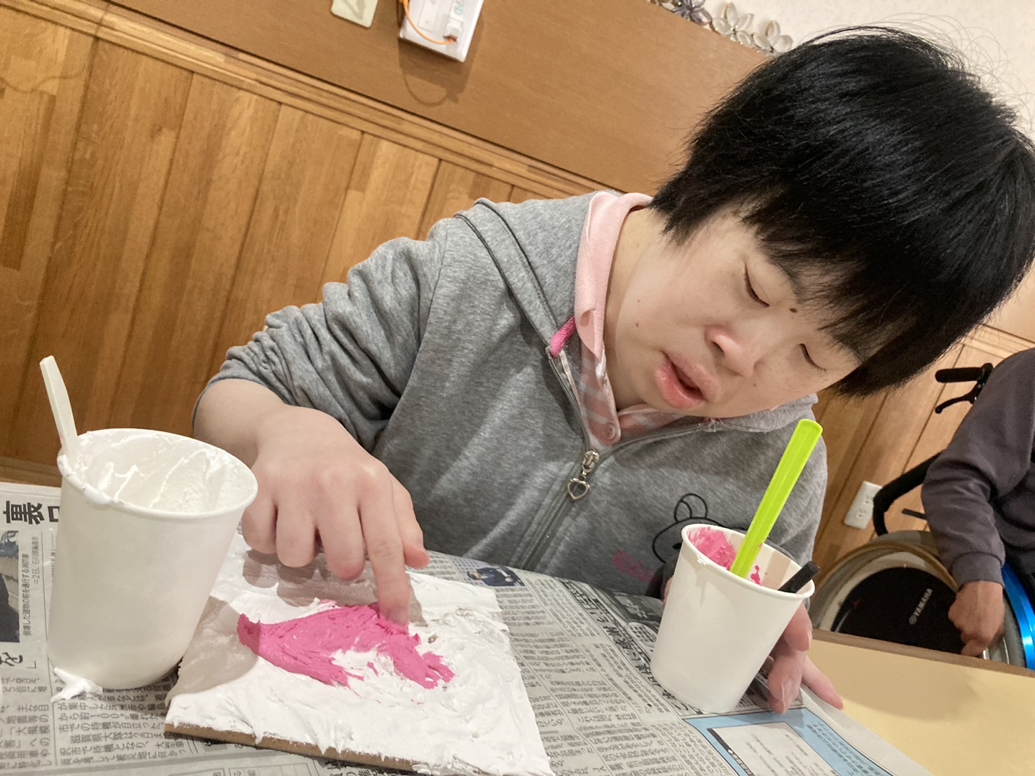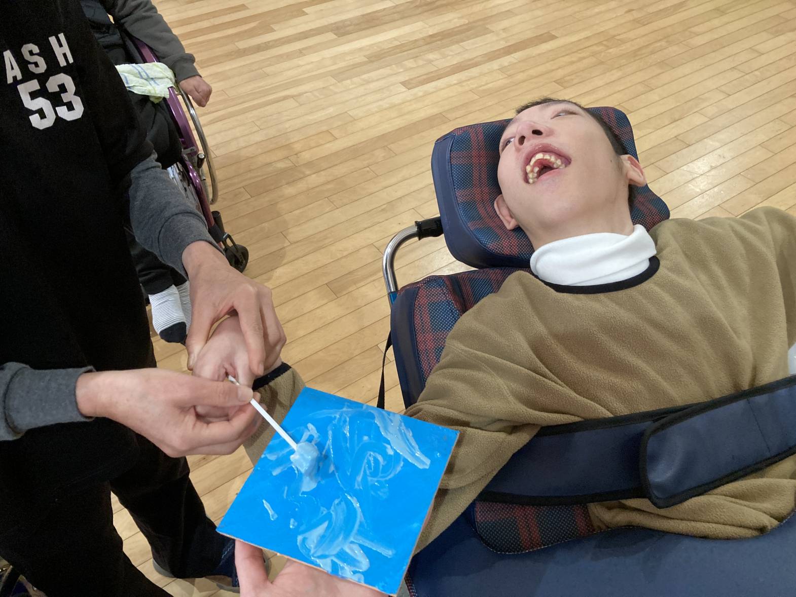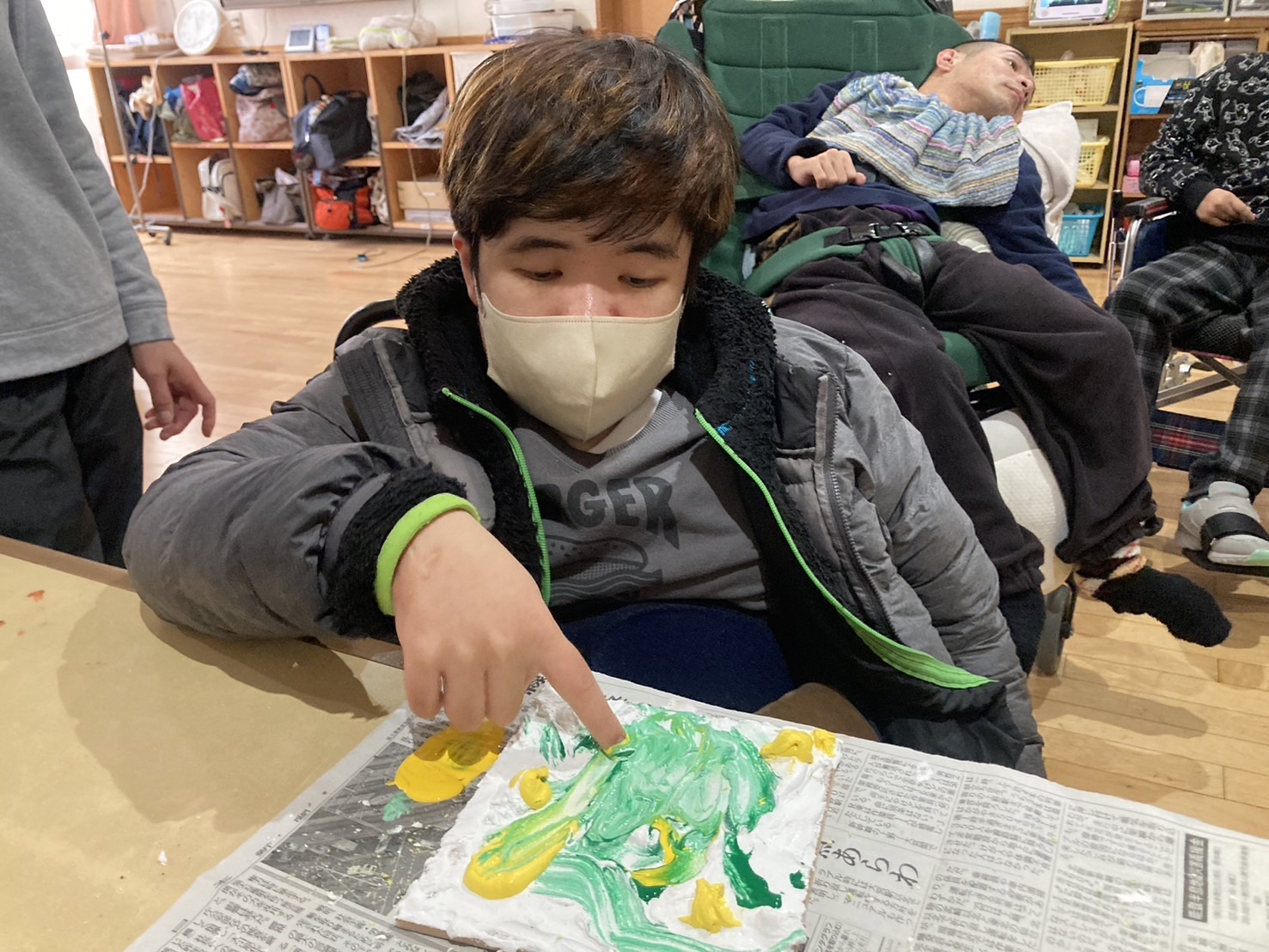 2月10日、13日でテクスチャーアートを行いました。 10日での活動は、皆さん好きな色をチョイスし、ホワイトをベースにデコレーションするように色を重ねていきました。 完成品がコチラ↓↓↓ それぞれ色合いやタッチが違い、どれも綺麗です★ 13日は、天気が良かったこともあり、ブルーをベースに空をイメージして色を重ねていきました。 利用者さんに色々な濃さのブルーを重ねていただき・・・ 出来上がったものを外で写真を撮ってみました!綺麗ですね★