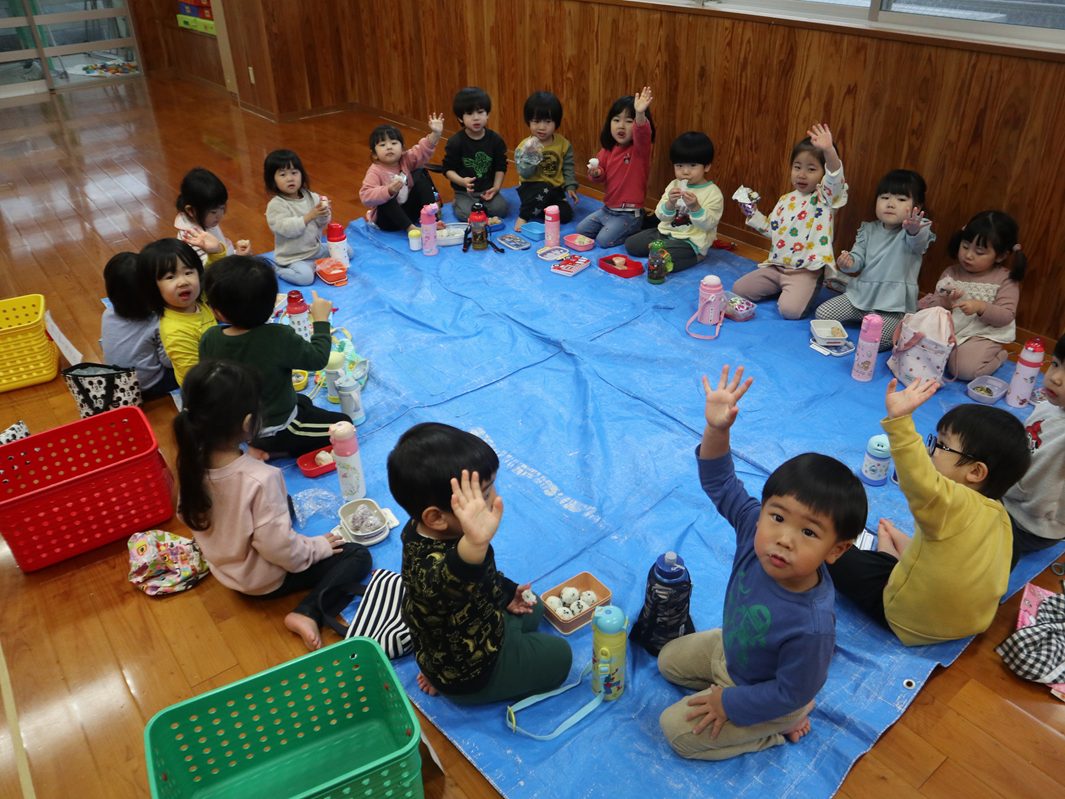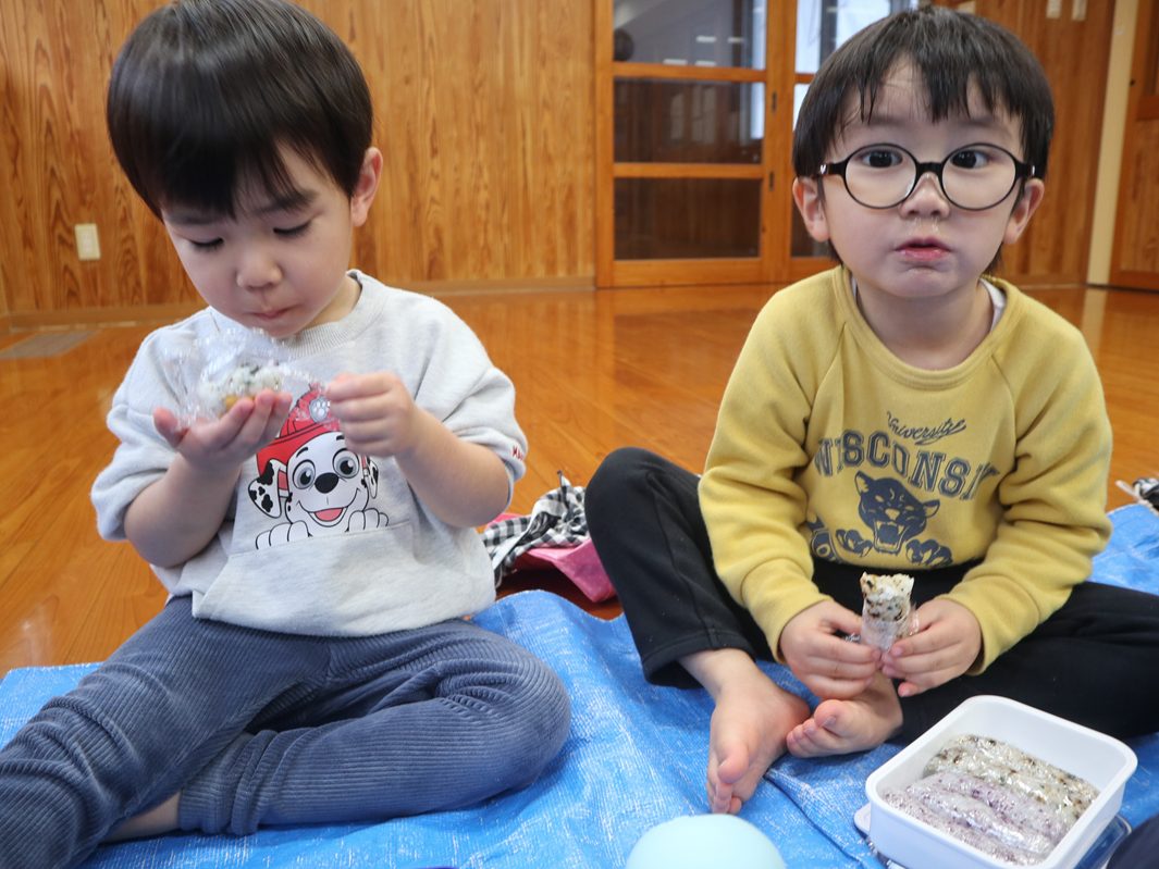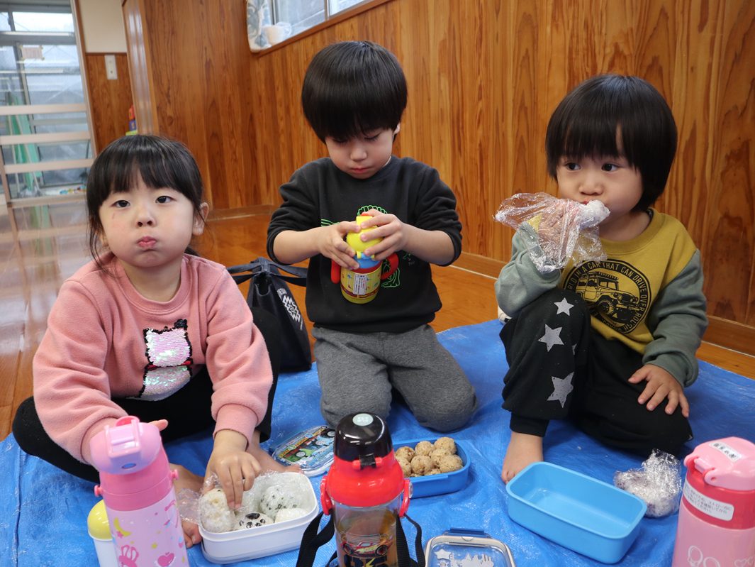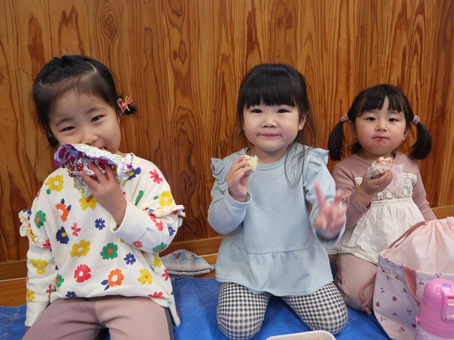 昨日は子どもたちが大好きなおむすびの日でした。 「おにぎり持ってきたよ!」と嬉しそうなぱんだ組さん。 「見て見て!」「かわいいでしょ!」とおむすびやお弁当箱を見せ合いながら、おいしそうに食べ進める姿が見られ、満面の笑みが見られます! 「りす組さんになったら、公園で食べるんだよね?!」と進級後のおむすびの日に期待を高まっているようです。