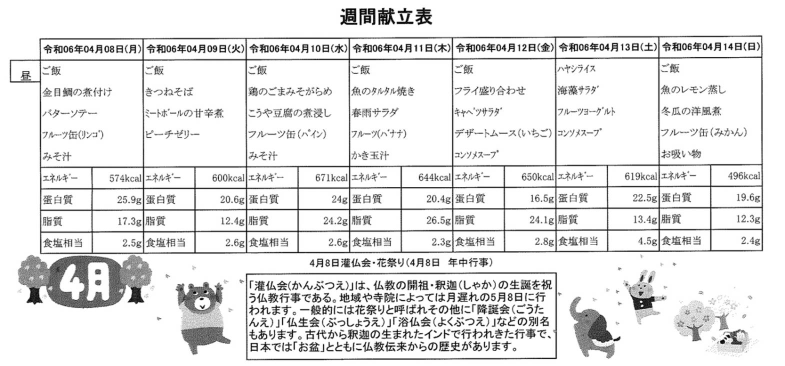 4月8日(月)~4月14日(日)の献立表になります。ぜひご覧ください。