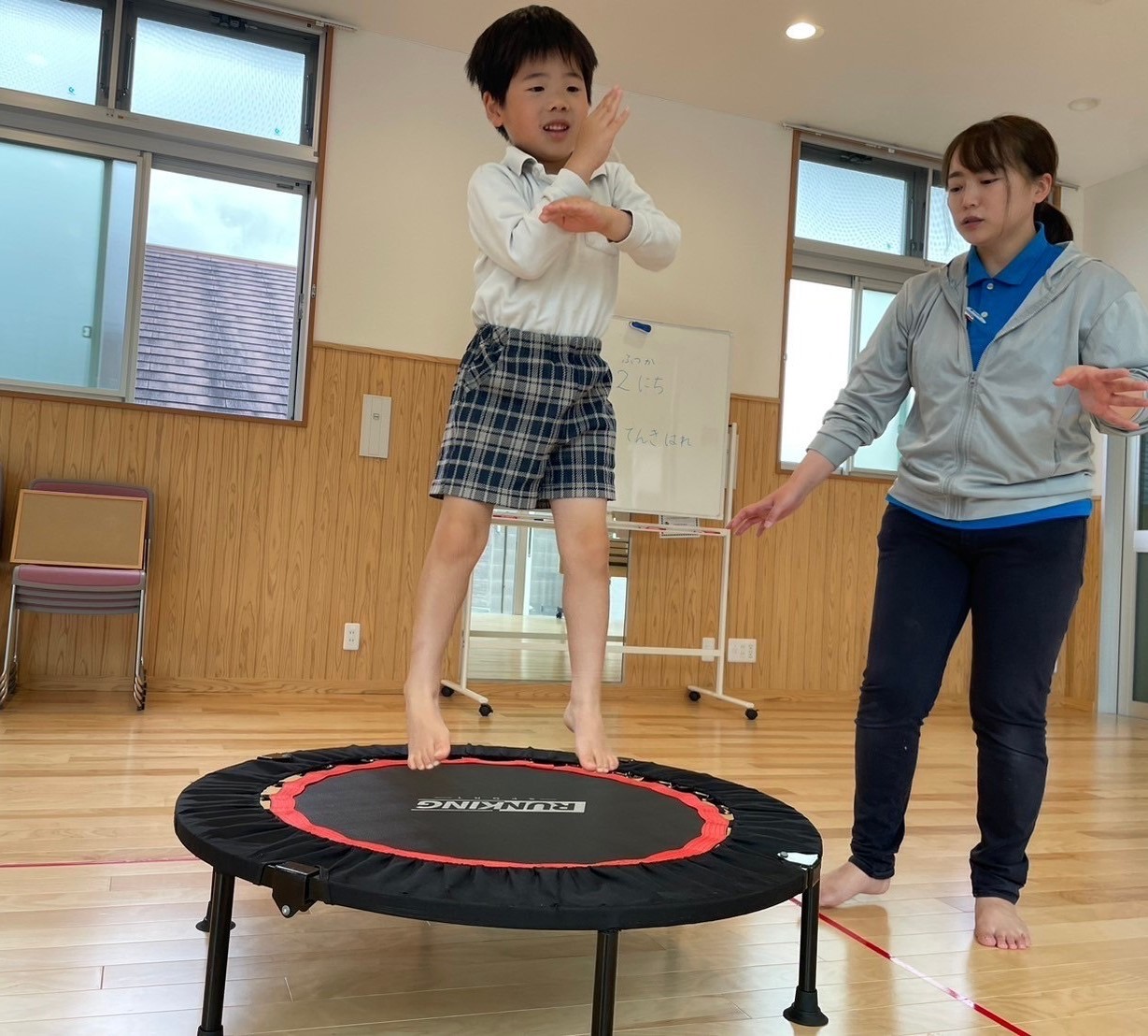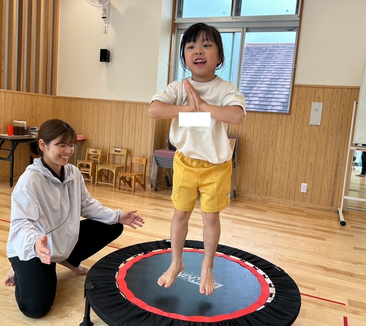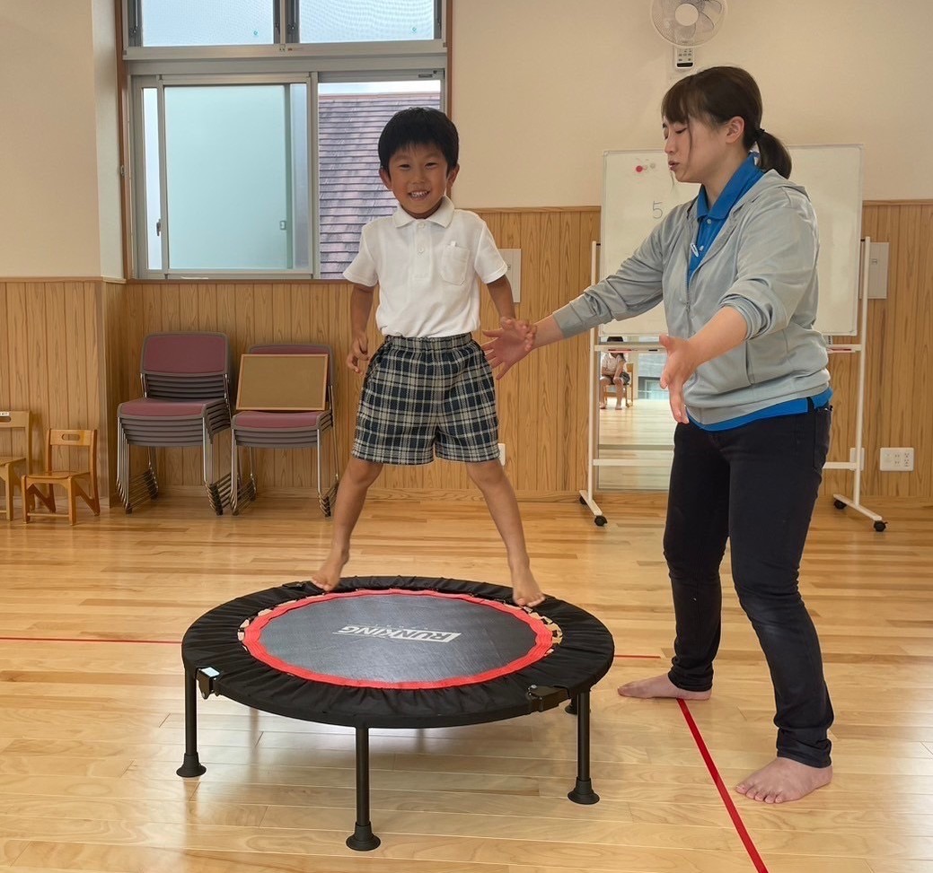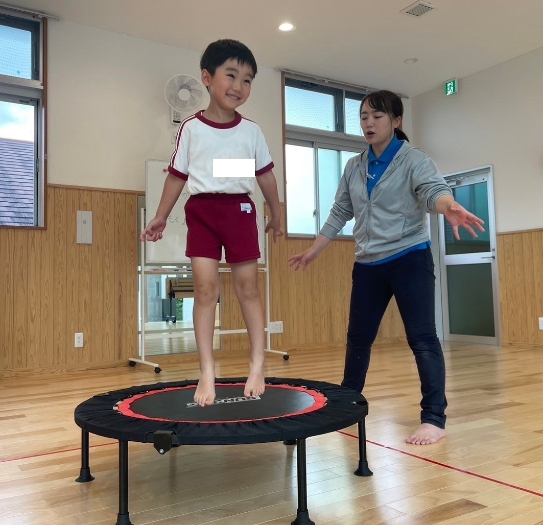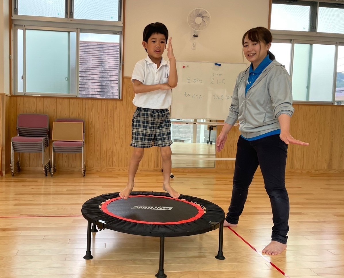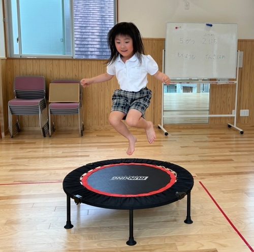 トランポリンをしました! 「トランポリン!やった!」とトランポリンに笑顔になる子どもたち。 「1、2、3!」とタイミングを合わせて高く跳んだり、足を広げて跳んだりして取り組みましたよ。 好きな跳び方では、ポーズを決めながら跳ぶ姿も見られました! 活動の終わりには、「まだやりたかった!」、「次はもっと高く跳ぶ!」という声が聞かれましたよ♪