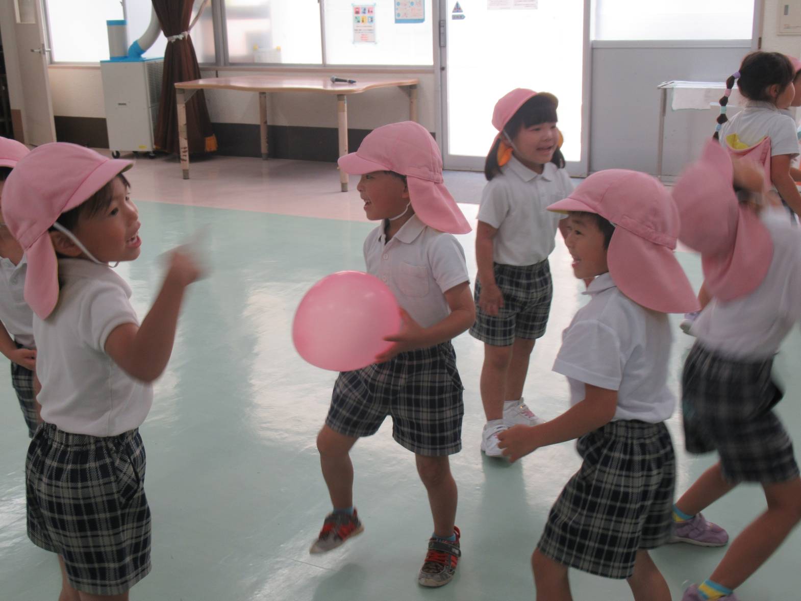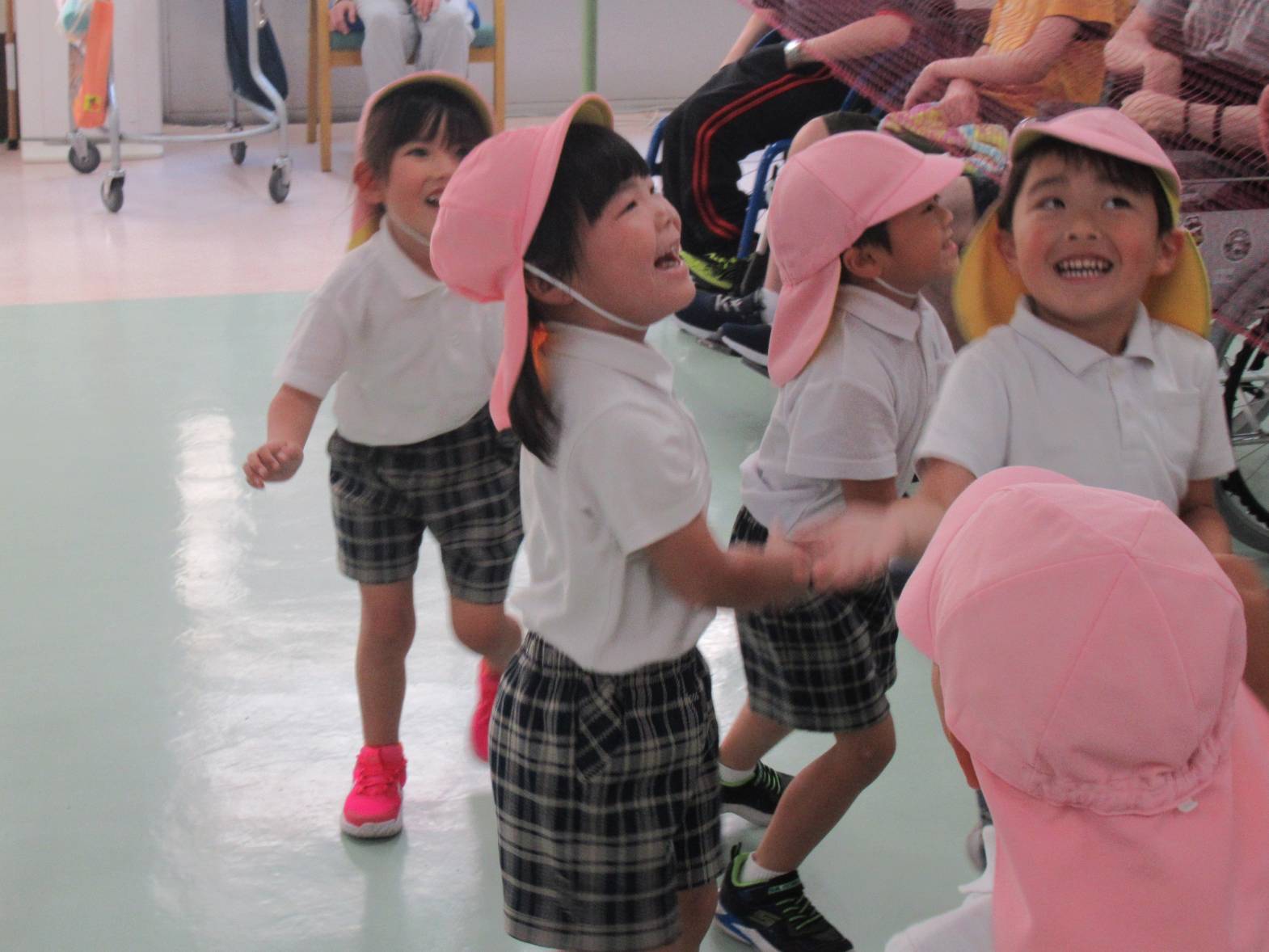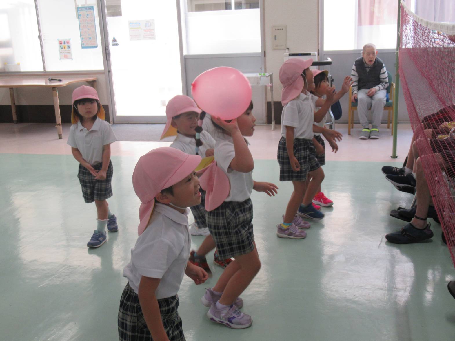 誠光園へ行き、利用者さんと交流をしました! まずは自己紹介!少し緊張しながらも名前を言う子どもたち。 今日の活動は風船バレー! 「風船きた!」、「いけ!○○ちゃん!」と風船を追いかけながら、ラリーを楽しんだきりん組さんでした。