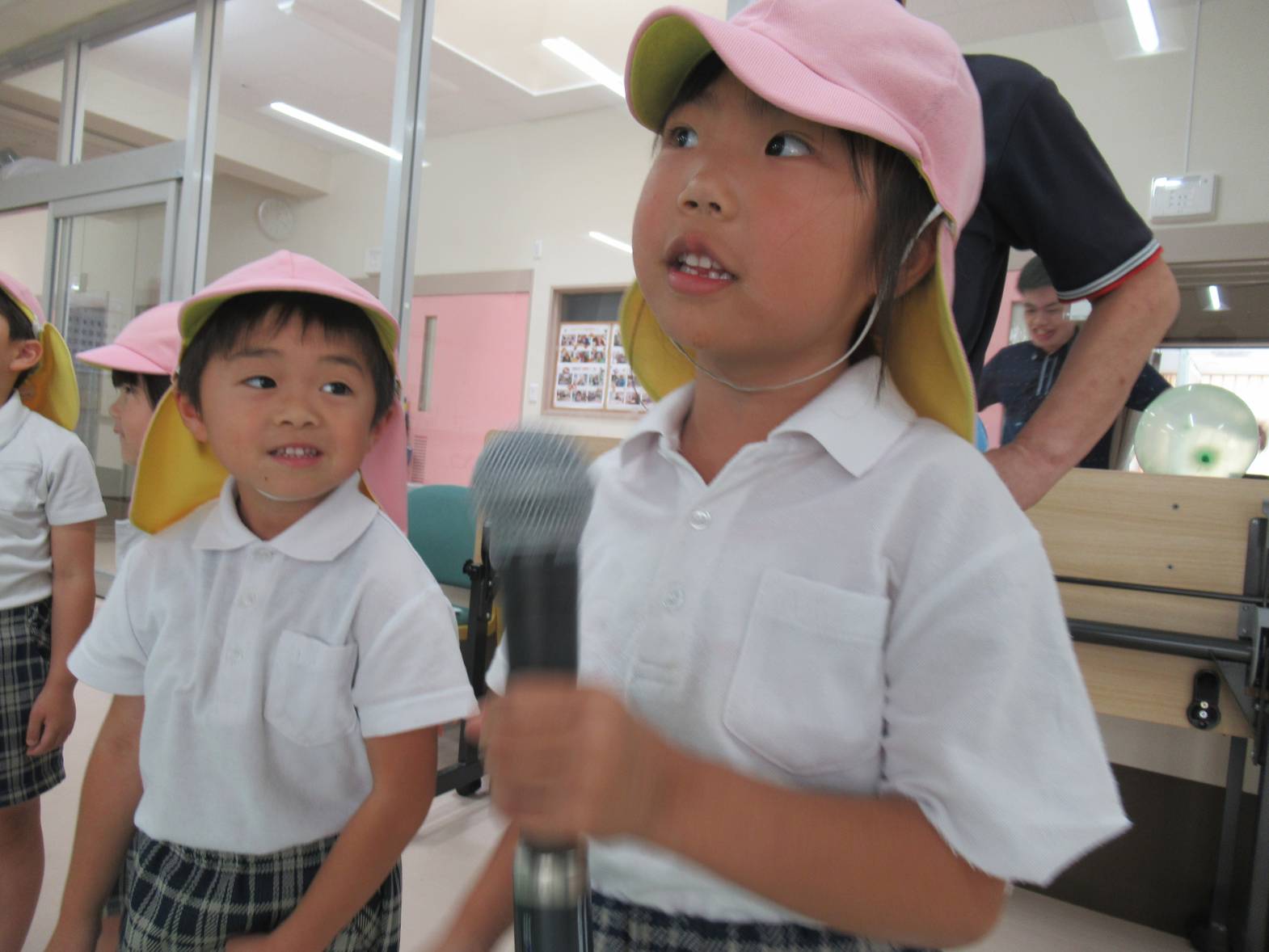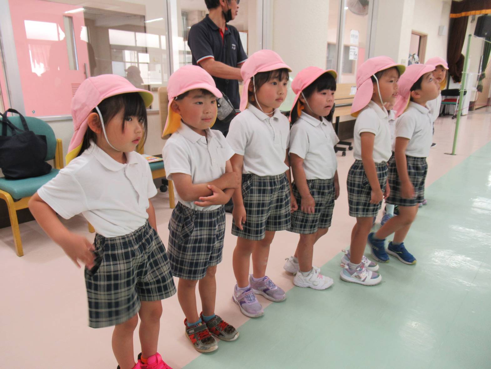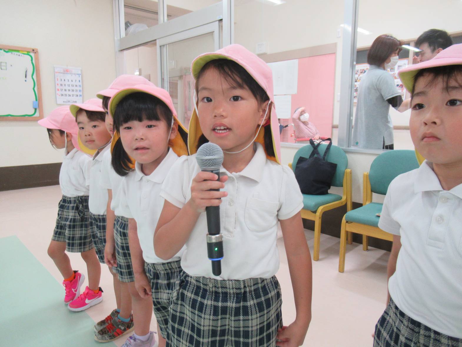 誠光園へ行き、利用者さんと交流をしました! まずは自己紹介!少し緊張しながらも名前を言う子どもたち。 今日の活動は風船バレー! 「風船きた!」、「いけ!○○ちゃん!」と風船を追いかけながら、ラリーを楽しんだきりん組さんでした。