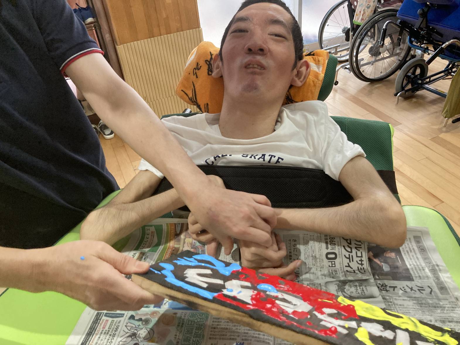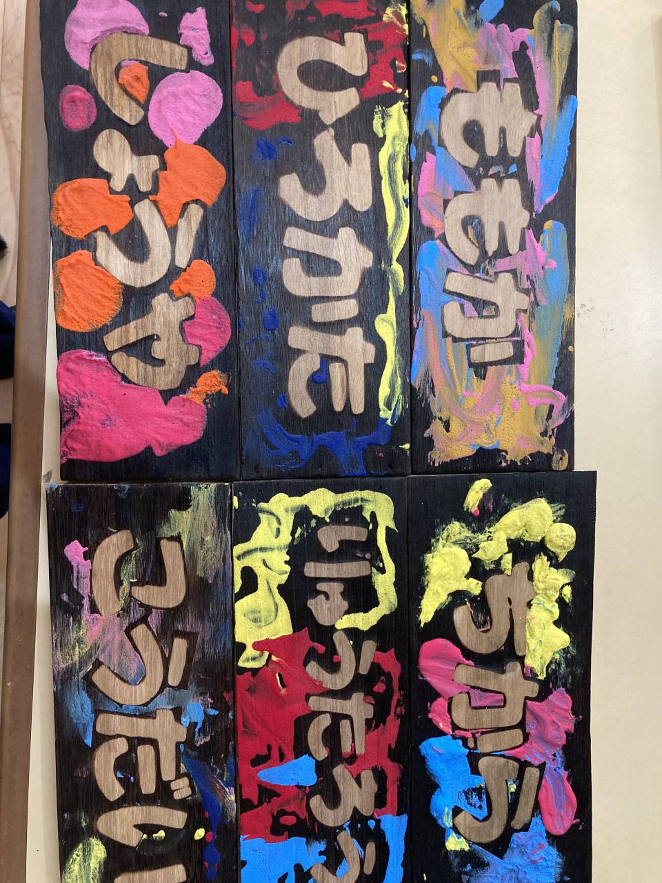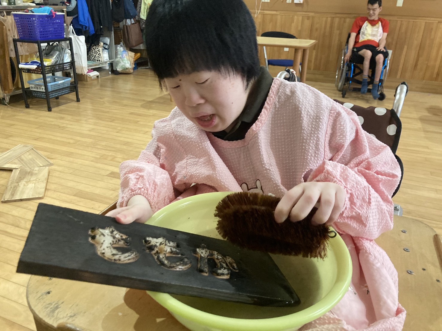 7月から8月にかけて、ひなたの利用者の皆さんと一緒に焼き板体験を行いました。 板に名前をのりで書き、板を焼いた後に好きな絵で模様を描きます。 上手に焼けたかな? 板が焼けたら、たわしでゴシゴシ! どんな焼き上がりなっているのか、楽しみですね! 焼きあがった後に、仕上げのペイントを行いました。 一人ひとり、個性が出ておりとってもいいですね! とっても素敵な焼き板が完成しました! 次回の活動も楽しみにしておいてくださいね!