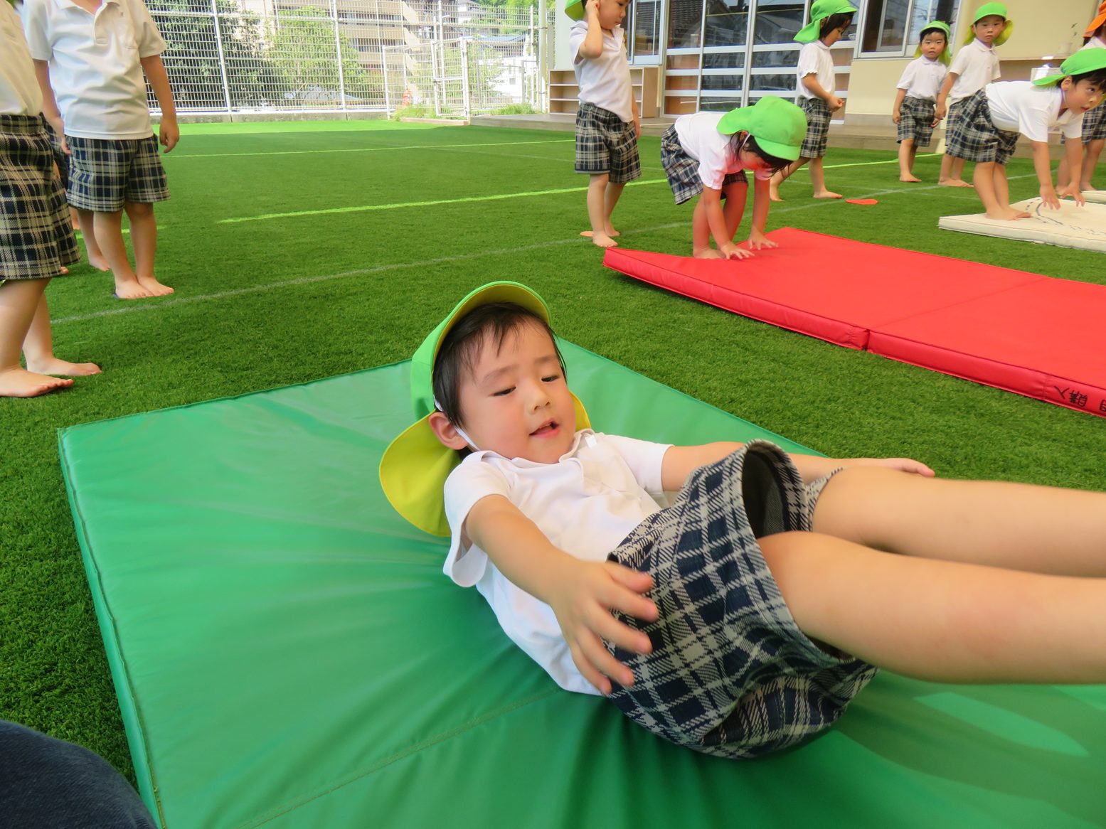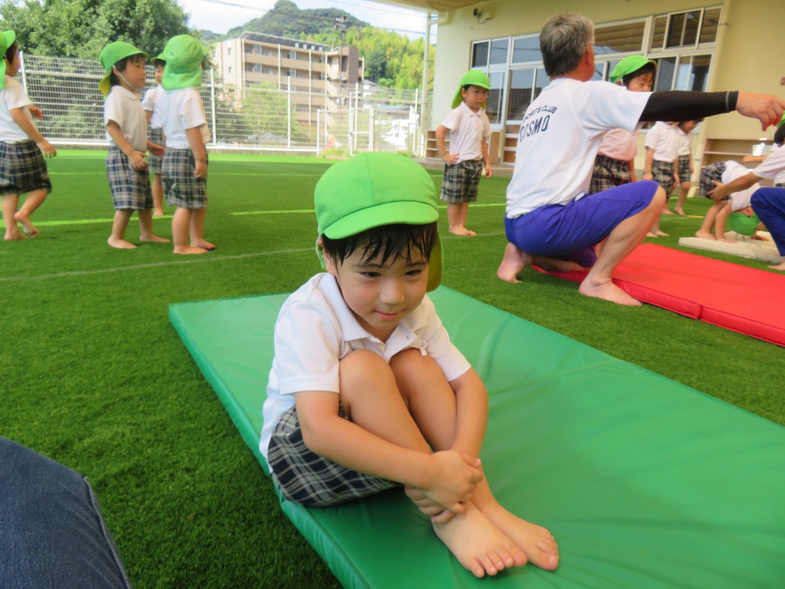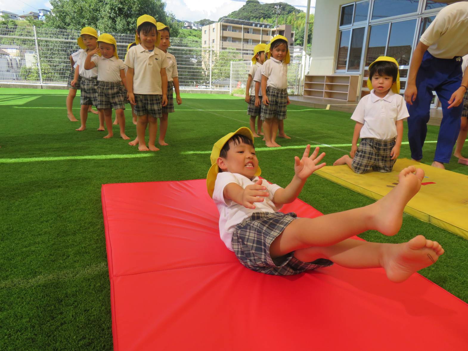 準備運動とマラソンを全力で行った後の前転では、少し疲れが出たのか前転をした後、「あれ?起き上がれない!」と起き上がることに苦戦する子の姿が見られました。