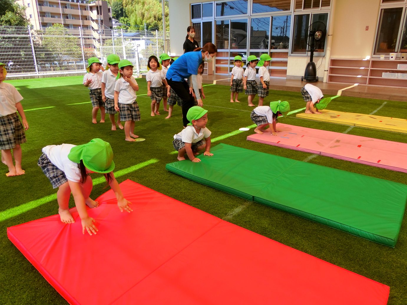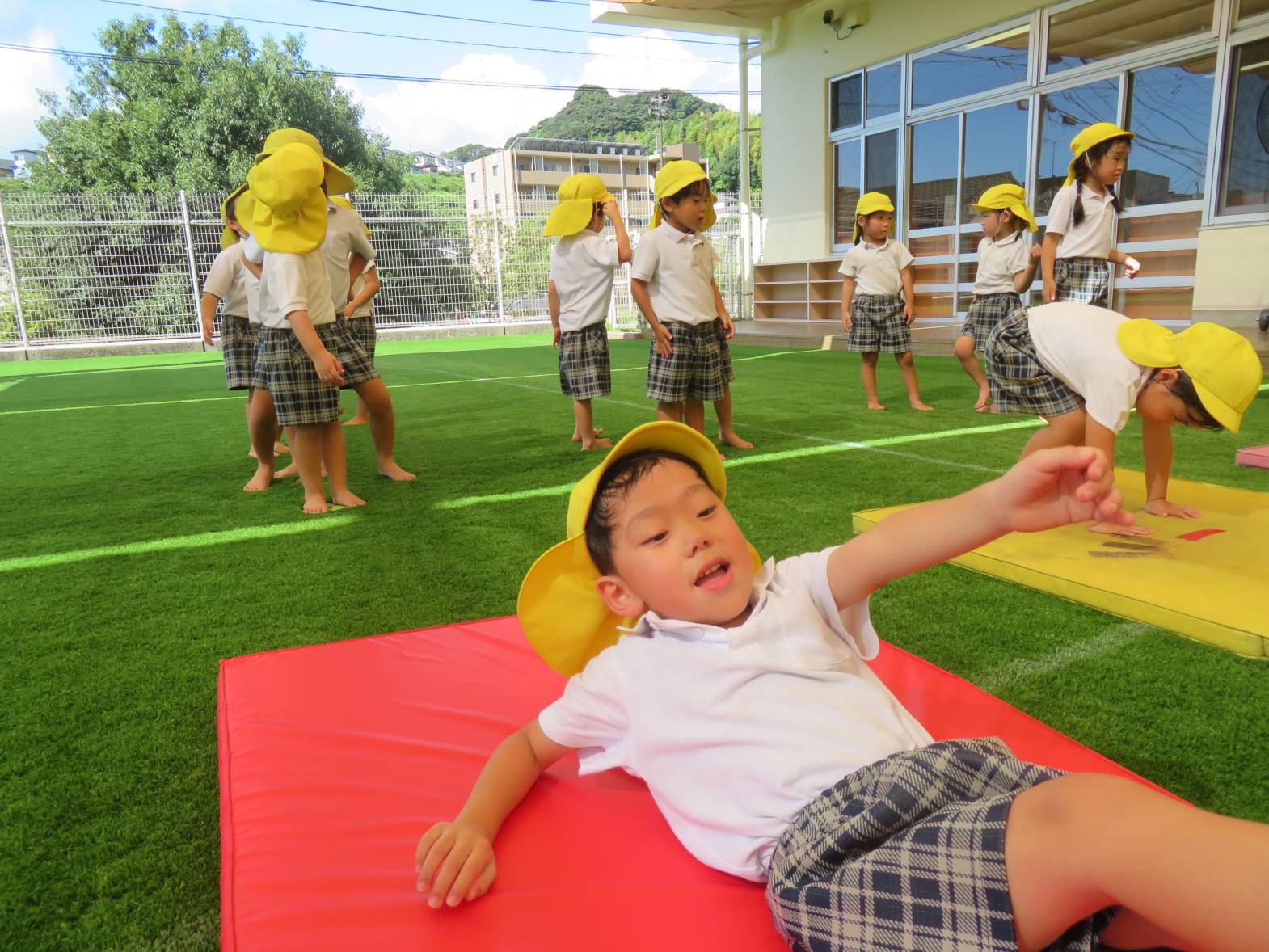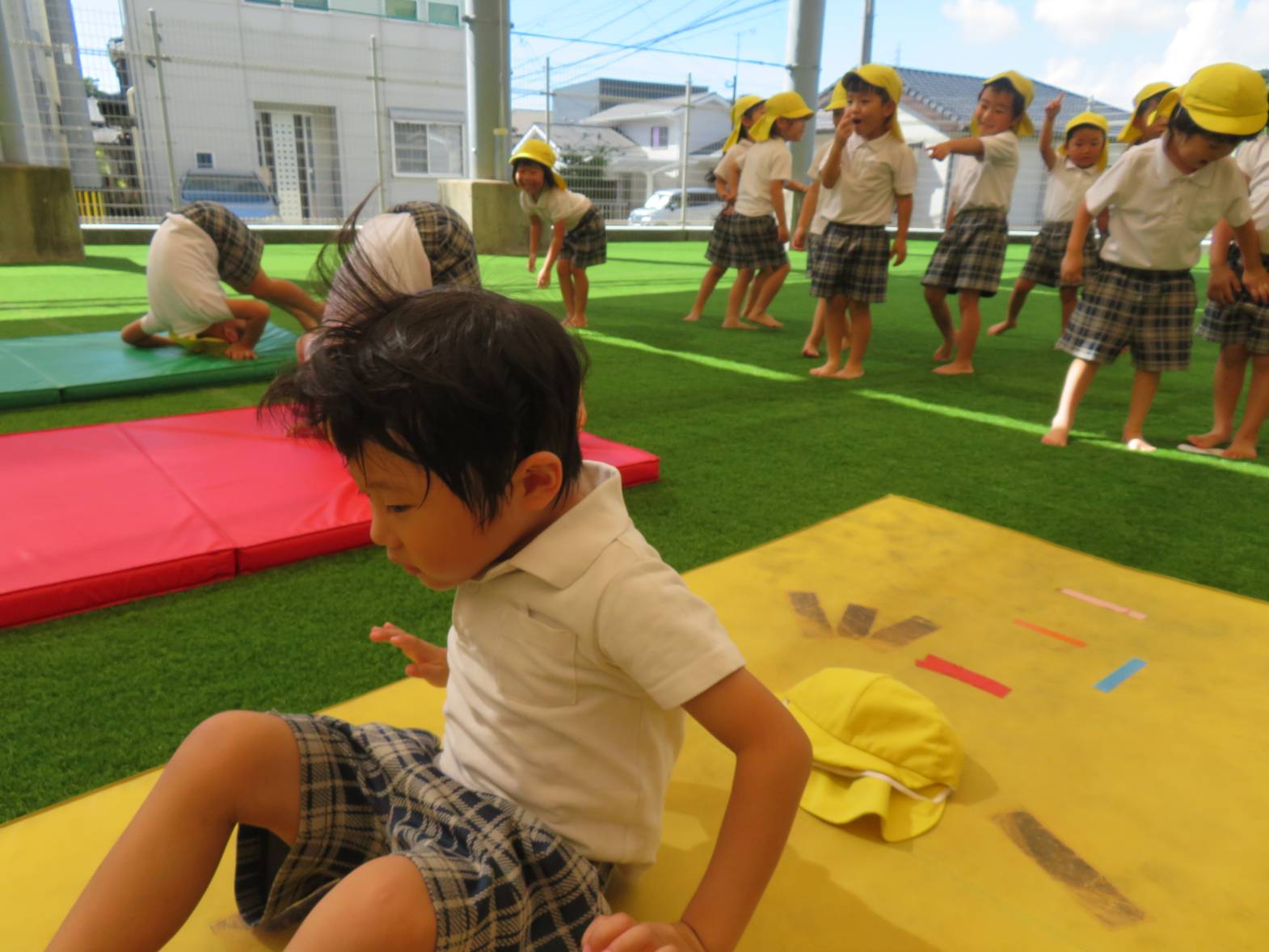 準備運動とマラソンを全力で行った後の前転では、少し疲れが出たのか前転をした後、「あれ?起き上がれない!」と起き上がることに苦戦する子の姿が見られました。