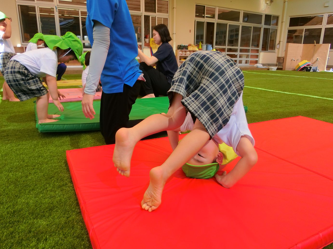 「おへそを見るんだよね。」、「手ここ?」と確認をしながら前転に挑戦します。