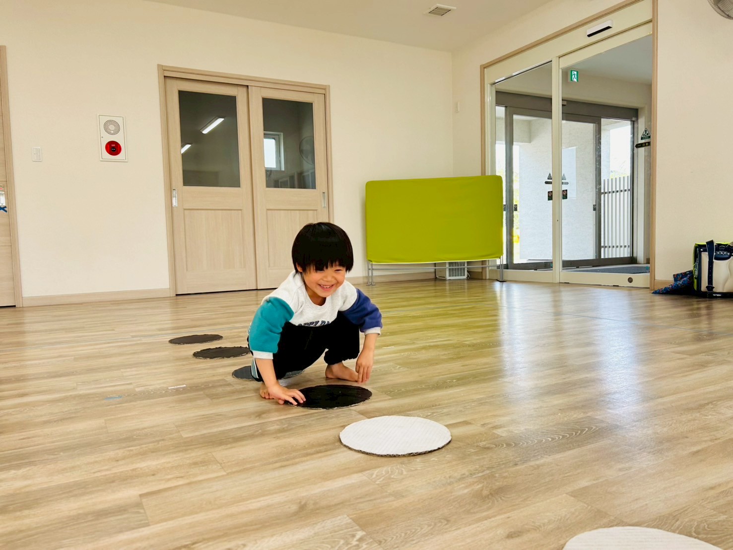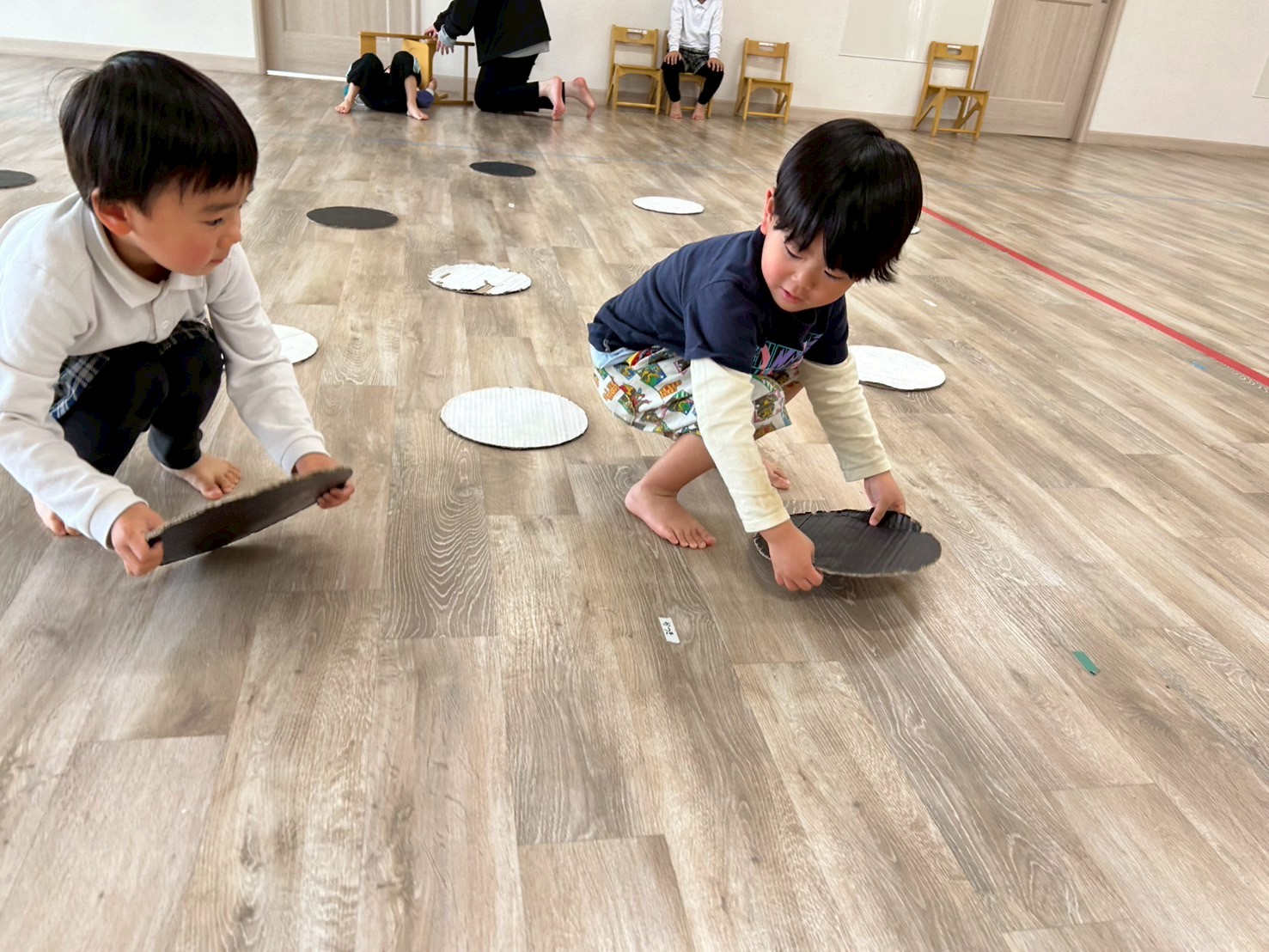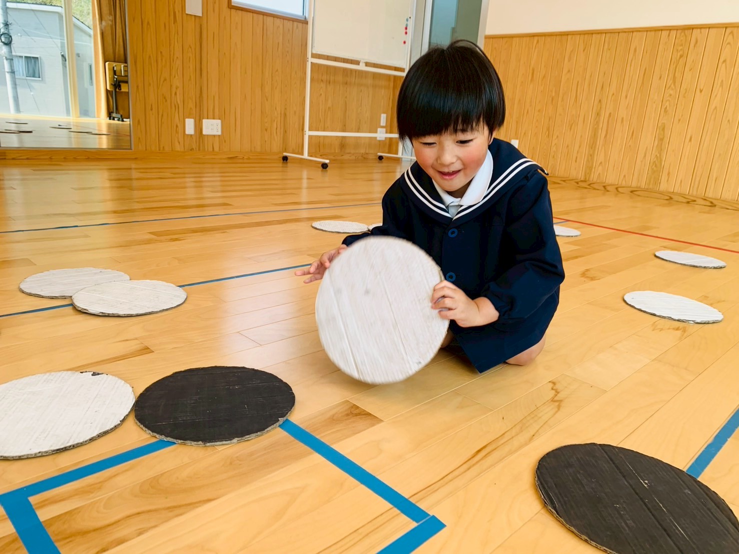 段ボールで作られたオセロを使って、ひっくり返し競争を行いました。 一列に並べたオセロをひっくり返して進む競争では、腰を低くして勢いよくオセロを返しながら前に進む様子が見られましたよ! ホール全面に広げられたオセロを、自分の担当の色を裏返す競争では、素早く移動して裏返すことができていました! 勝敗が付くと両手を挙げて喜ぶ子も悔しくて涙が出る子もいます。 それでも何度も何度も挑戦して全員が一度は勝負に勝つことができました! 悔しくても最後まで頑張る子どもたちの姿はかっこよかったですよ♪