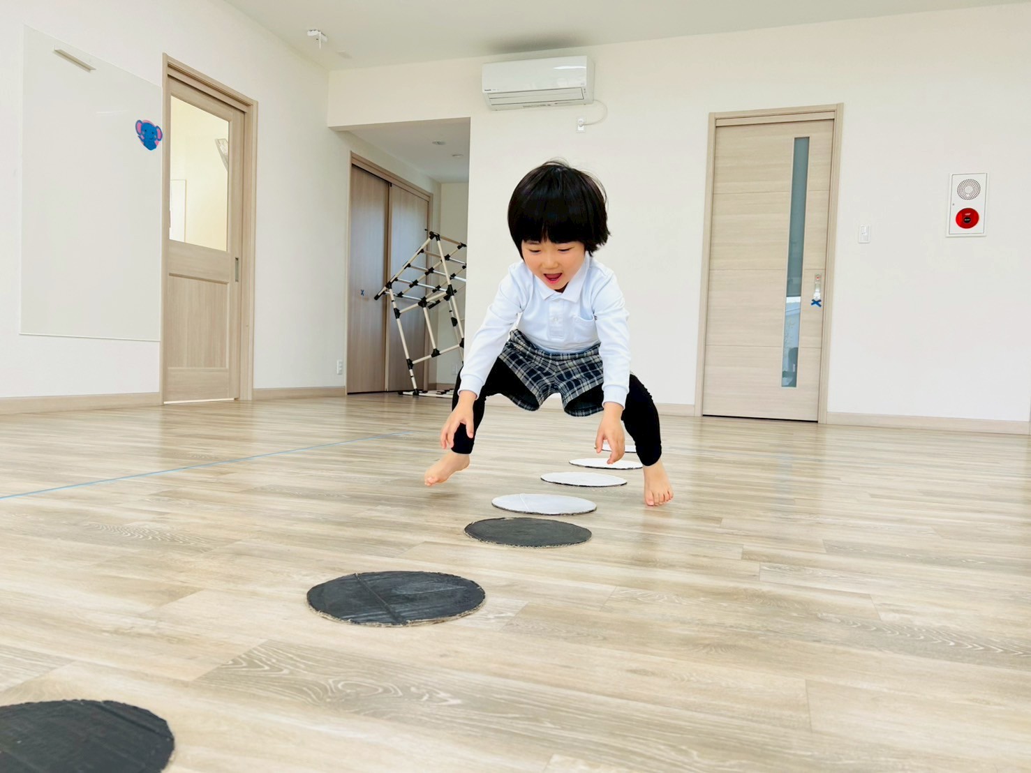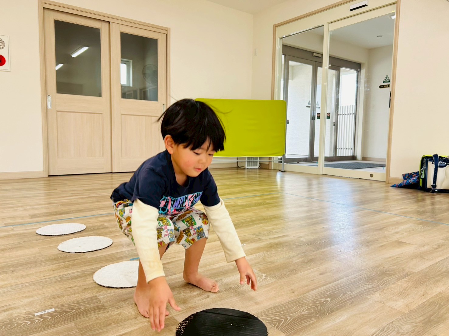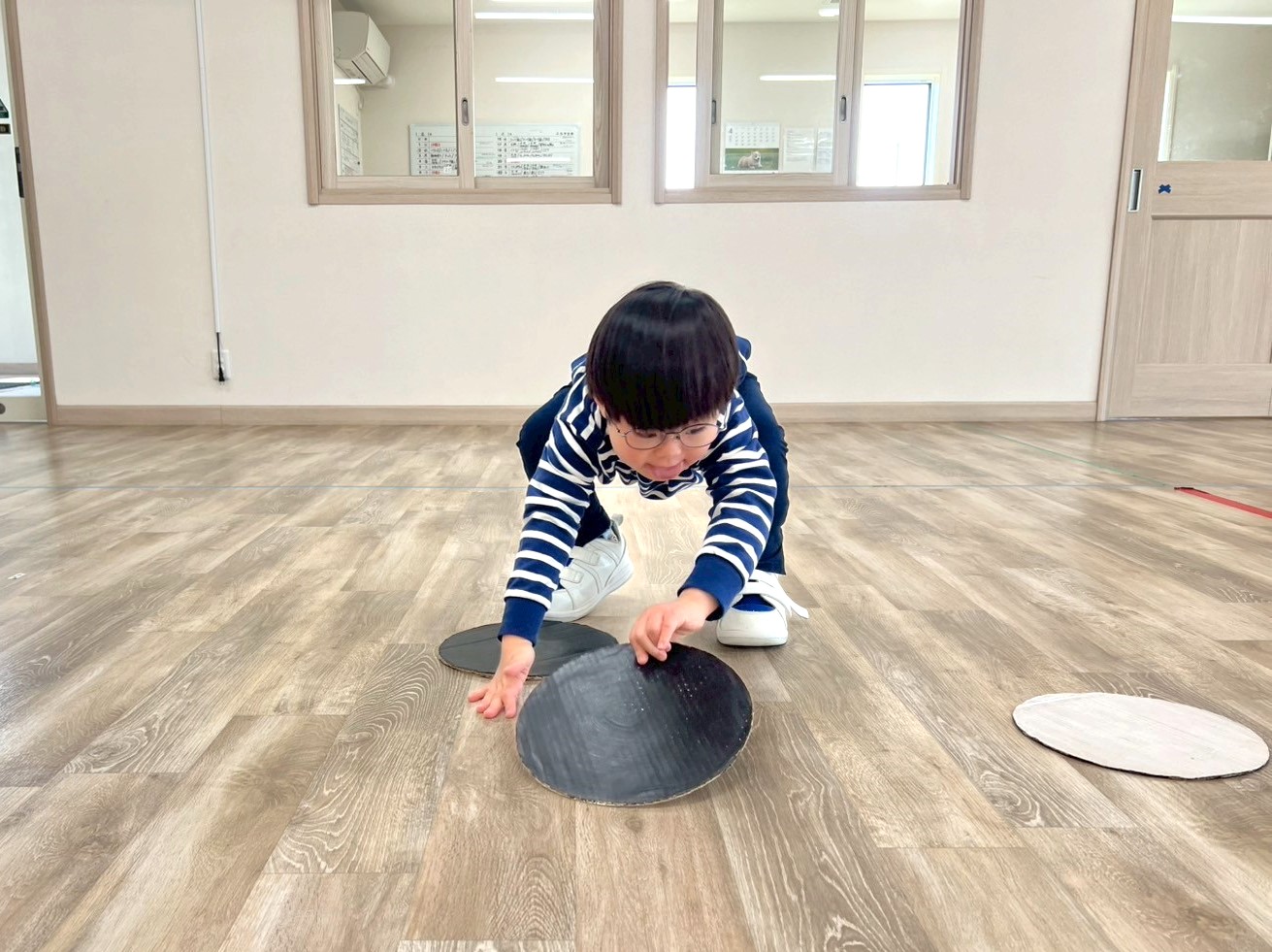 段ボールで作られたオセロを使って、ひっくり返し競争を行いました。 一列に並べたオセロをひっくり返して進む競争では、腰を低くして勢いよくオセロを返しながら前に進む様子が見られましたよ! ホール全面に広げられたオセロを、自分の担当の色を裏返す競争では、素早く移動して裏返すことができていました! 勝敗が付くと両手を挙げて喜ぶ子も悔しくて涙が出る子もいます。 それでも何度も何度も挑戦して全員が一度は勝負に勝つことができました! 悔しくても最後まで頑張る子どもたちの姿はかっこよかったですよ♪