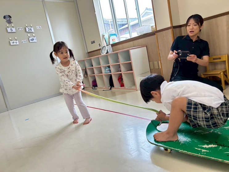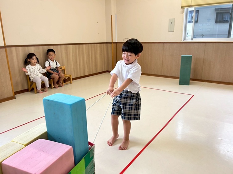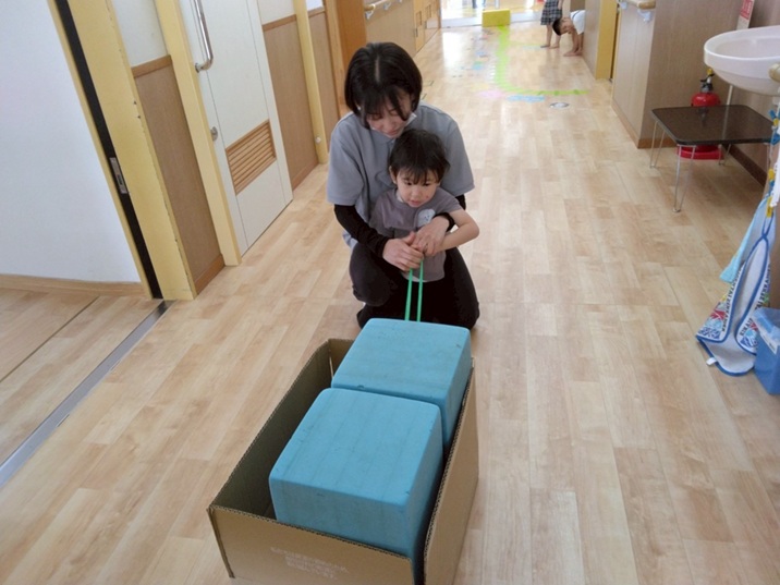 今回は、重たいものを引っ張る活動に挑戦しました。 ソフトブロックの入った箱を、紐で引っ張る活動で、 両足で踏ん張りながら、一生懸命引くことができました。 「もっと重くしてみたい!」「僕も箱に入れてみたい!」と、 どんどん重たい箱を引くことに挑戦する姿が見られました! 最後はお友だちをボディボードに乗せて引っ張り、 笑顔で活動に取り組むいぬ・くまグループさんでした☆