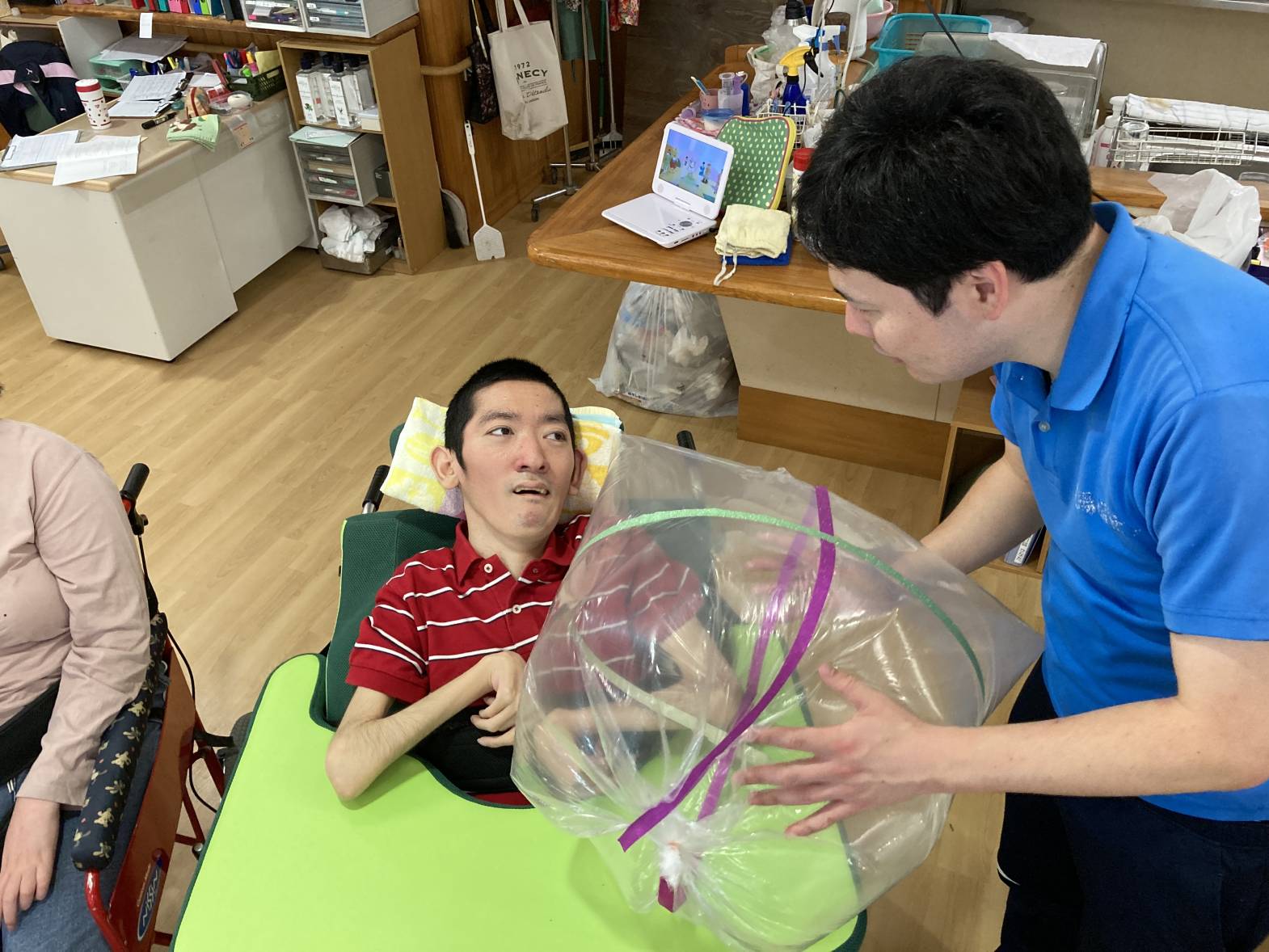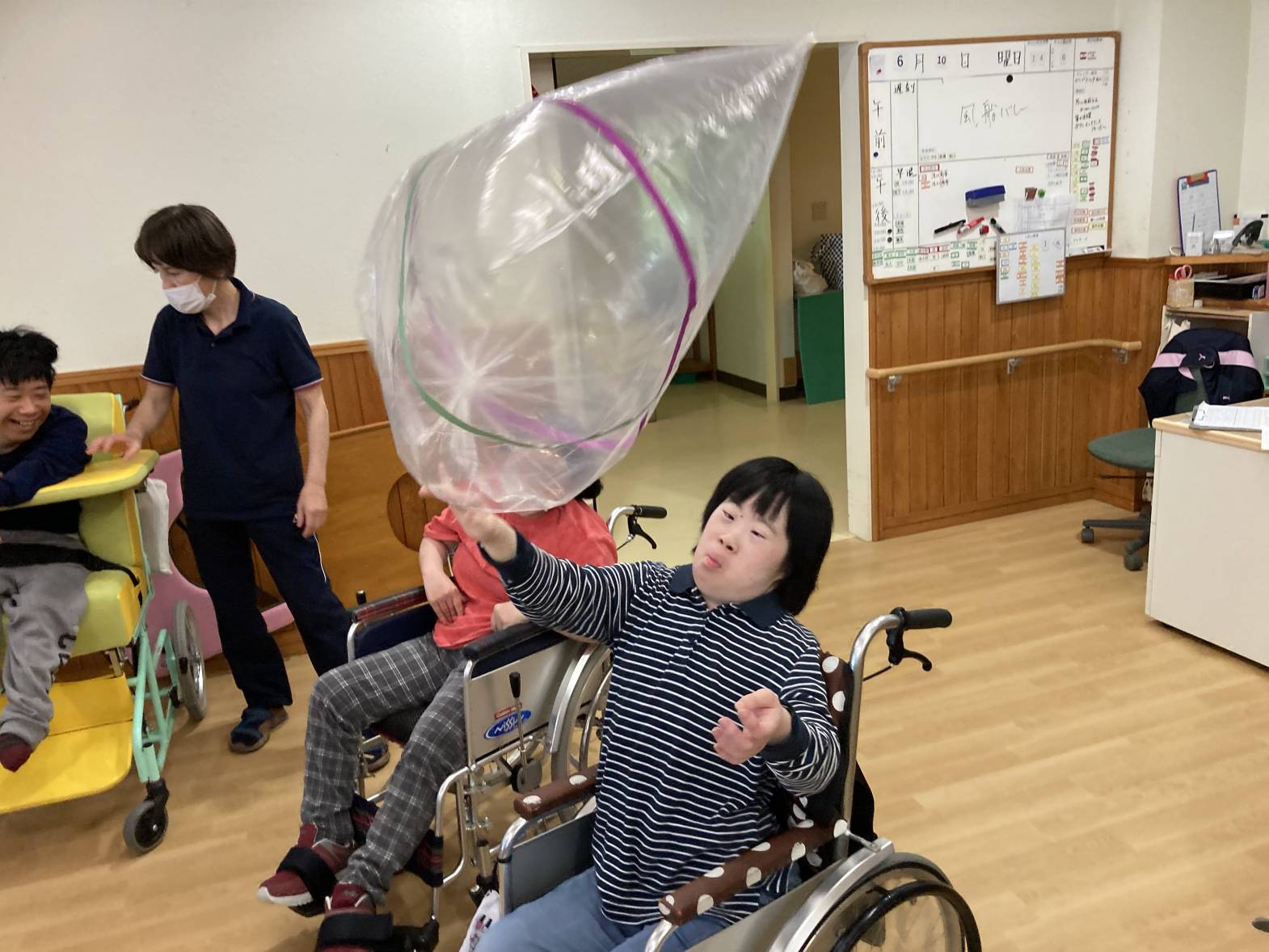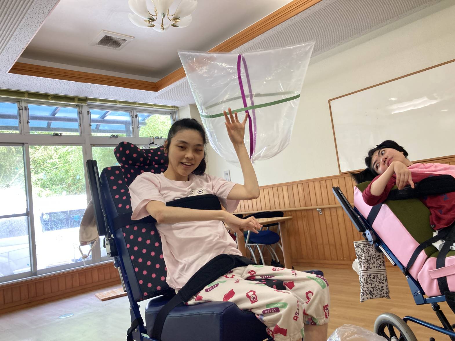 今日はレクリエーション活動で風船バレーを行いました。 今回はいつもの風船ではなく、ビニール袋を使ってみました! 柔らかな感触と、ふわっと浮かぶ様子がとても楽しいですね! 風船と違って、割れてもびっくりしないのもいいですね! 割れても大きな音がしない! と、いうことで今回の活動では思いっきりアタックをしたり、掴んだり投げたり色々な楽しみ方をされておりました。 連日、雨の日が続きますが、室内活動でじめじめした気持ちが吹き飛ぶくらい楽しんでいきましょう!
