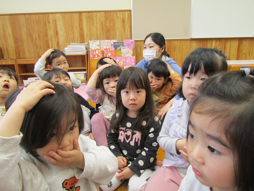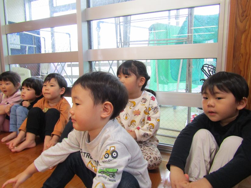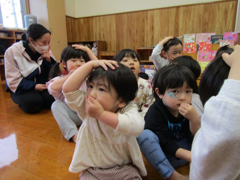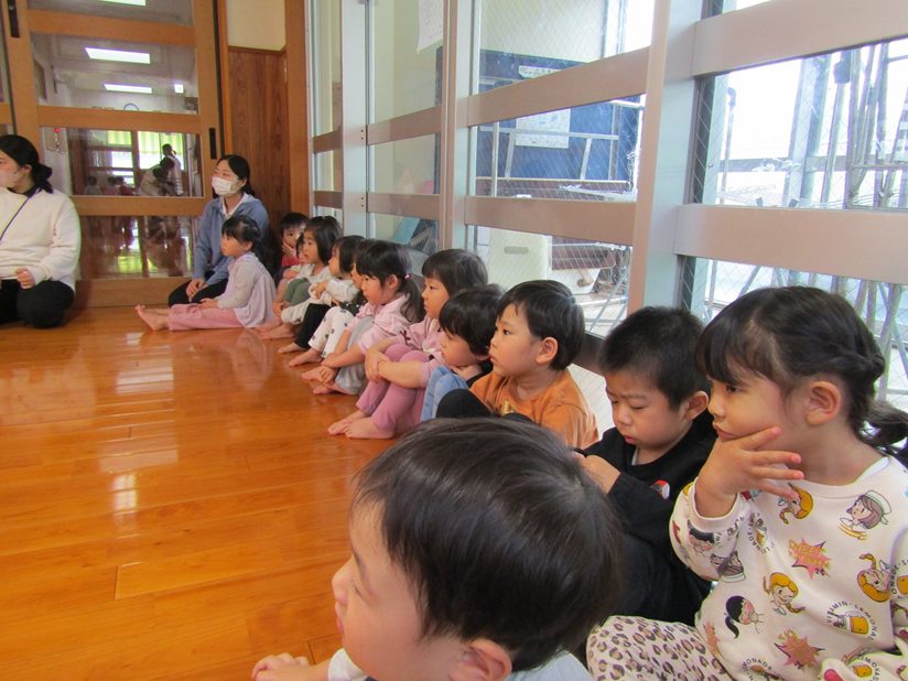 今日は防災訓練がありました。 放送が鳴ると静かに話を聞いて集まることができた子どもたち。 普段の防災訓練が身についており、自ら口や頭を押さえる姿も! 「おかしもち」の問題には積極的に手を挙げて答えるぱんだ組さん。 みんな上手に避難することができました!