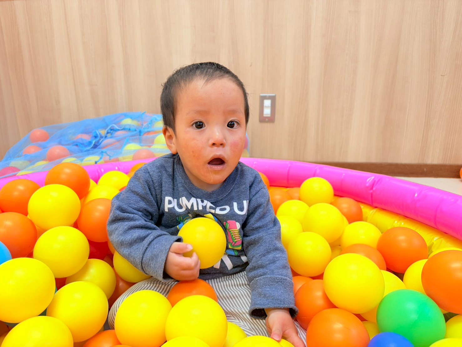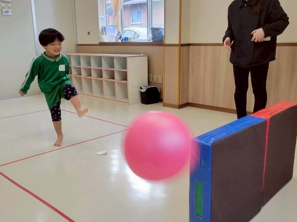 ボール遊びの活動で、ボールプールやピラティスボールを使って遊びました。 ボールプールでは、たくさんのボールに少し驚いた表情を浮かべる姿も見られましたが、職員とかかわりながら遊ぶことで徐々に表情が和らいでいく子どもたち! ピラティスボールの活動では、ボールを蹴る練習にも挑戦し、的を狙って勢いよく蹴ることができましたよ☆