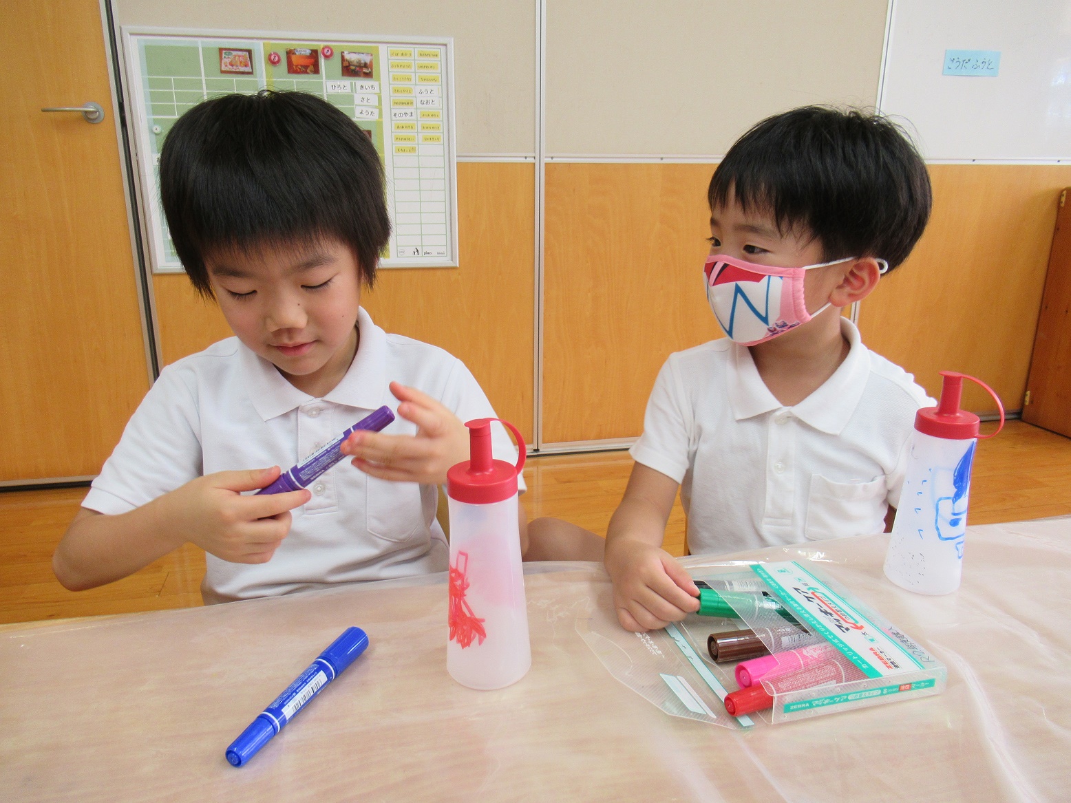 7月に入り、きりん組さんでは水遊びが始まりました。 早速、水遊びで使う水鉄砲を作ることにしたきりん組さん。 調味料を入れる容器に自分たちで好きな絵を描いたり、色を塗ったりしてオリジナルの水鉄砲を作ります。 「一緒にピンク色にしよう♪」「何描いた?」と友だち同士で会話を弾ませながら、思い思いに取り組む子どもたち。 完成すると、「早く水遊びで使いたいな!」「待ちきれないなぁ~。」と次の水遊びを楽しみにする姿が見られました。 次の水遊びの日には、是非子どもたちに話を聞いてみてください♪