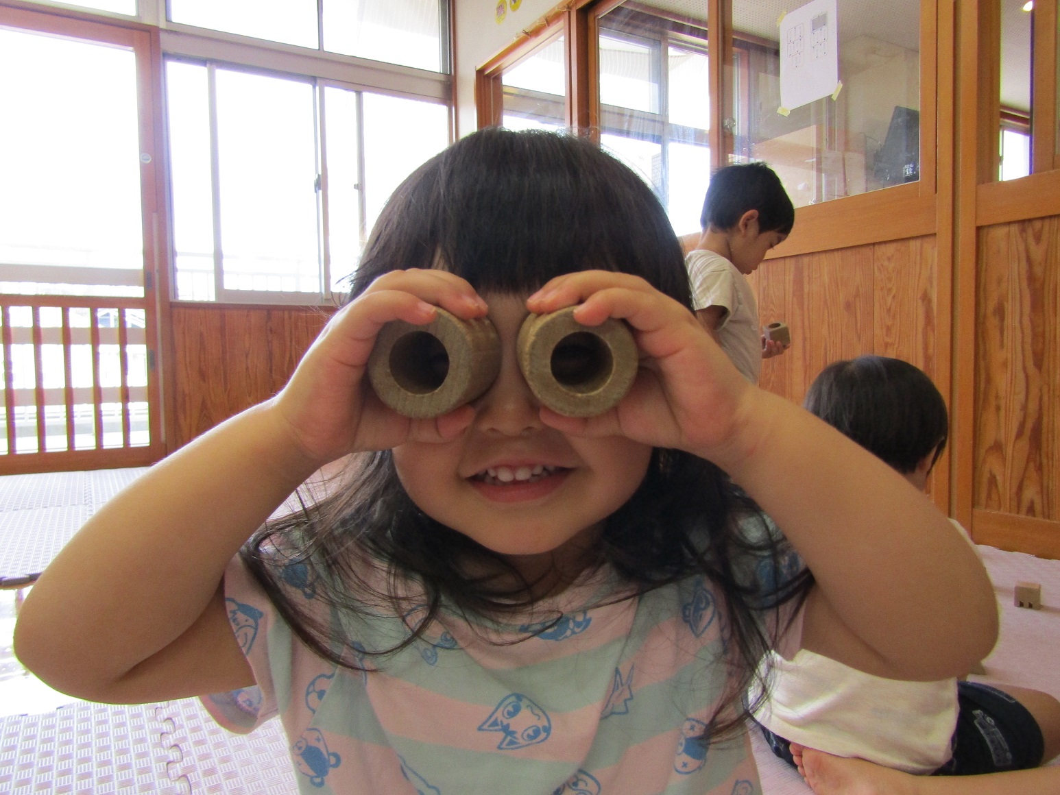 先日、初めて積み木で遊びました。 初めて見る玩具に興味深々の子どもたち。 「丸がある!」「これは、穴が開いているね!」と、 色々な形があることを発見しました。 望遠鏡のようにして穴を覗いたり、様々な形を組み合わせて高く積み上げたりと、思い思いに遊び込む、ぱんだ組さん。 また、友だちと協力して家やロボットを作る姿も見られました。 今後も様々な玩具を通して、手先を使ったり、友だちと一緒に遊んだりすることができるようにしていきたいと思います。