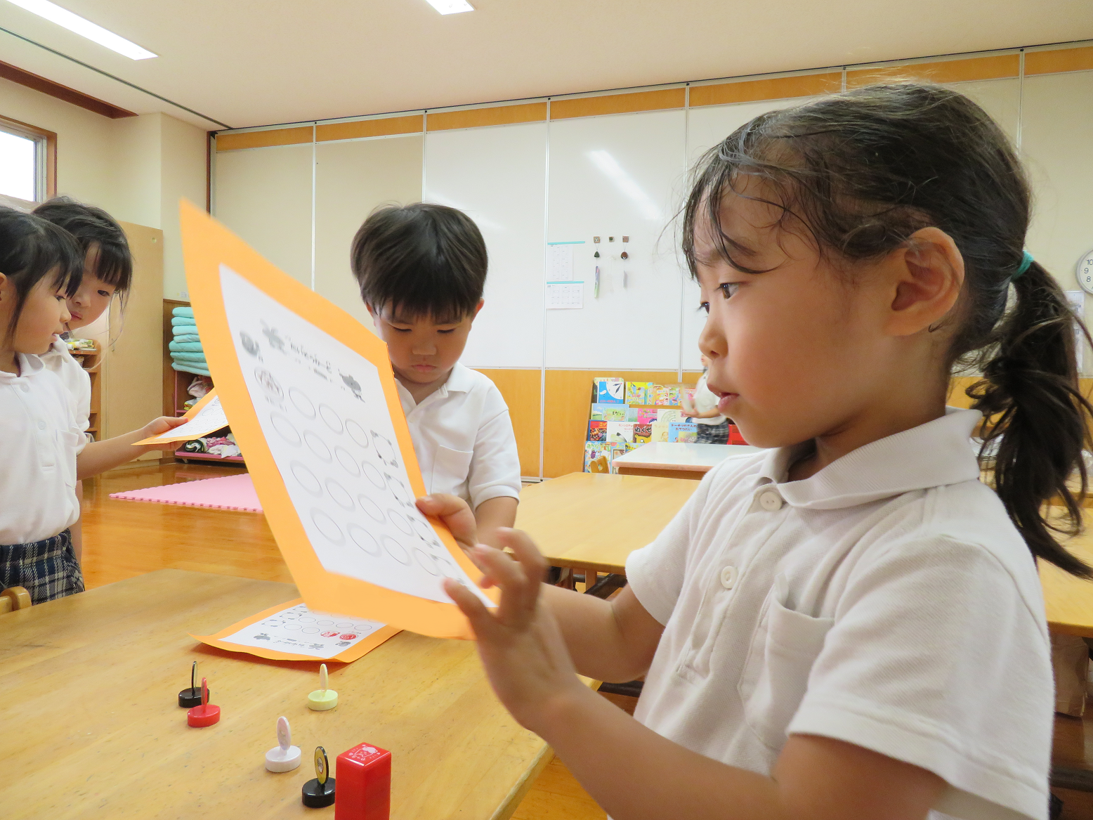 今週から『たいそうカード』を取り入れ、朝の集まりで体操を頑張ったらスタンプをしています。 体操が終わると自分たちのたいそうカードを棚から持ってきて並び、自分の番が来ると「今日はどのスタンプにしようかな?」「スタンプ1つ目!」などスタンプを選んだりスタンプの数を嬉しそうに数えたりする子どもたち。 「明日も体操頑張ってスタンプもらうんだ!」「明日はうさぎさんのスタンプにしようかな?」と次の体操にも今まで以上に意欲をのぞかせるうさぎ組さんです。