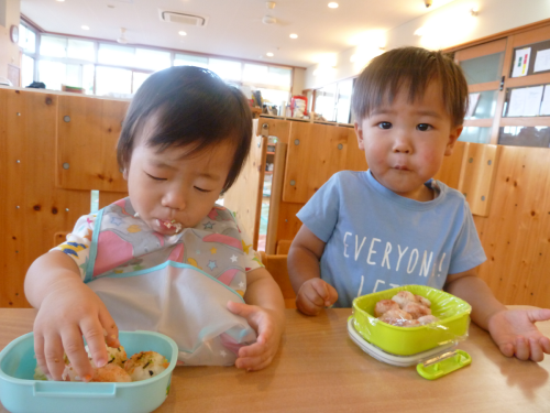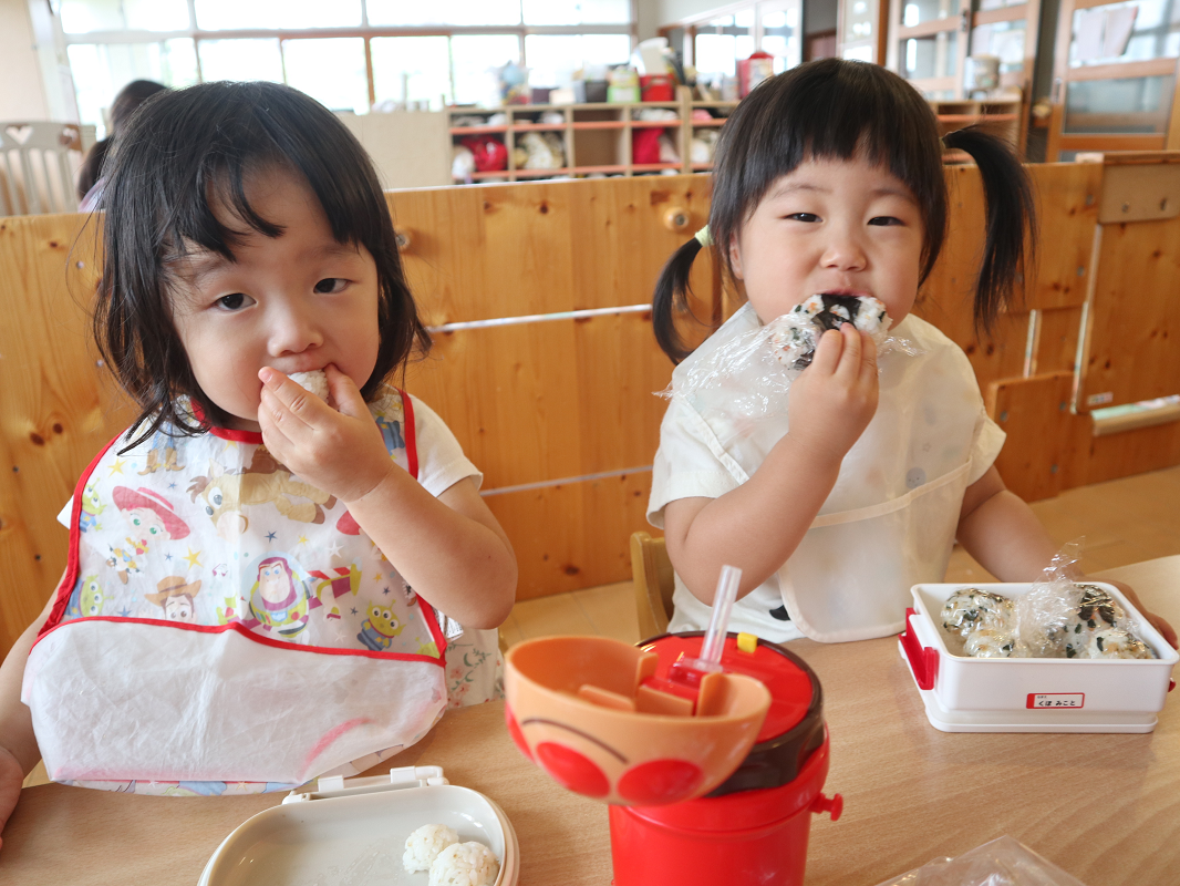 今日はおむすびの日でした。お弁当箱を目の前に置くと、しっかり待つことができる子どもたち。みんなで「いただきます!」と手を合わせると、「あっ、ミッキー!」、「おいしそう!」と嬉しそうに話をするこあら組さん。 保育者が「おいしい?」と聞くとにこっと笑ったり、「おいしい!」とパクパク食べたりする姿が見られました。 お忙しい中、おむすびのご準備ありがとうございました。