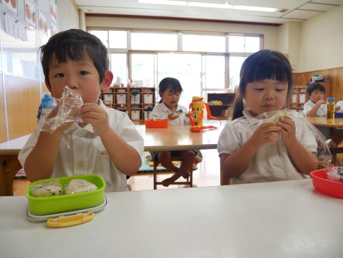 「鮭の味がするよ!」「私は卵の味がする。」と、友だち同士で話しながら笑顔で食べ進めていたりす組さんです。