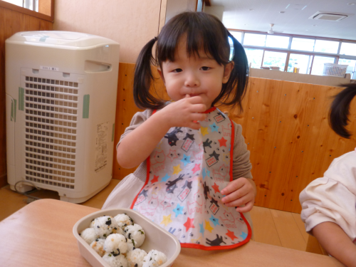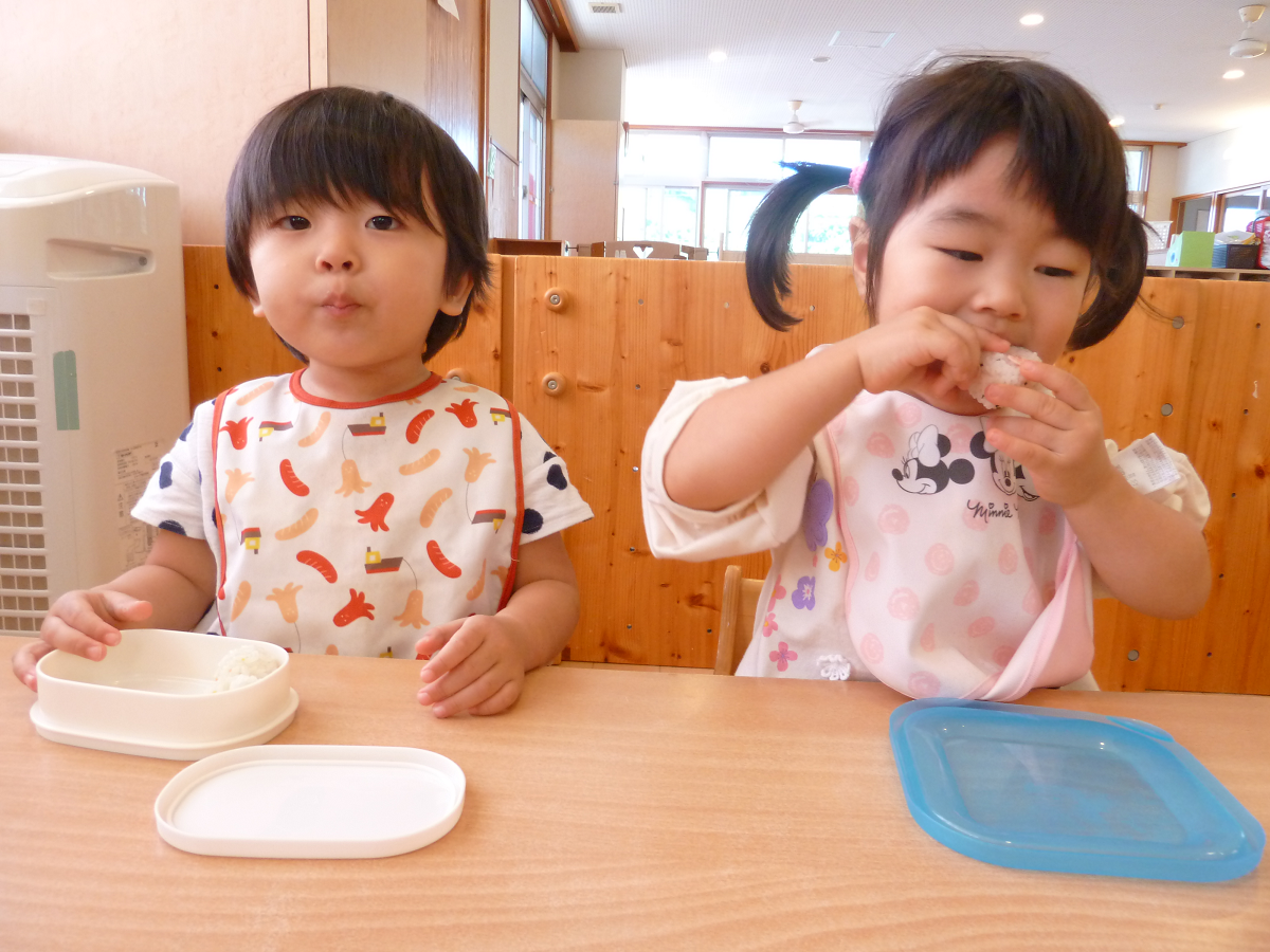先週は子どもたちが大好きなおむすびの日がありました。 おむすびの時間になると嬉しそうにお弁当袋を開け嬉しそうな表情を見せる子どもたち。 「おい「大きいね!」「おいしい!」と子どもたち同士で話をしながらおむすびを食べ進めていき、あっという間に完食するこあら組さん。 最後は元気よく「ごちそうさまでした!」と挨拶をして満足そうな姿が見られました!