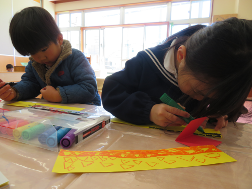 出来上がった豆入れを見ながら、「豆まきの日ちょっとこわいな。」「鬼やっつけるぞ!」と節分会に向けて少し緊張した様子の子、気合十分立ち向かう日を楽しみにしている子と様々な心境を覗かせるうさぎ組さんです。
