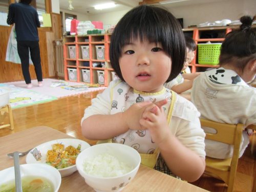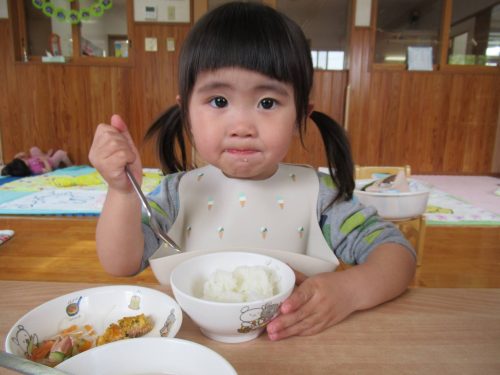 子どもたちの大好きな給食の時間! 手を合わせて「いただきます!」をすると、スプーンを握り食べ進めていきます。 「にれ何?」、「にんじんだね!」と食材に興味を示す子どもたち! おかずや汁物を大きな口で食べ進め、完食すると笑顔いっぱいのぱんだ組さんです!