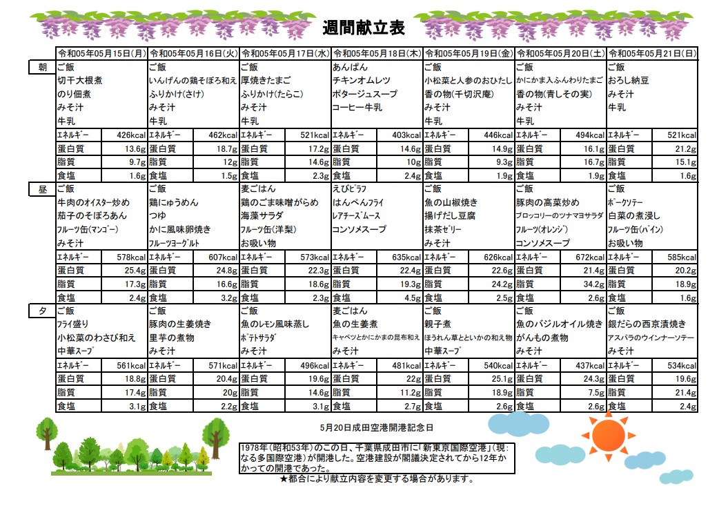 5月15日(月)~5月21日(日)の献立表になります。是非ご覧ください。