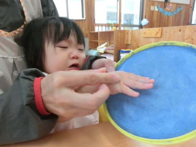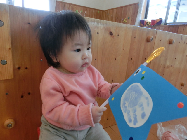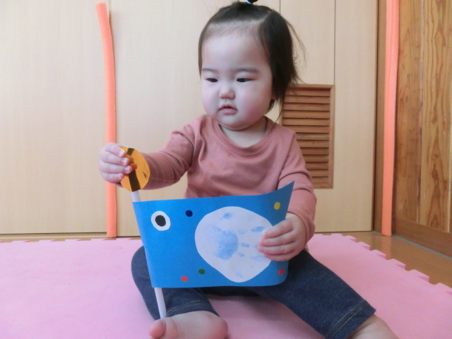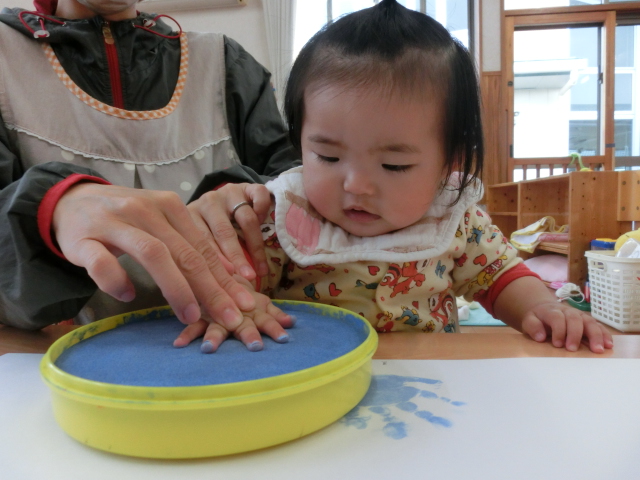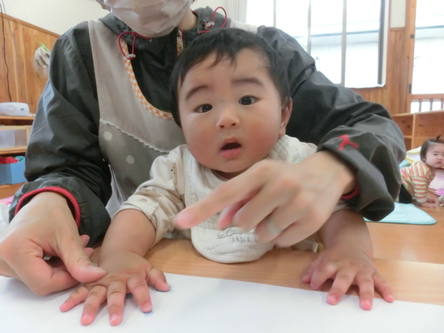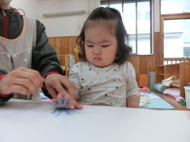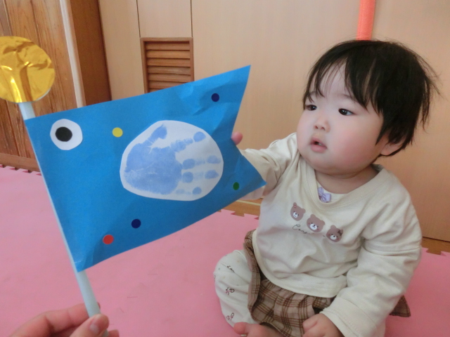 今週はこいのぼりの日に向け、こいのぼりの製作を行いました。 そこで初めての手型に挑戦したひよこ組さん! 「これは何かな?」と、不思議な表情を浮かばせたり、「冷たい!」と、びっくりしたりする様子が見られました。 一人ひとりの可愛らしい手型のこいのぼりが完成し、子どもたちに見せると、 ニコッと笑顔を見せ、優しく持ったり、手を伸ばそうとしたりする子どもたちでした♪