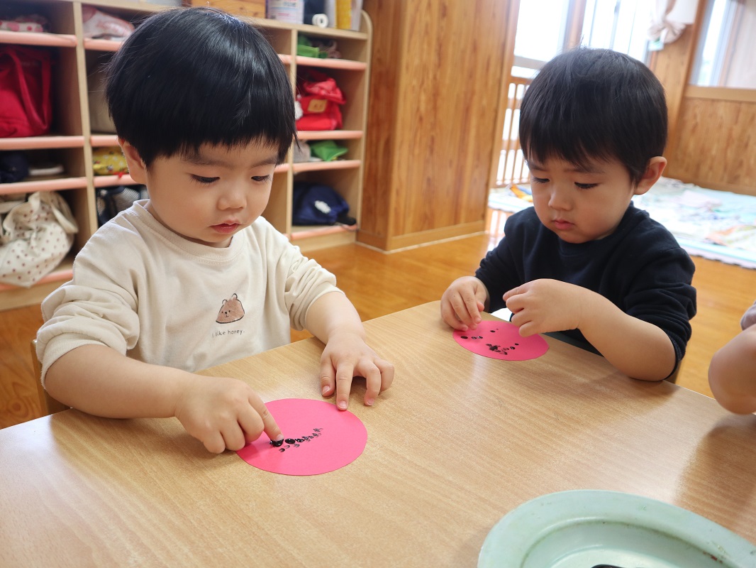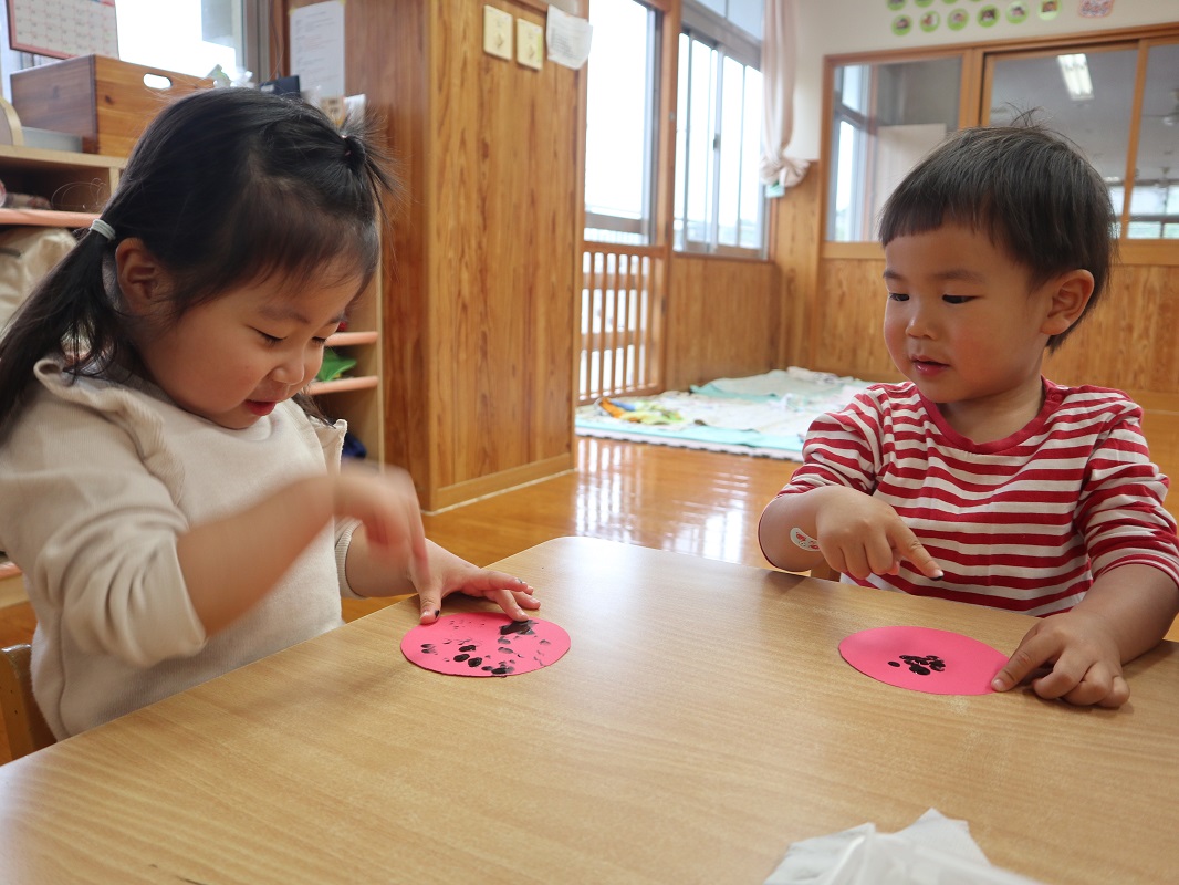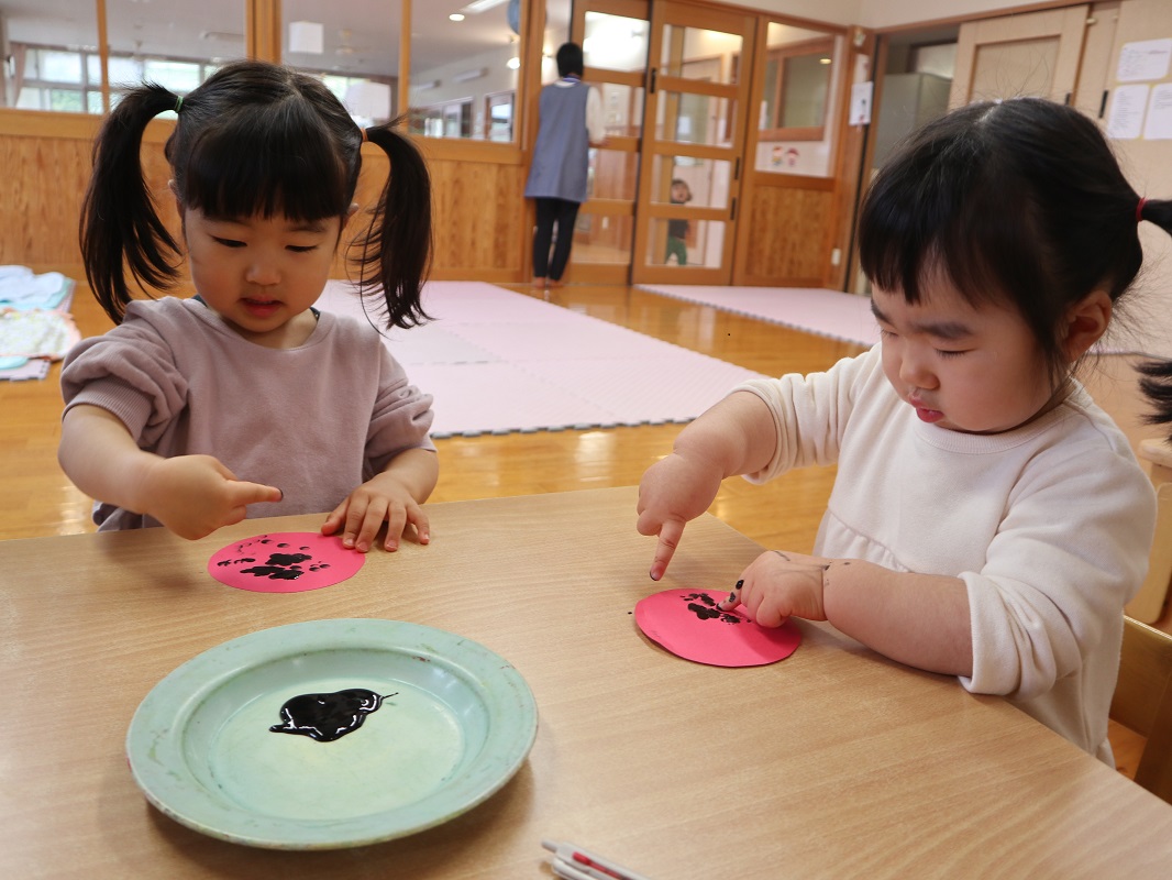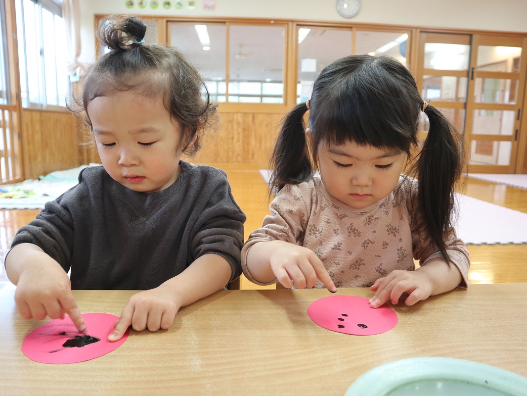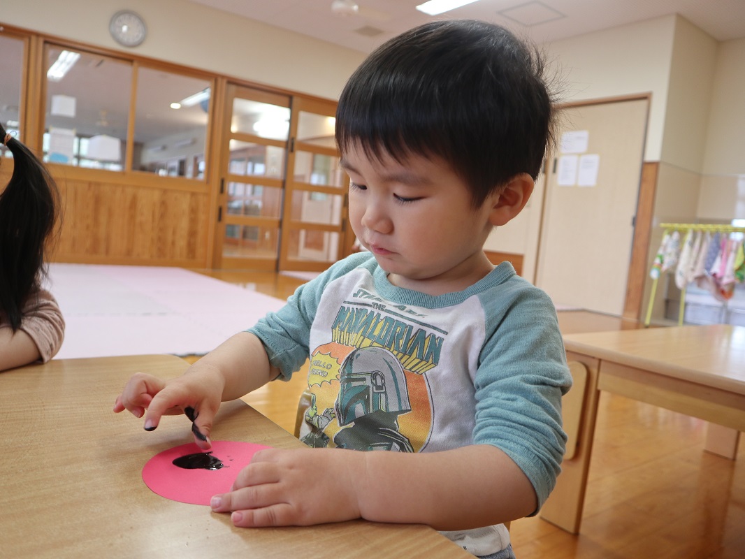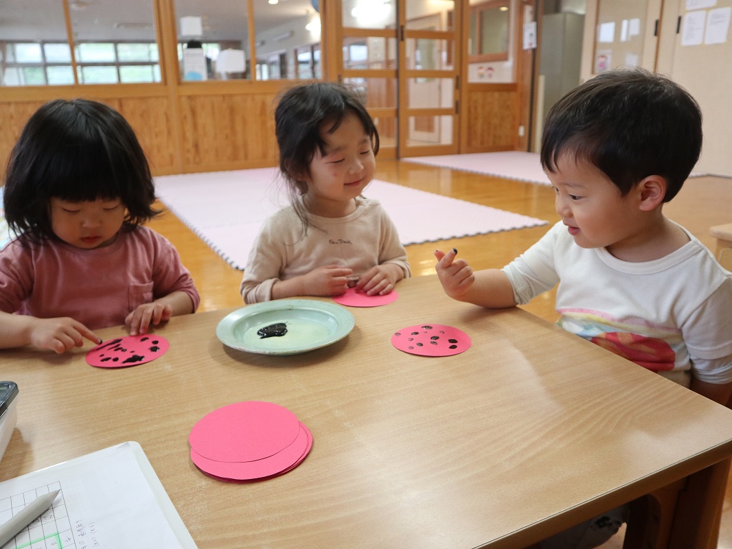 今月は、てんとう虫製作を行いました。 名前を呼ばれると「何をするのかな?」と、ワクワクした様子で机に向かう子どもたち。 画用紙を貰うと、さっそく黒い絵の具を指にとって、ペタペタとてんとう虫の背中の模様をつけて楽しんでいきます。 思う存分ペタペタしたら、「みてみて!」「先生できたよ!」と、嬉しそうに教えてくれる姿が見られました。