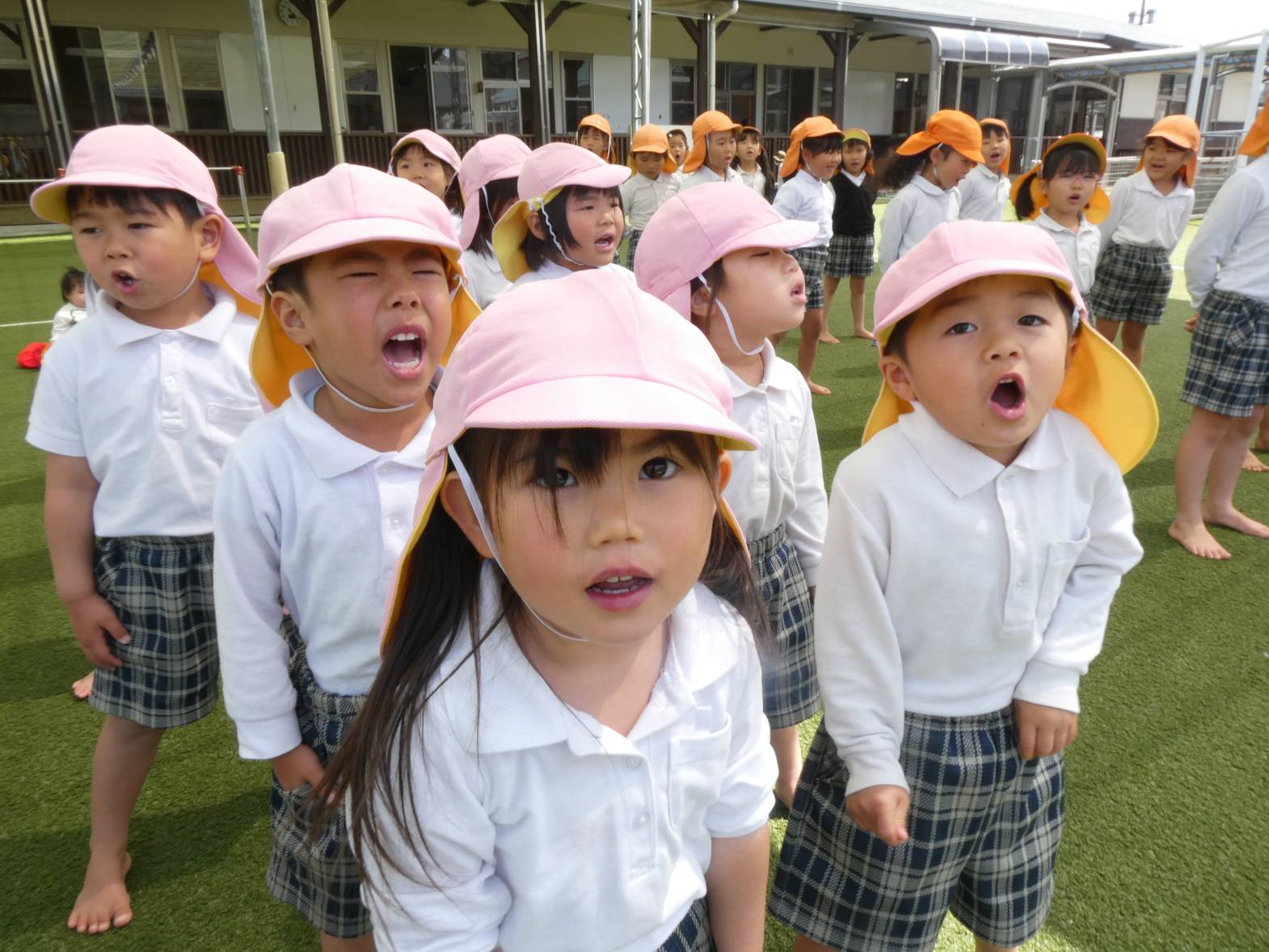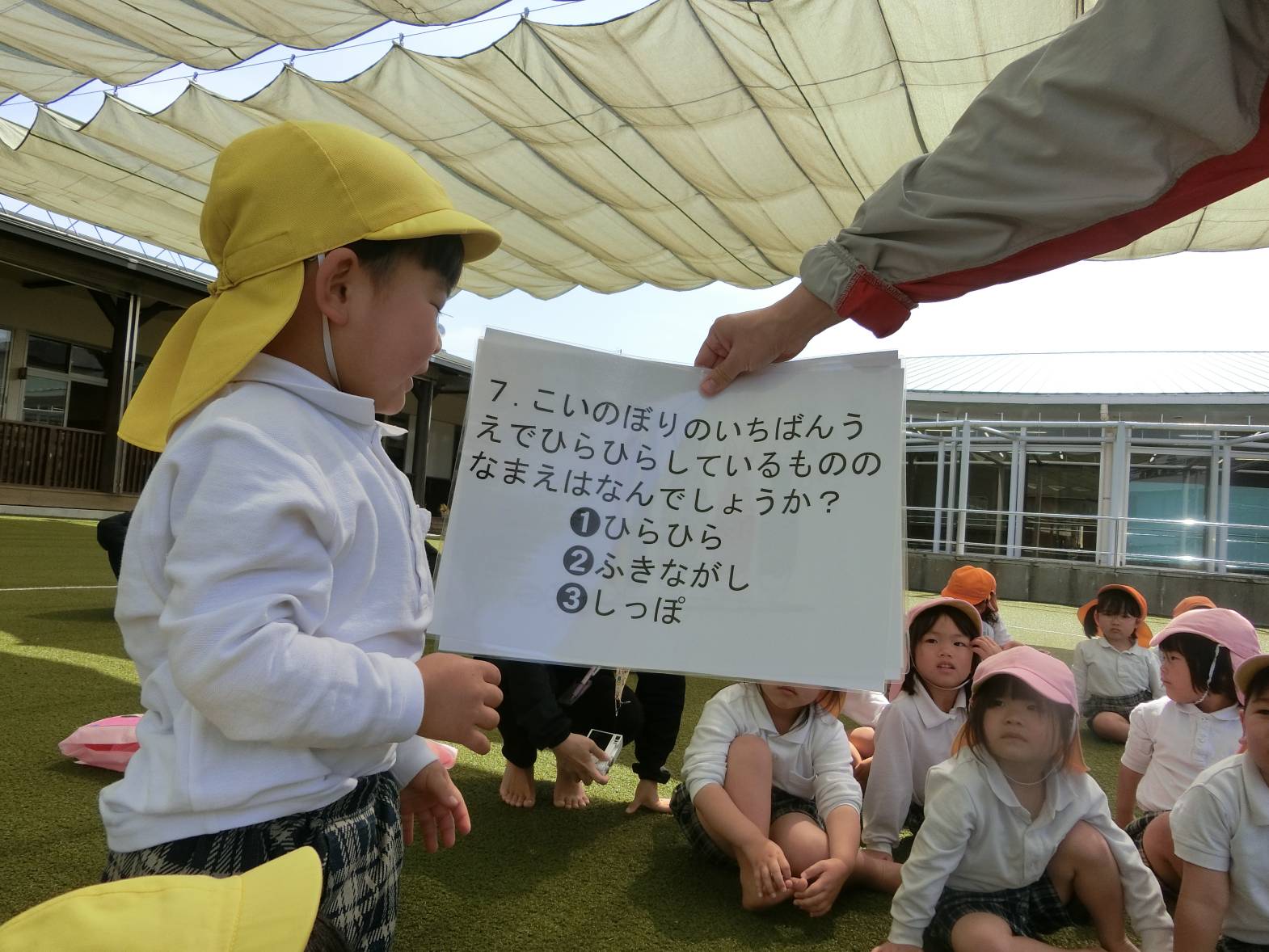 園庭に揚げてあるこいのぼりを見ながらこいのぼりクイズに答えたり、元気いっぱいの声でこいのぼりの歌を歌ったりする子どもたち。