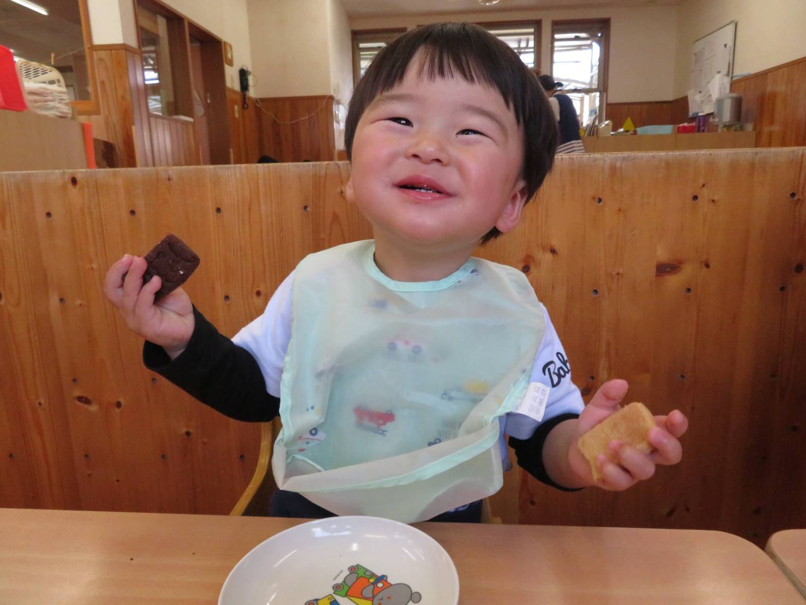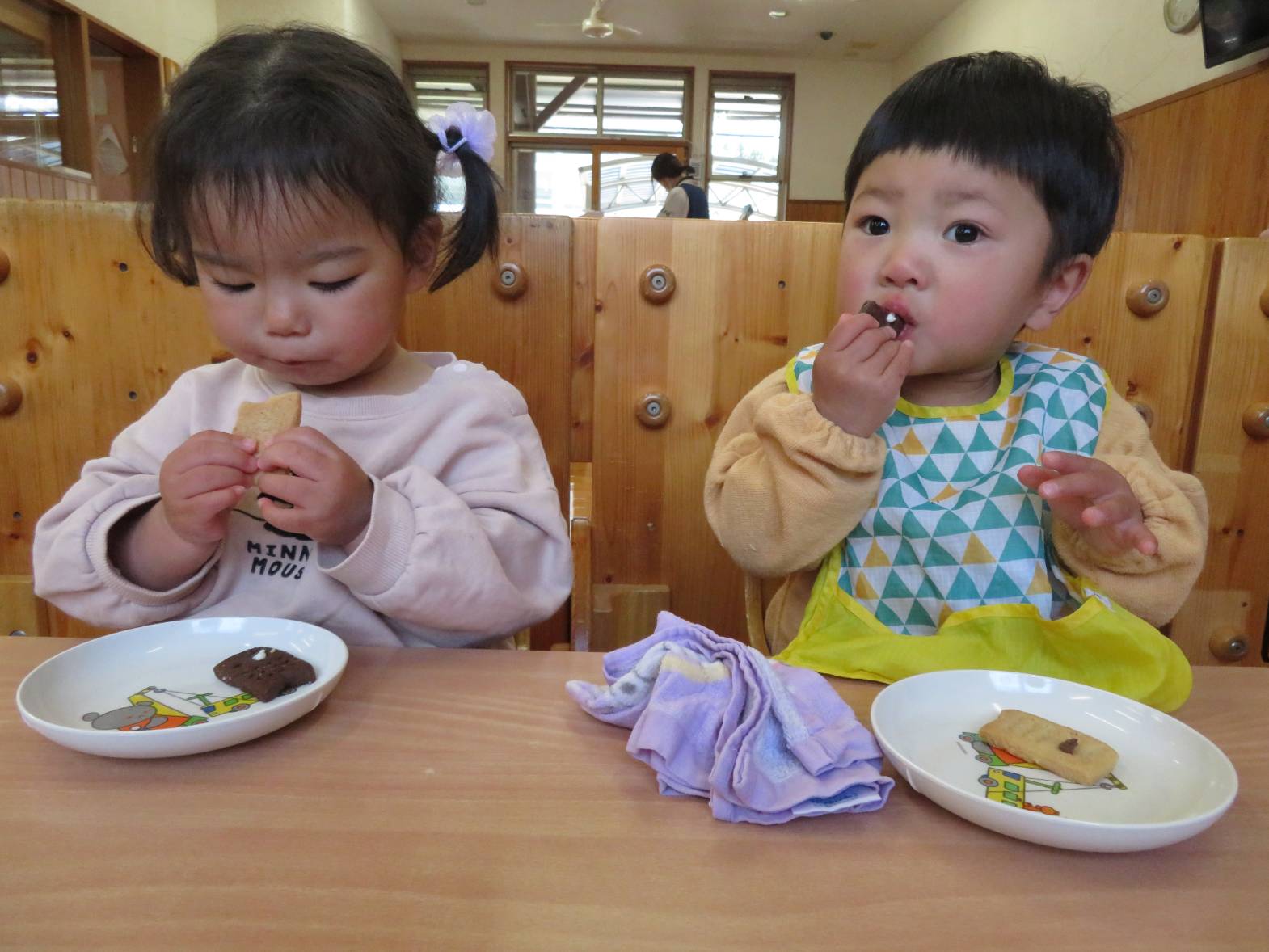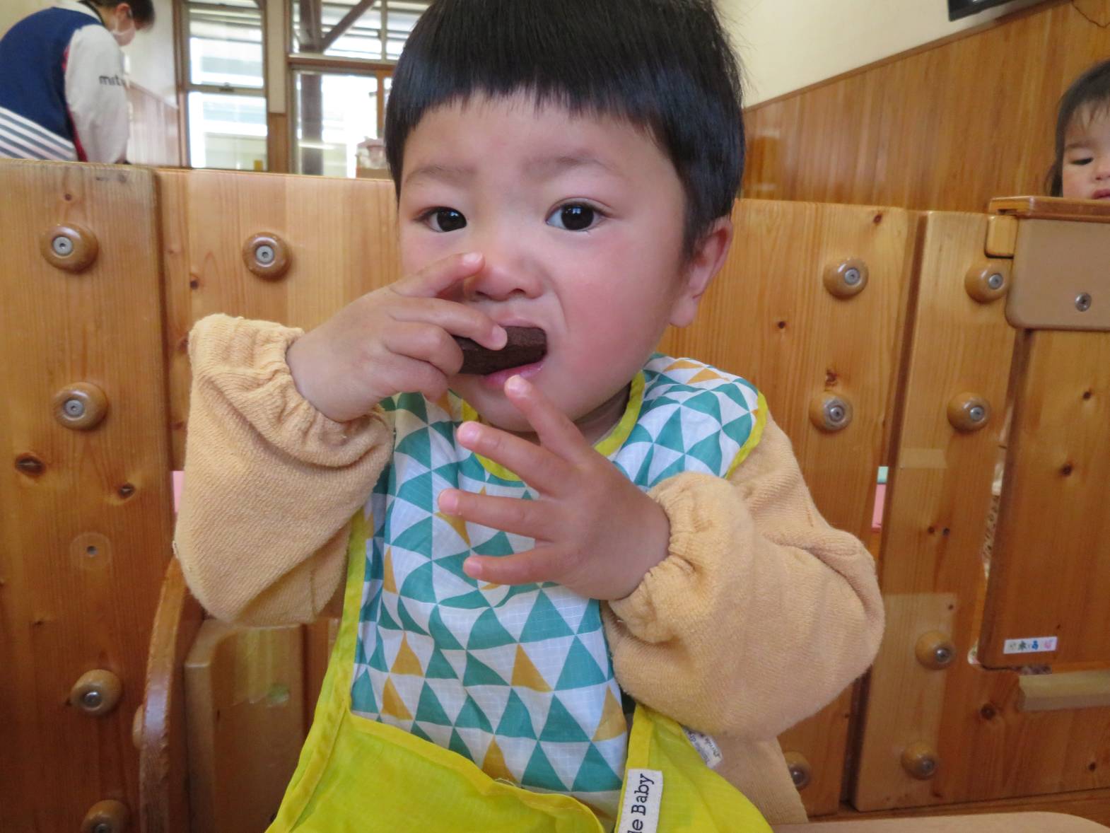 今日のおやつはこいのぼりクッキーでした! こいのぼりへの興味が高まってきている子どもたち。 「何の形かな?」と聞くと、「こいのぼり!」と答えたり、「おいしい?」と聞くと手をほっぺたに持っていき、おいしいポーズをするこあら組さん! また、外遊びでは園庭のこいのぼりを見たり、歌の時間にはこいのぼりの歌を歌ったりと、季節の行事を楽しみました♪