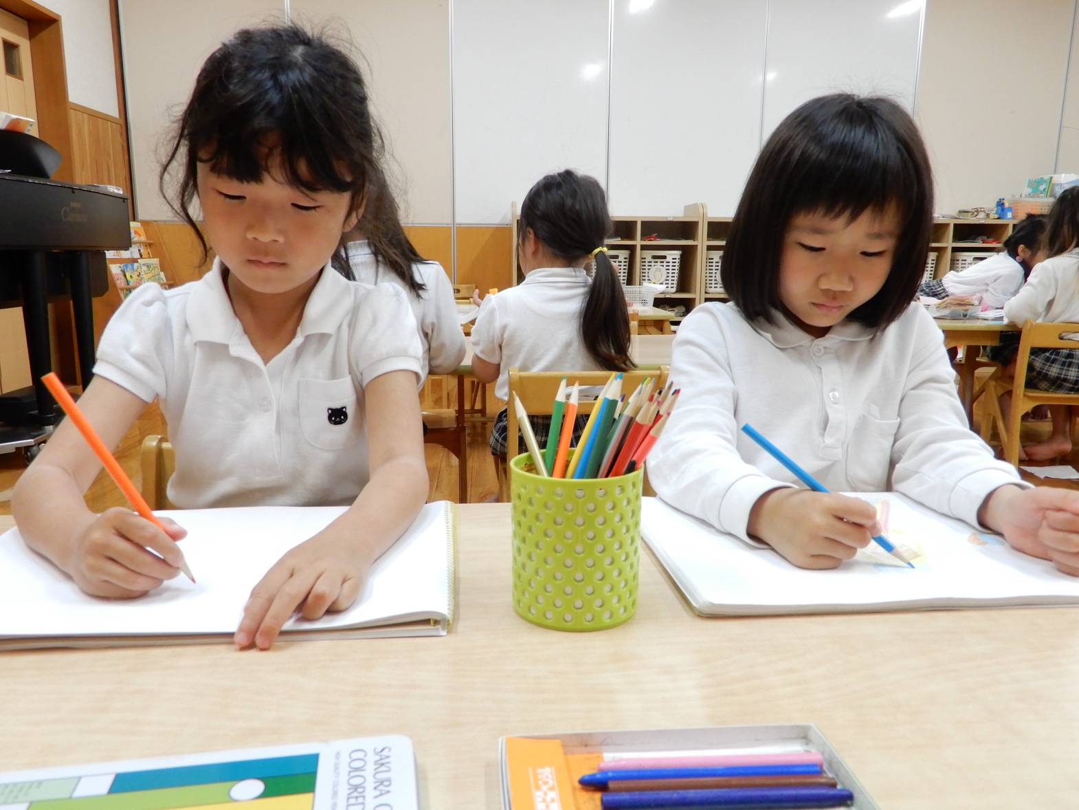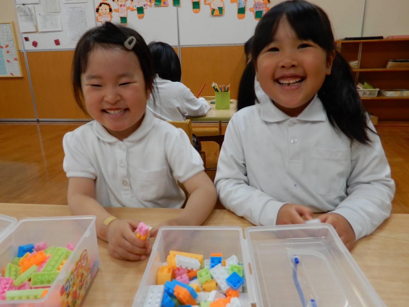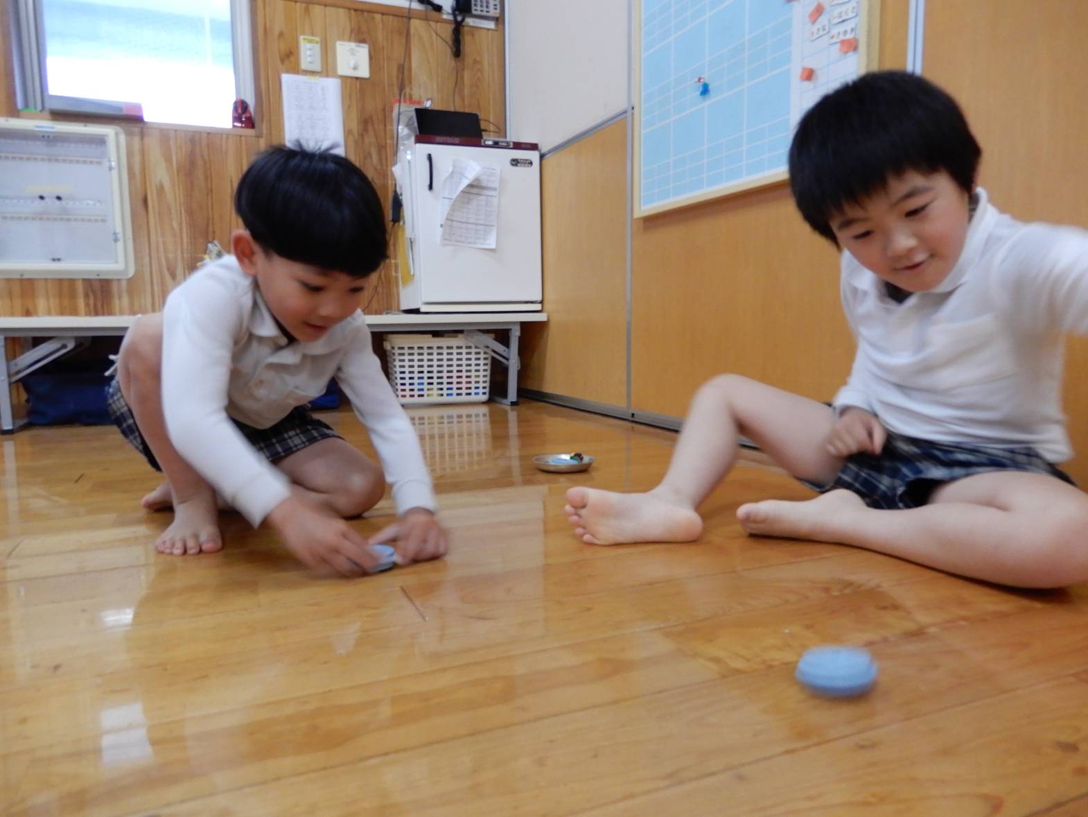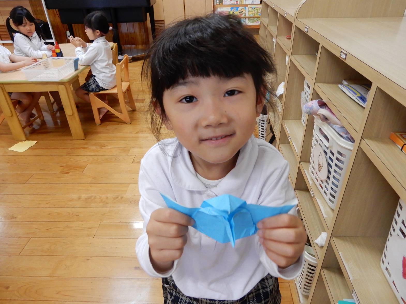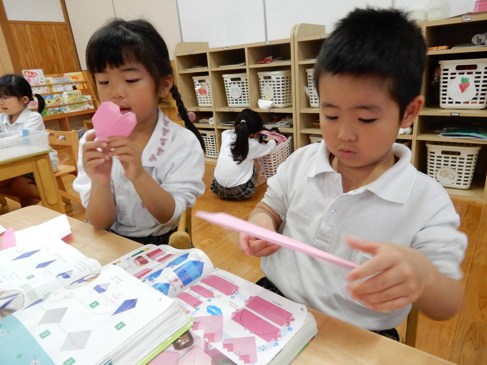 室内遊びでは、自分の好きな玩具を選び、友だちと共有して遊ぶ様子があります。 最近では、作り方の絵本を見ながら、自分の好きな物を折り紙で作ったり、塗り絵や駒作りを楽しんだりしている子どもたち! 「○○くんの駒はたくさん回るから作り方教えて!」、「僕が手裏剣作ってあげようか?」等と、友だち同士で会話を弾ませる姿が多く見られるようになってきています。 今後も子どもたちが興味のある遊びを取り入れていきたいと思います。