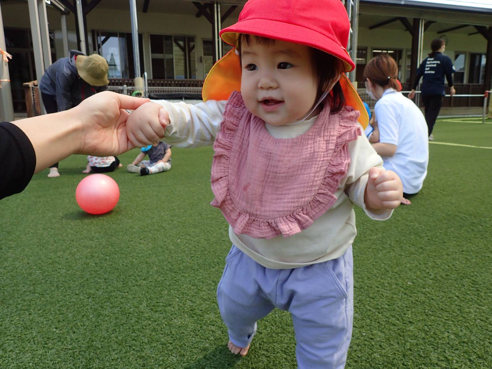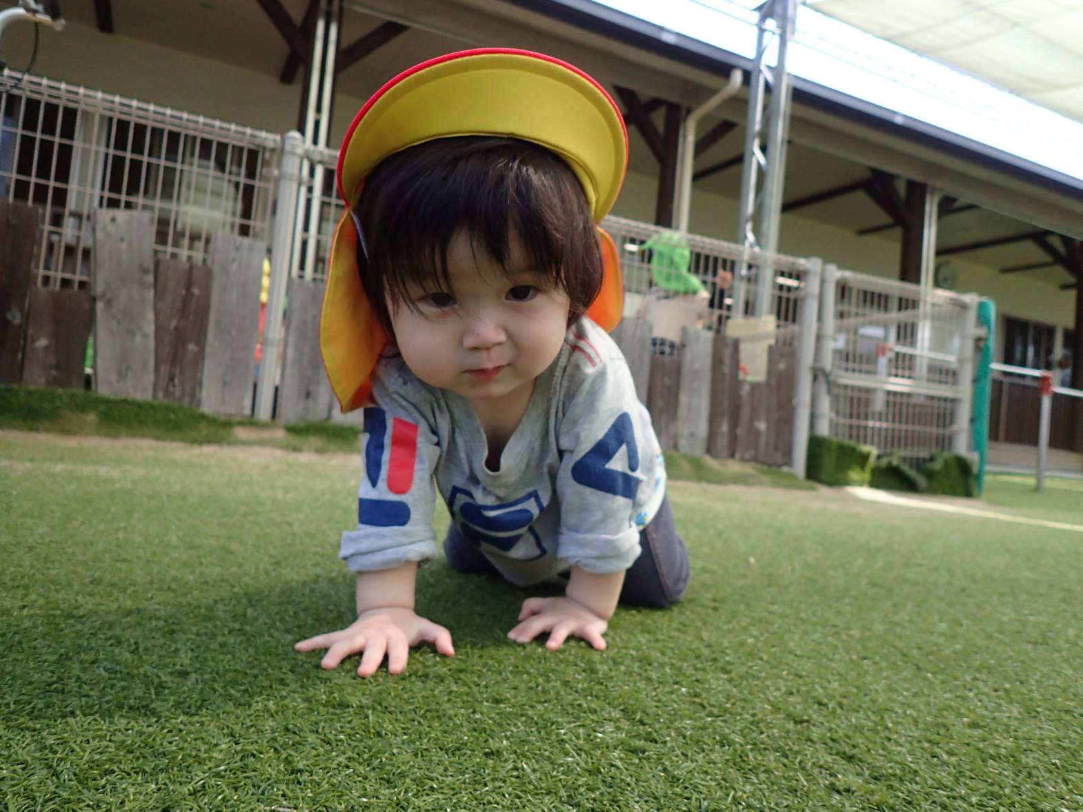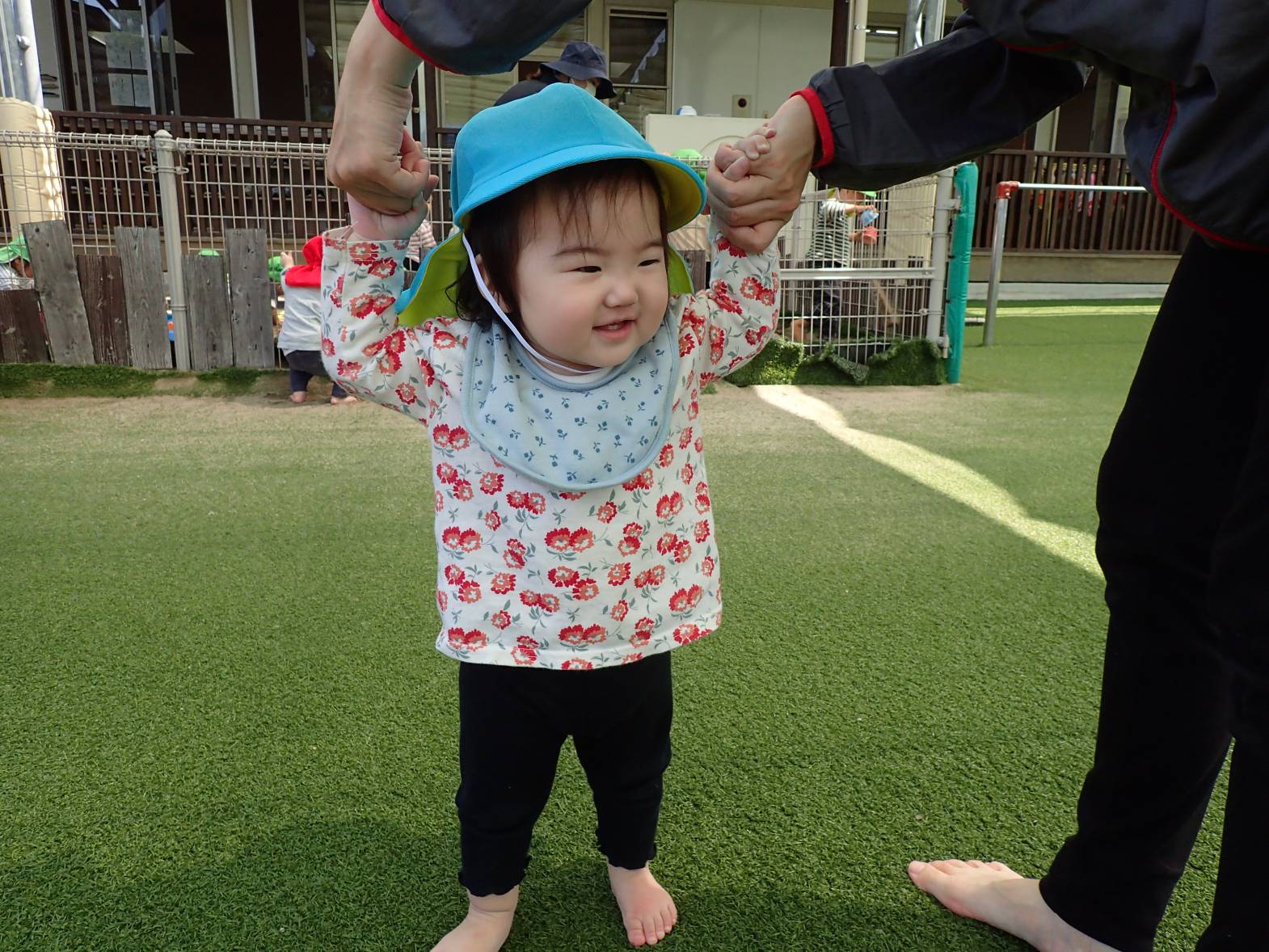 戸外へ外気浴に行きました。 少しずつ外の環境にも慣れてきて、芝生に下りると周りをキョロキョロ見渡す子どもたち。 ハイハイをしたり、手を繋いで歩いたりして探索をしました! 楽しいようで、ニコニコ笑顔が見られます。 気持ちのいい風を浴びながら過ごしたひよこ組さんでした!