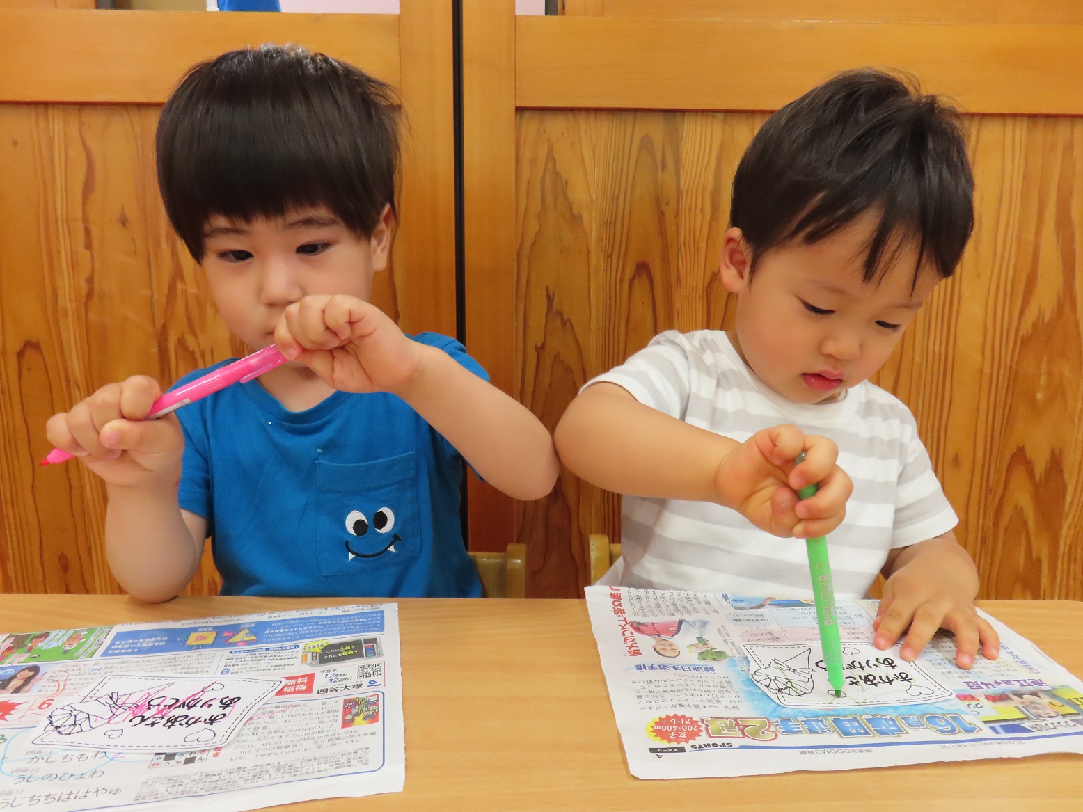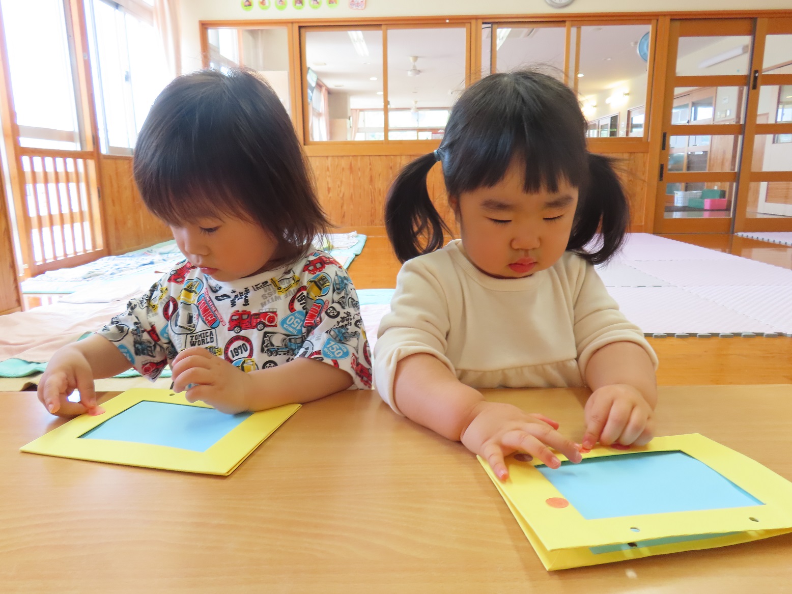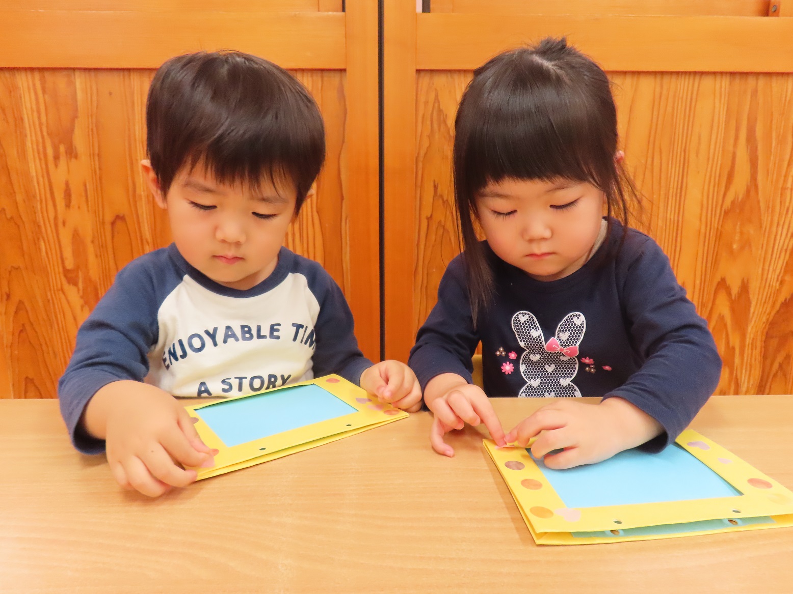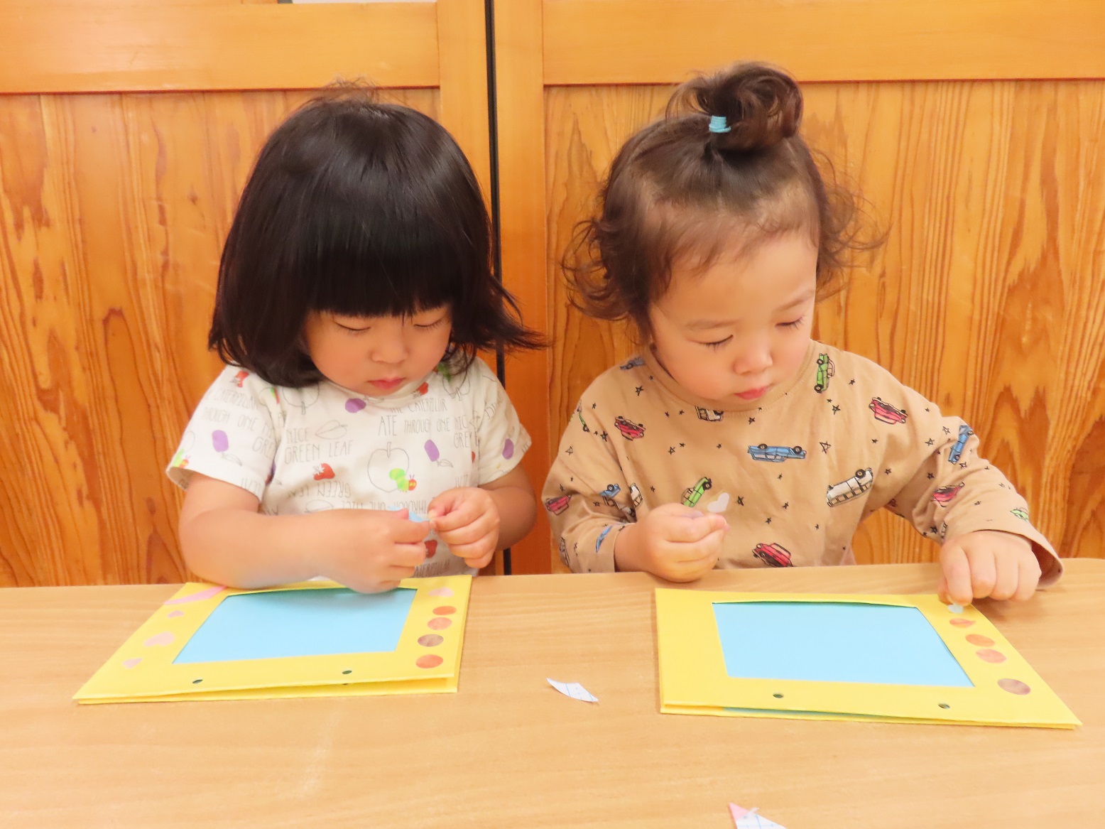 先週は、母の日ということでフォトフレーム作りを行いました。 わくわくした様子で椅子に座り、さっそくシールをペタペタ貼っていきます。 ペンで色を塗るときは、「ママはピンクが好きなの!」「青と緑にする。」と、思い思いに塗っていく子どもたち。 最後に手形を押して、オリジナルのフォトフレームが出来上がりました! 渡すときは、「ありがとうって言う!」と意気込んでいた子どもたちの姿も見られました。 ぜひ、お気に入りの写真を入れて飾ってみてください!