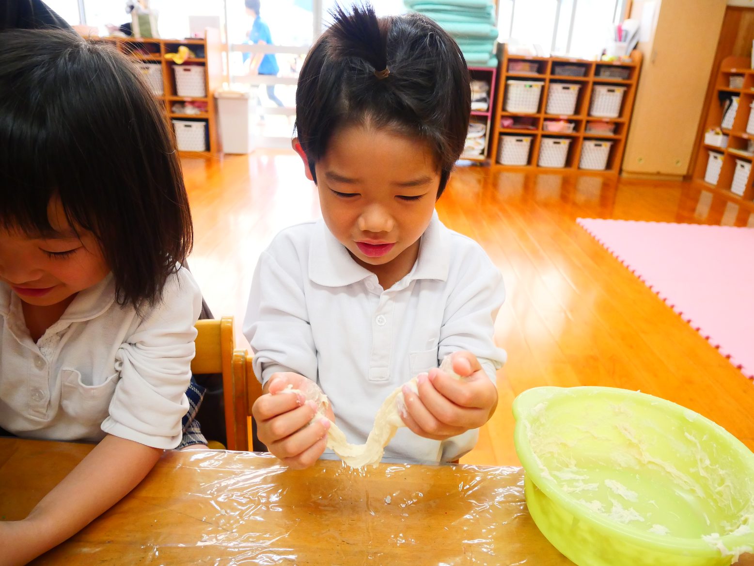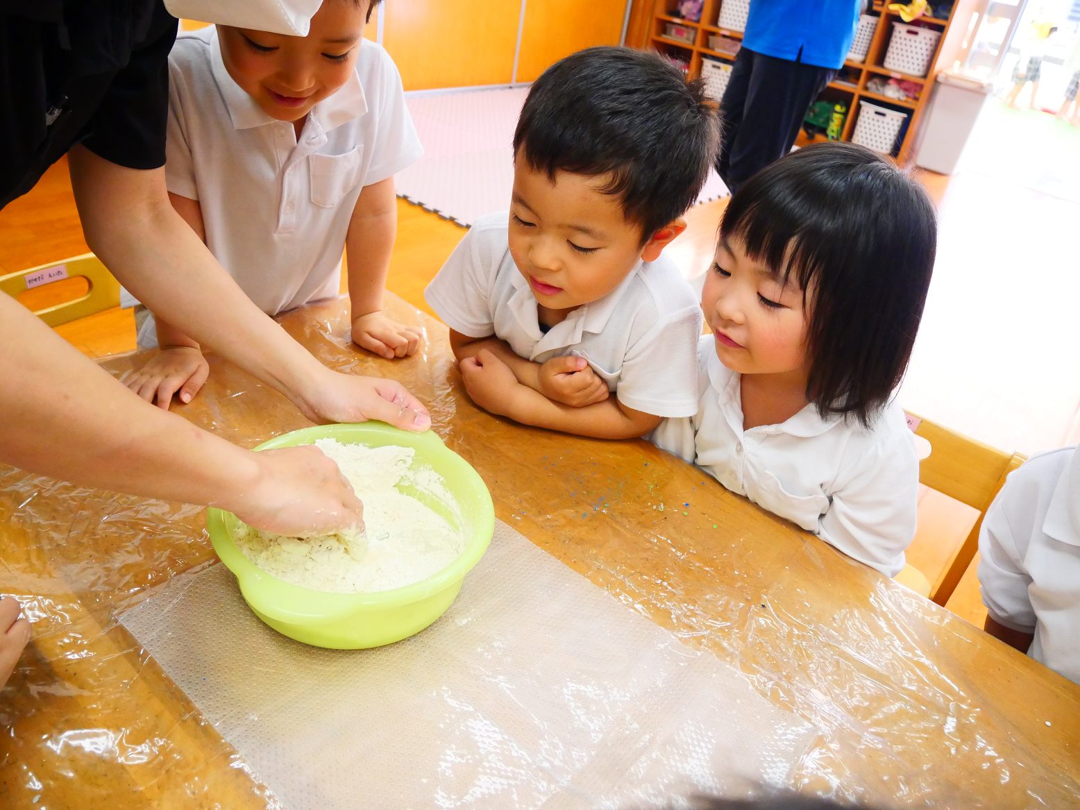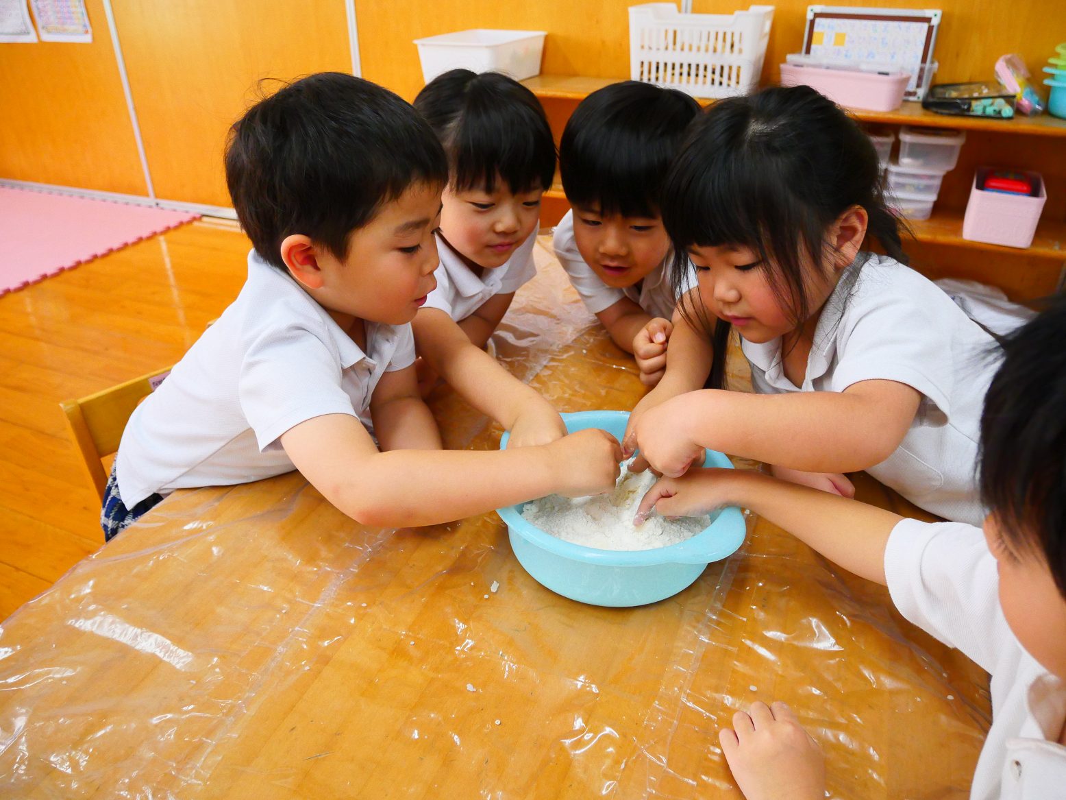 材料は、小麦粉と水と油を使いました。小麦粉に水を入れて少しずつ固まっていく様子に大興奮のうさぎ組さん。「うわ~ちょっときもちわる~い!」と言いながらも触りたくてうずうずしていました。
