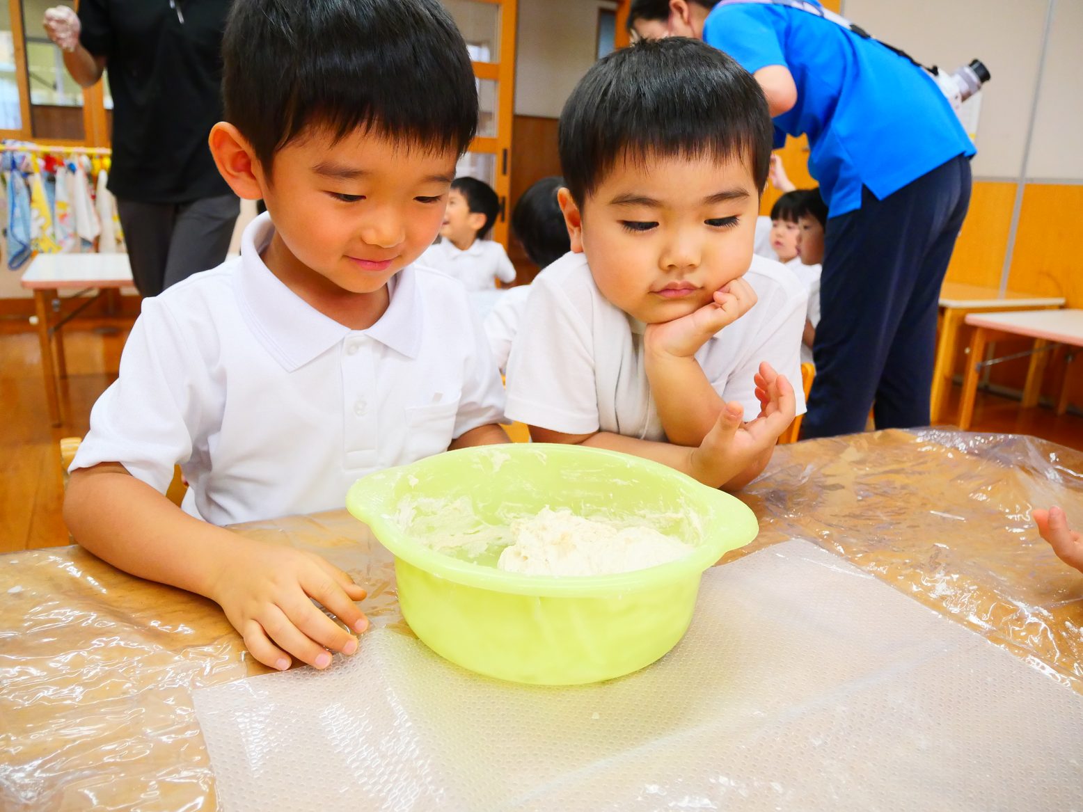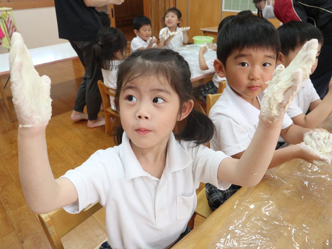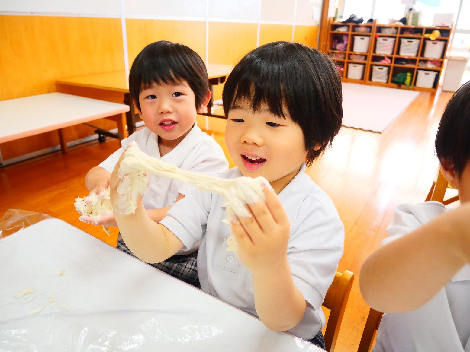 材料は、小麦粉と水と油を使いました。小麦粉に水を入れて少しずつ固まっていく様子に大興奮のうさぎ組さん。「うわ~ちょっときもちわる~い!」と言いながらも触りたくてうずうずしていました。