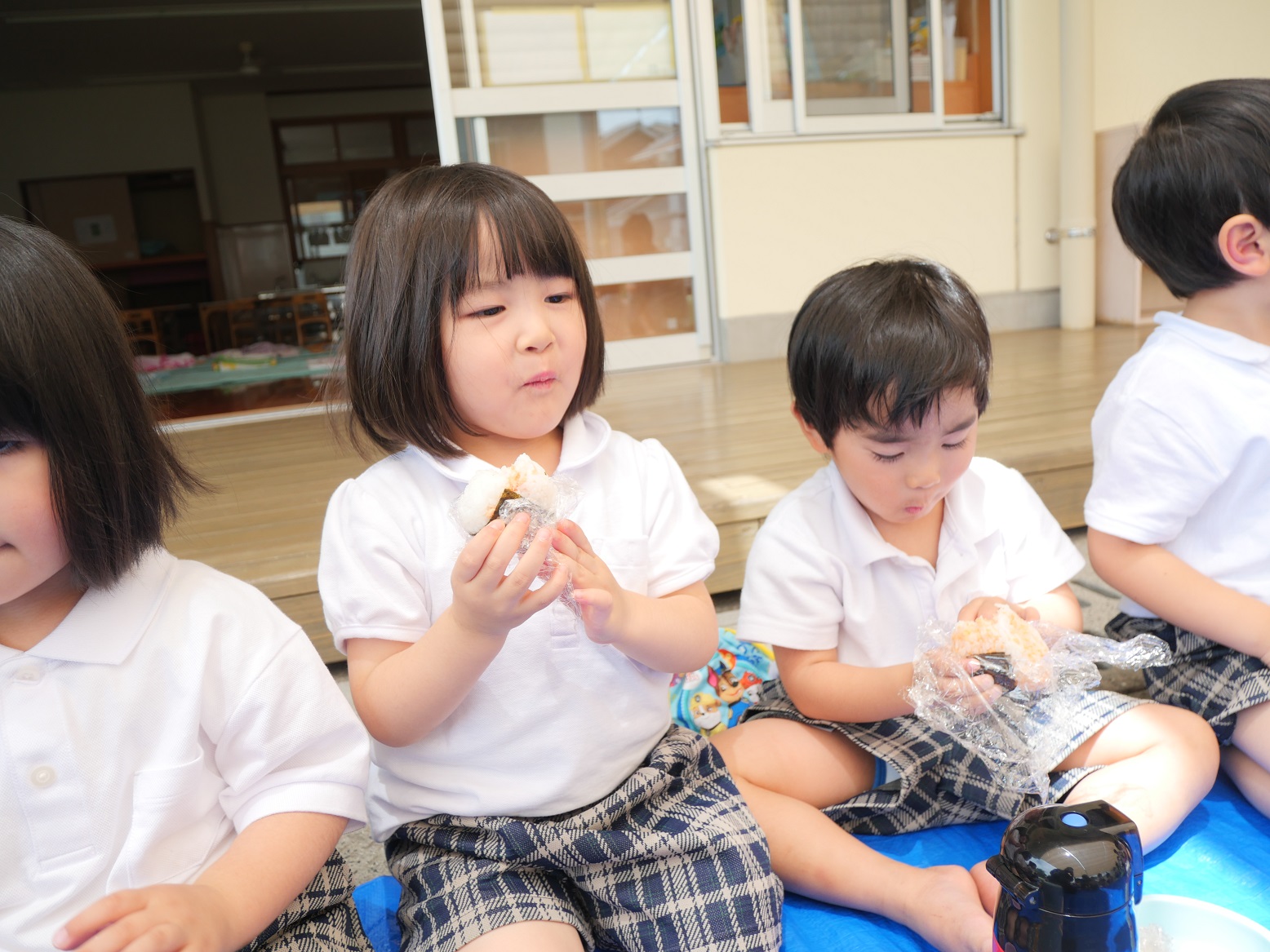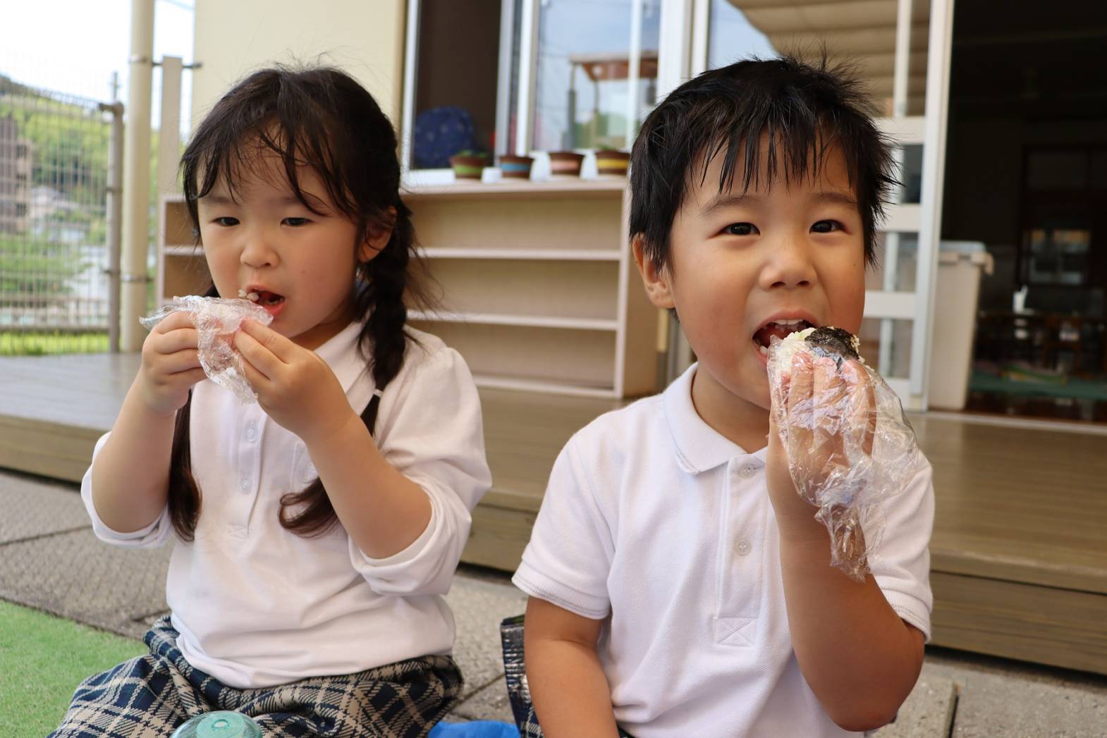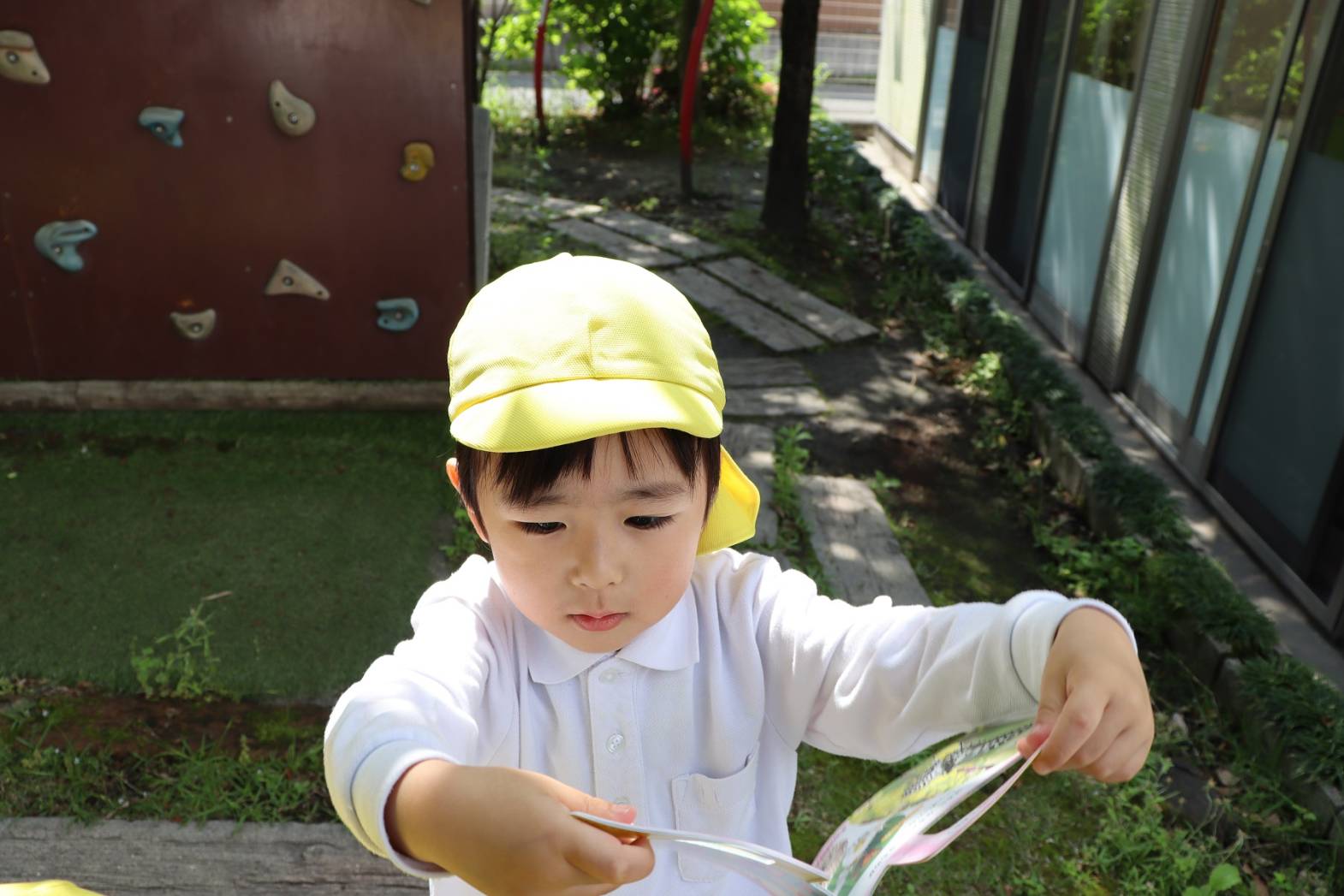 今日は、子どもたちが楽しみにしていた、おむすびの日! 今回は、図鑑を持って森の広場やロッククライミングへ散策に出かけました。 初めての図鑑に興味深々の子どもたち。 虫や花を見つけると、「どこに載ってるかな?」「あ、この虫と似てるね!」 と、図鑑とにらめっこしながら散策していきました。 たくさん活動を楽しんだ後は、おむすびの時間です。 「おにぎり美味しいね!」「お家に帰ったら、今日のお話たくさんしなきゃ!」 と、活動を振り返っていた、りす組さんでした。