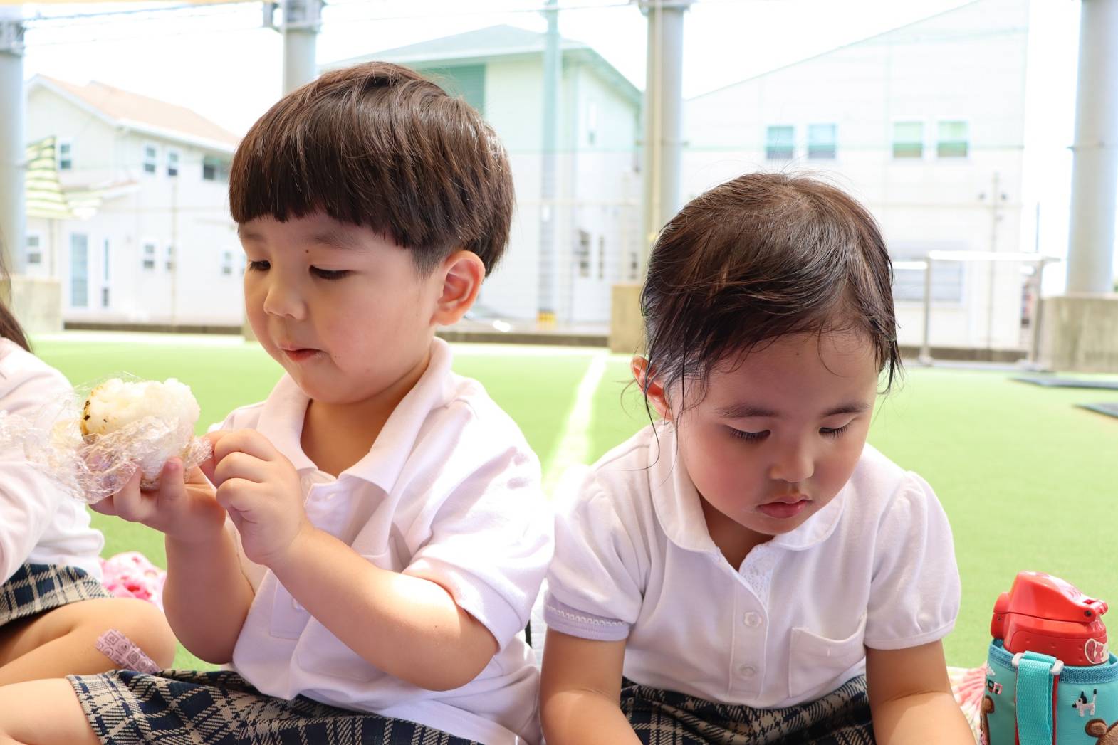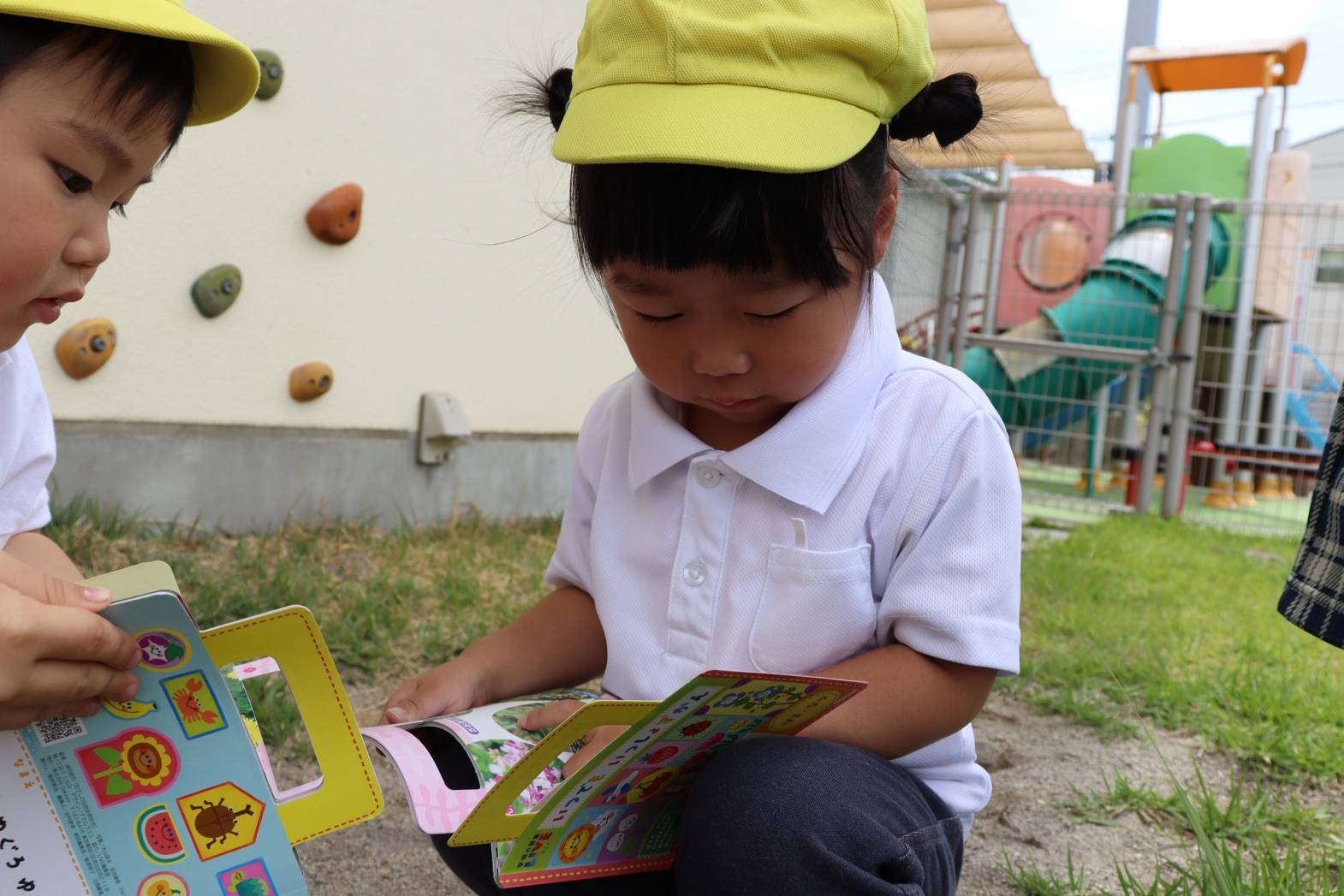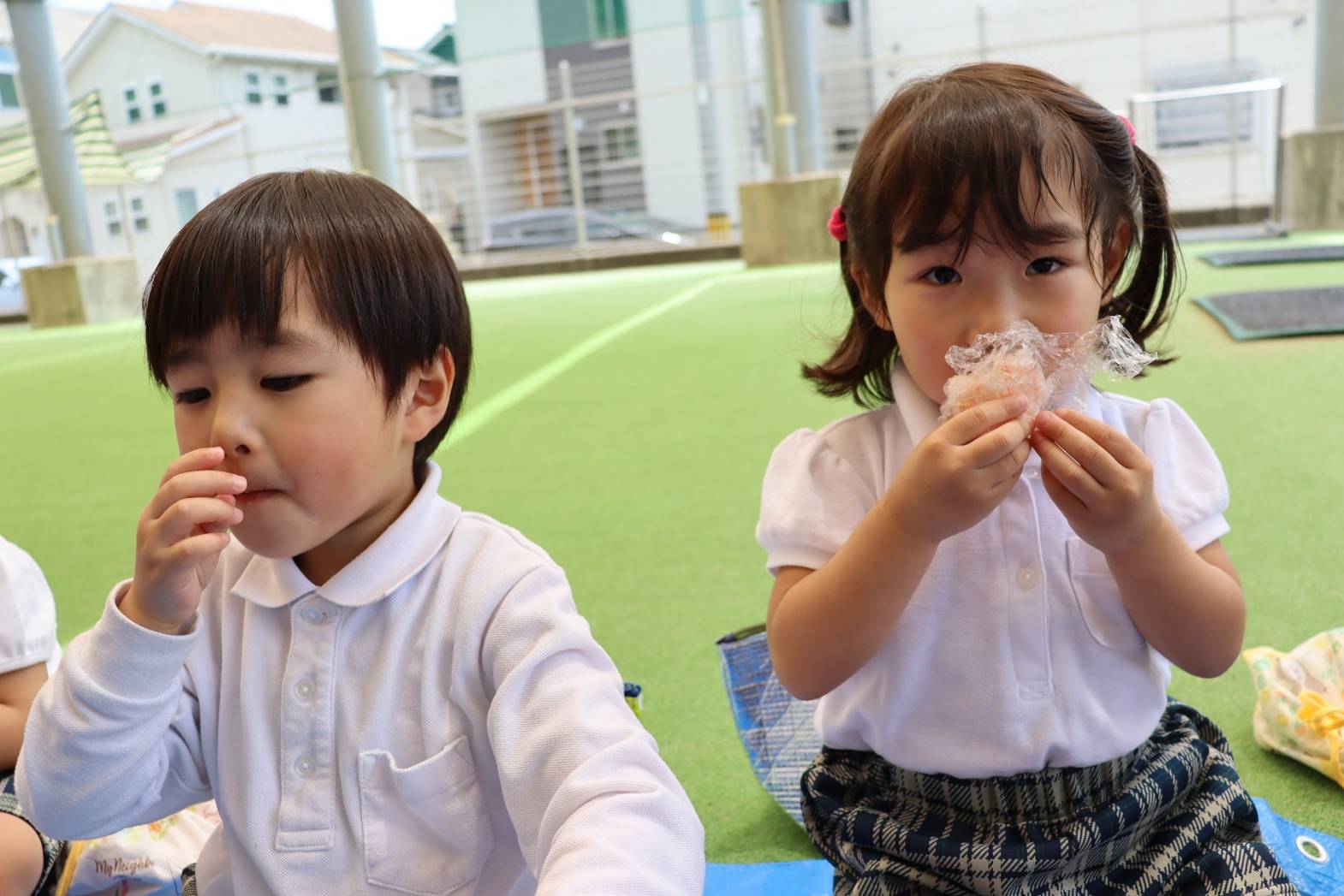 今日は、子どもたちが楽しみにしていた、おむすびの日! 今回は、図鑑を持って森の広場やロッククライミングへ散策に出かけました。 初めての図鑑に興味深々の子どもたち。 虫や花を見つけると、「どこに載ってるかな?」「あ、この虫と似てるね!」 と、図鑑とにらめっこしながら散策していきました。 たくさん活動を楽しんだ後は、おむすびの時間です。 「おにぎり美味しいね!」「お家に帰ったら、今日のお話たくさんしなきゃ!」 と、活動を振り返っていた、りす組さんでした。