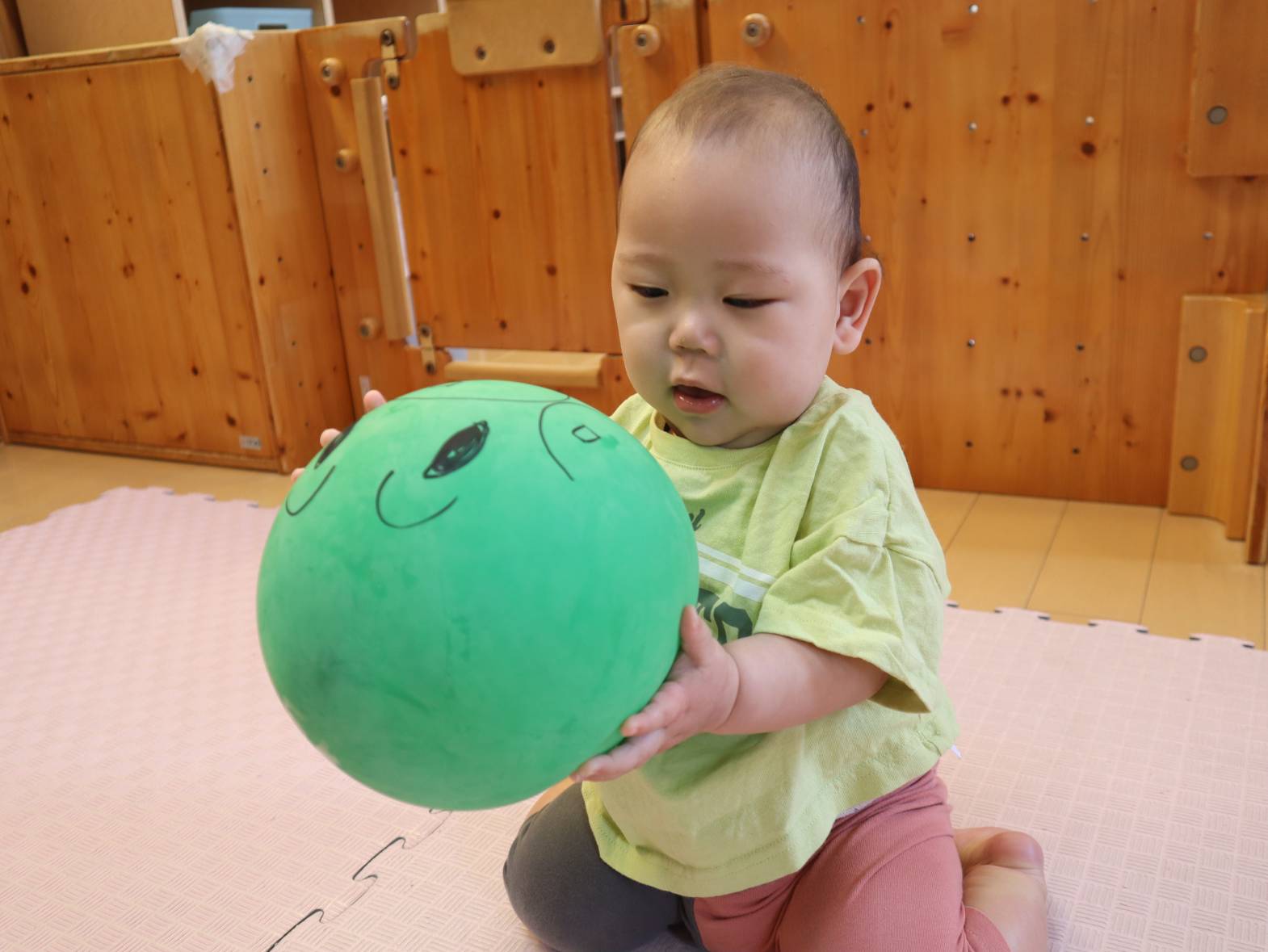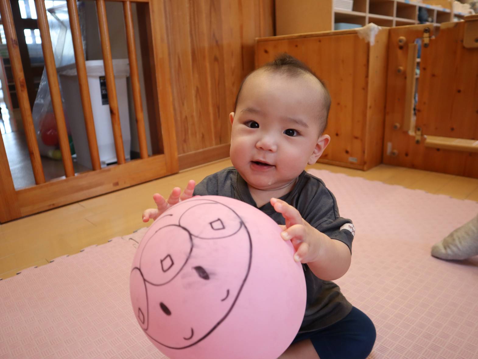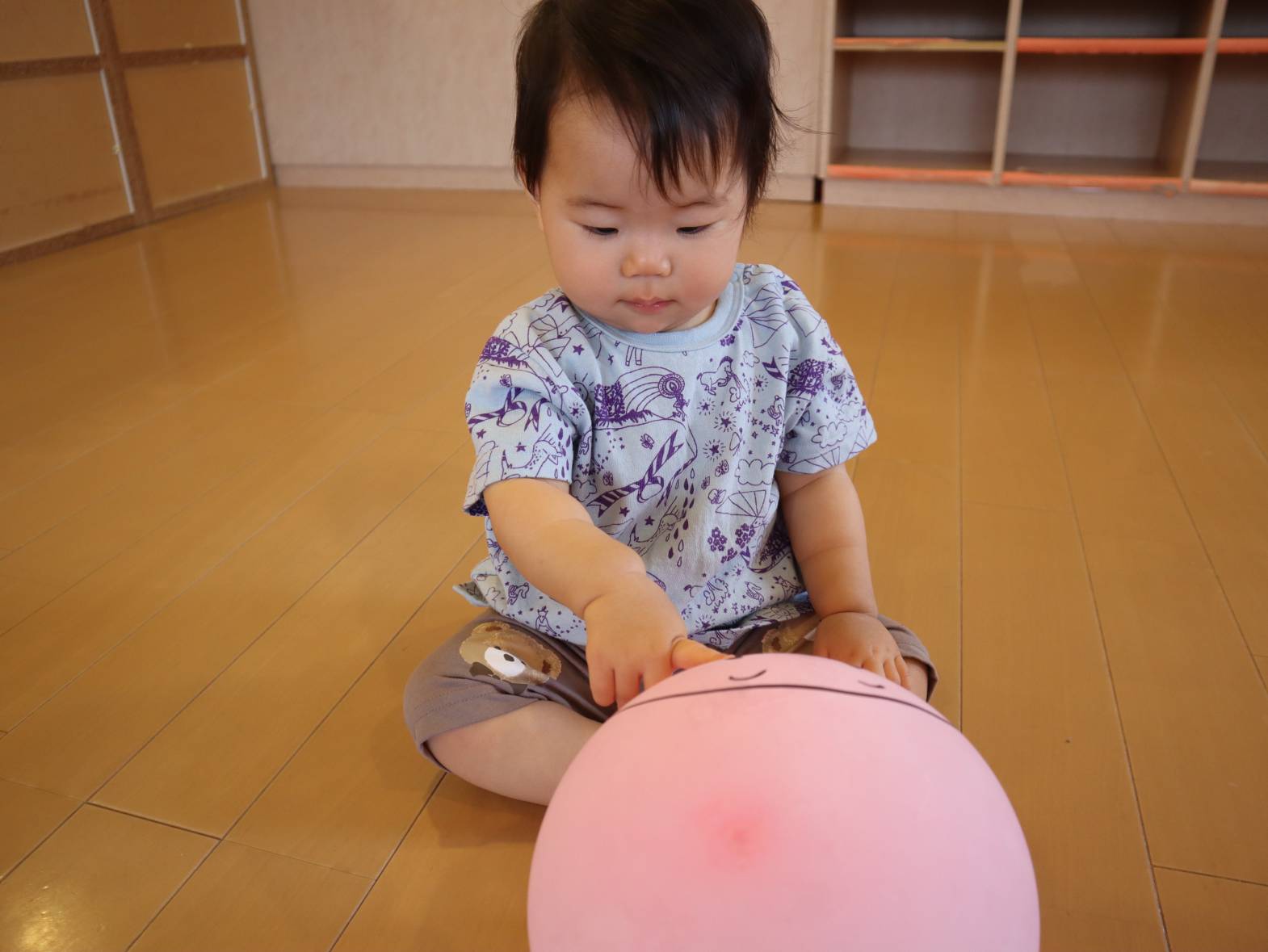 風船をポーンと投げると、「キャー!」と声を出して喜ぶひよこ組さん! 風でフワフワ逃げる風船をハイハイで一生懸命追いかけ、つかまえると結び目を引っ張ったり振ったりして感触を楽しみます。 風船に絵を描くと、「あー!」と指差しをする姿も。 風船を見ただけで笑顔があふれる子どもたちです!