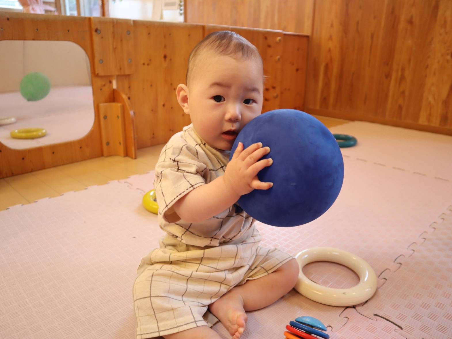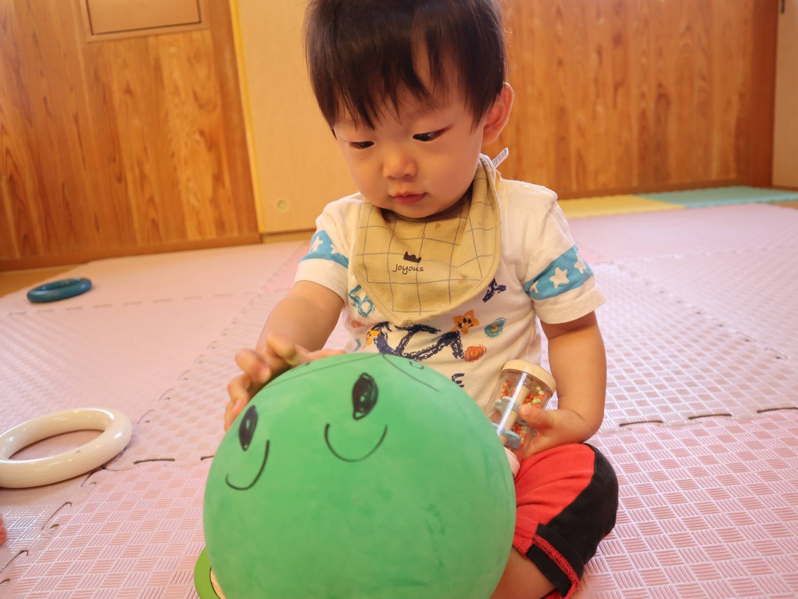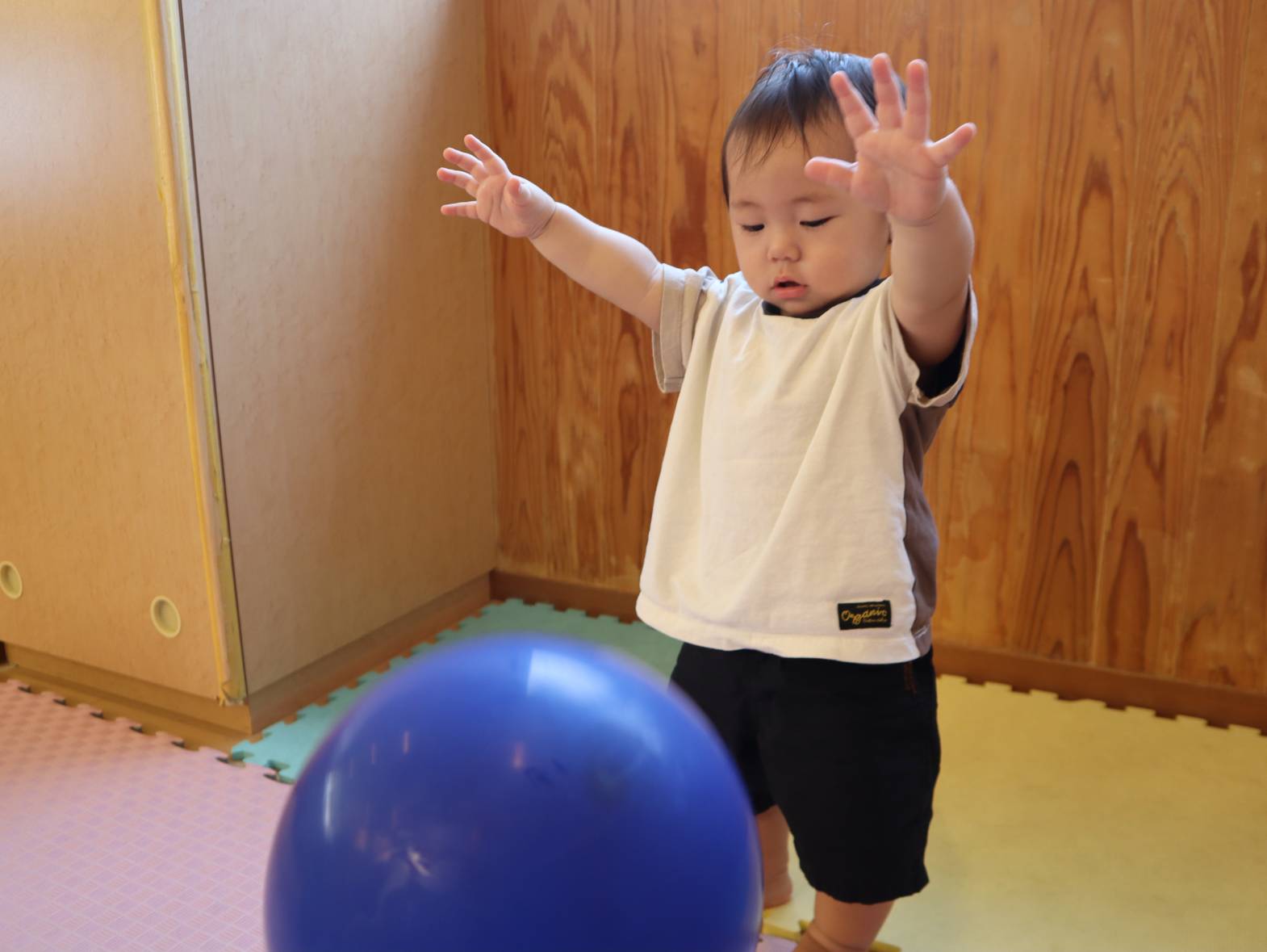 風船をポーンと投げると、「キャー!」と声を出して喜ぶひよこ組さん! 風でフワフワ逃げる風船をハイハイで一生懸命追いかけ、つかまえると結び目を引っ張ったり振ったりして感触を楽しみます。 風船に絵を描くと、「あー!」と指差しをする姿も。 風船を見ただけで笑顔があふれる子どもたちです!