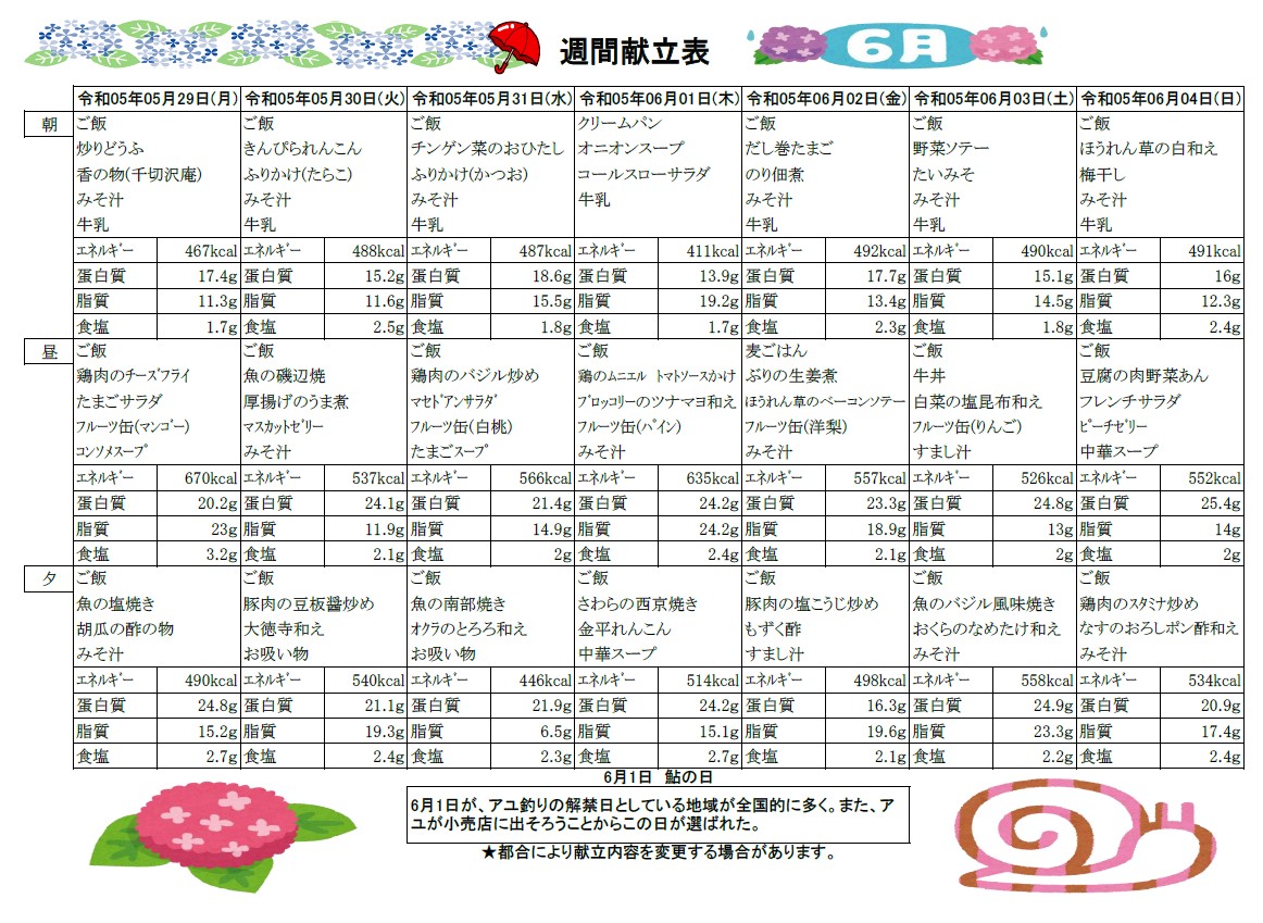 5月29日(月)~6月4日(日)の献立表になります。是非ご覧ください。