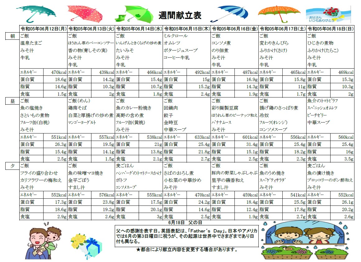 6月12日(月)~6月18日(日)の献立表になります。是非ご覧ください。