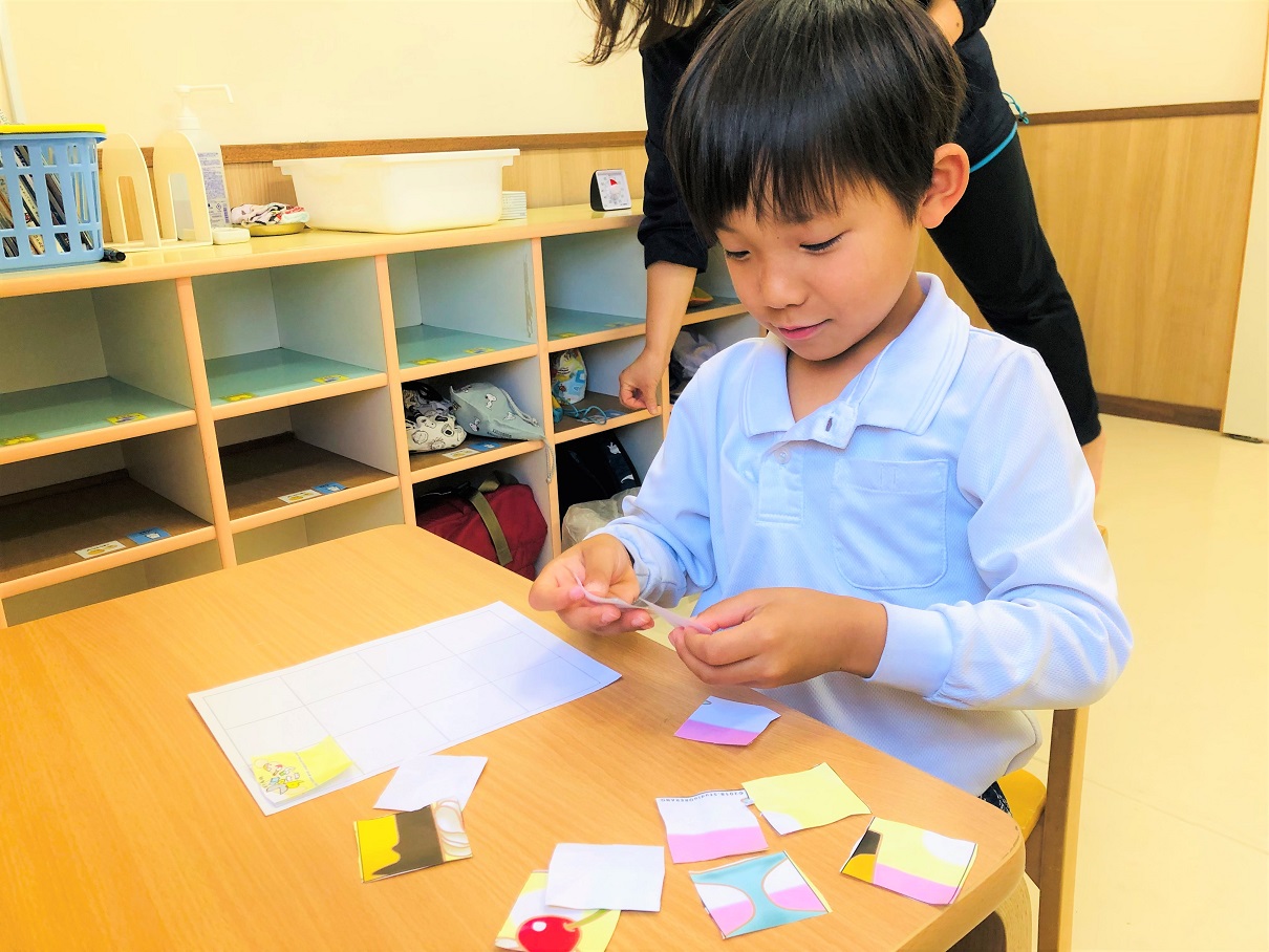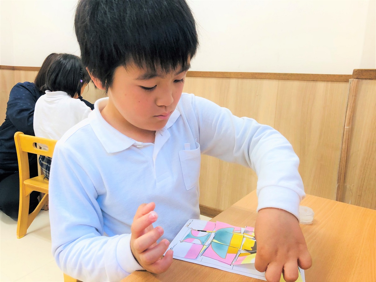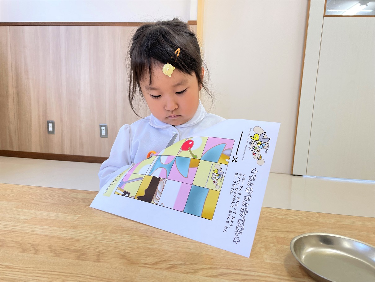 自分で切って作るパズルに挑戦しました! まずはパズルを自分たちで切っていきます。絵を切ってしまわないように慎重に切り進める姿が見られます。 切り終えたら早速並べます!「何の絵か分からないなあ~。」と最初は迷う様子も見られていましたが、並べていくと少しずつ絵が見えてきました。 集中して取り組み並べ終わると、プリンの絵が完成です! 「頑張った~!」「プリンが見えて嬉しい♪」など達成感溢れる声が聞かれ、嬉しさいっぱいのぞう①グループさんでした☆