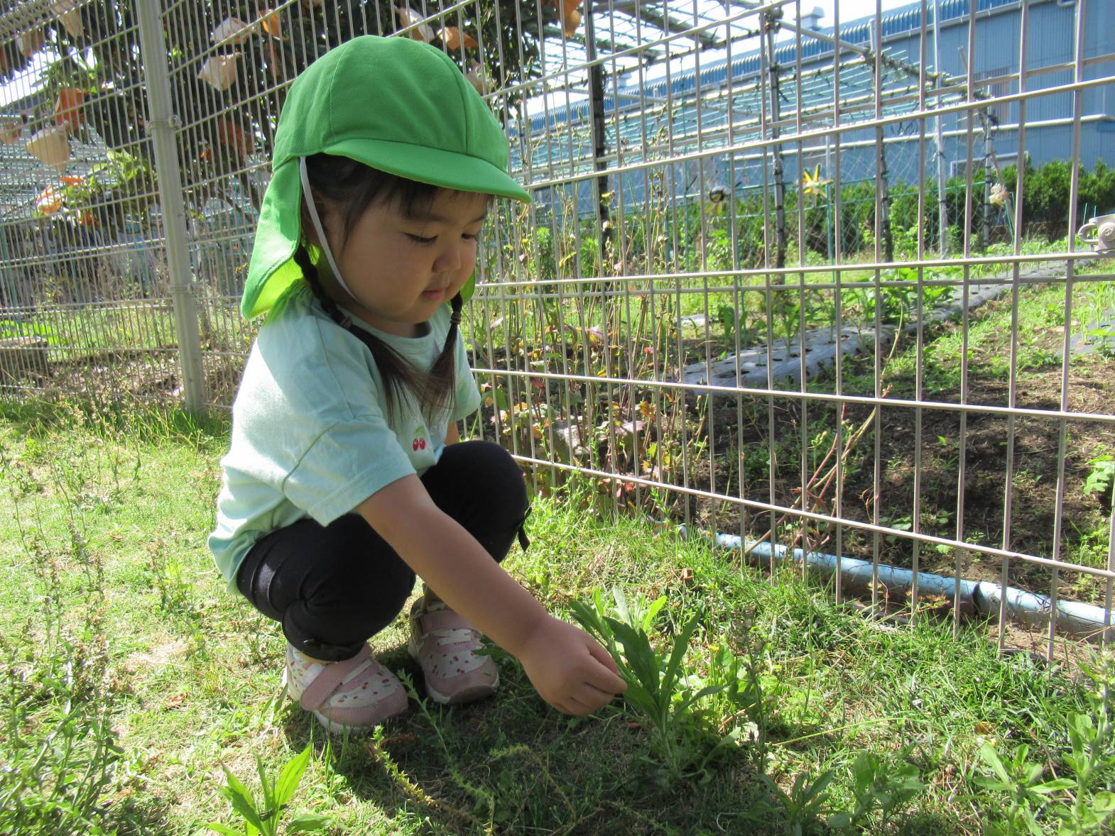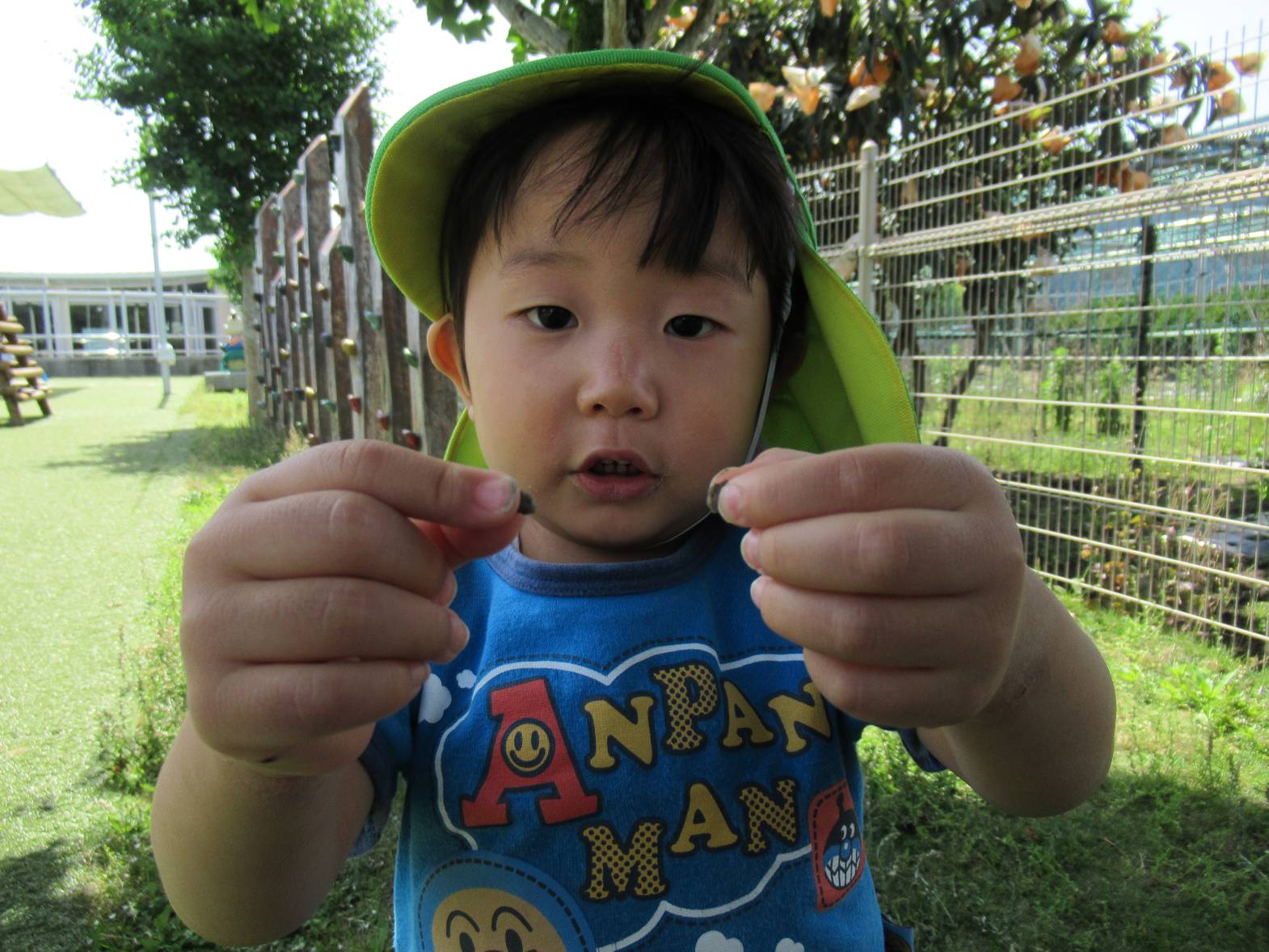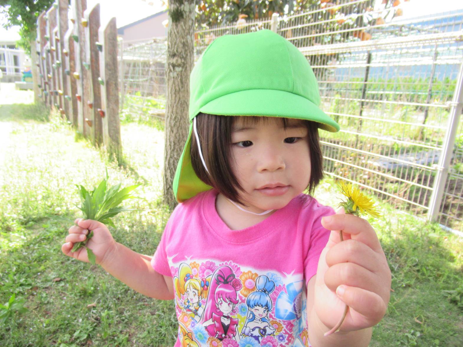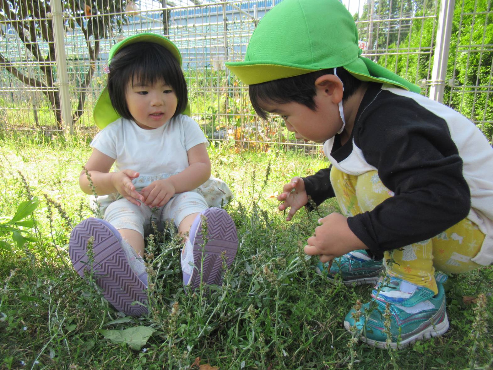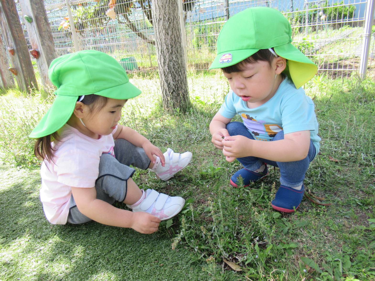 過ごしやすい気候になり、戸外に出ると木の下に行き、昆虫や草花に興味を示している子どもたち。 真剣な表情で昆虫を探したり、草花や落ち葉を手に取ったりする姿が見られます。 「ね!虫!」、「先生来て!」と友だちや保育者に知らせながら園庭探索を楽しんでいるぱんだ組さんです。