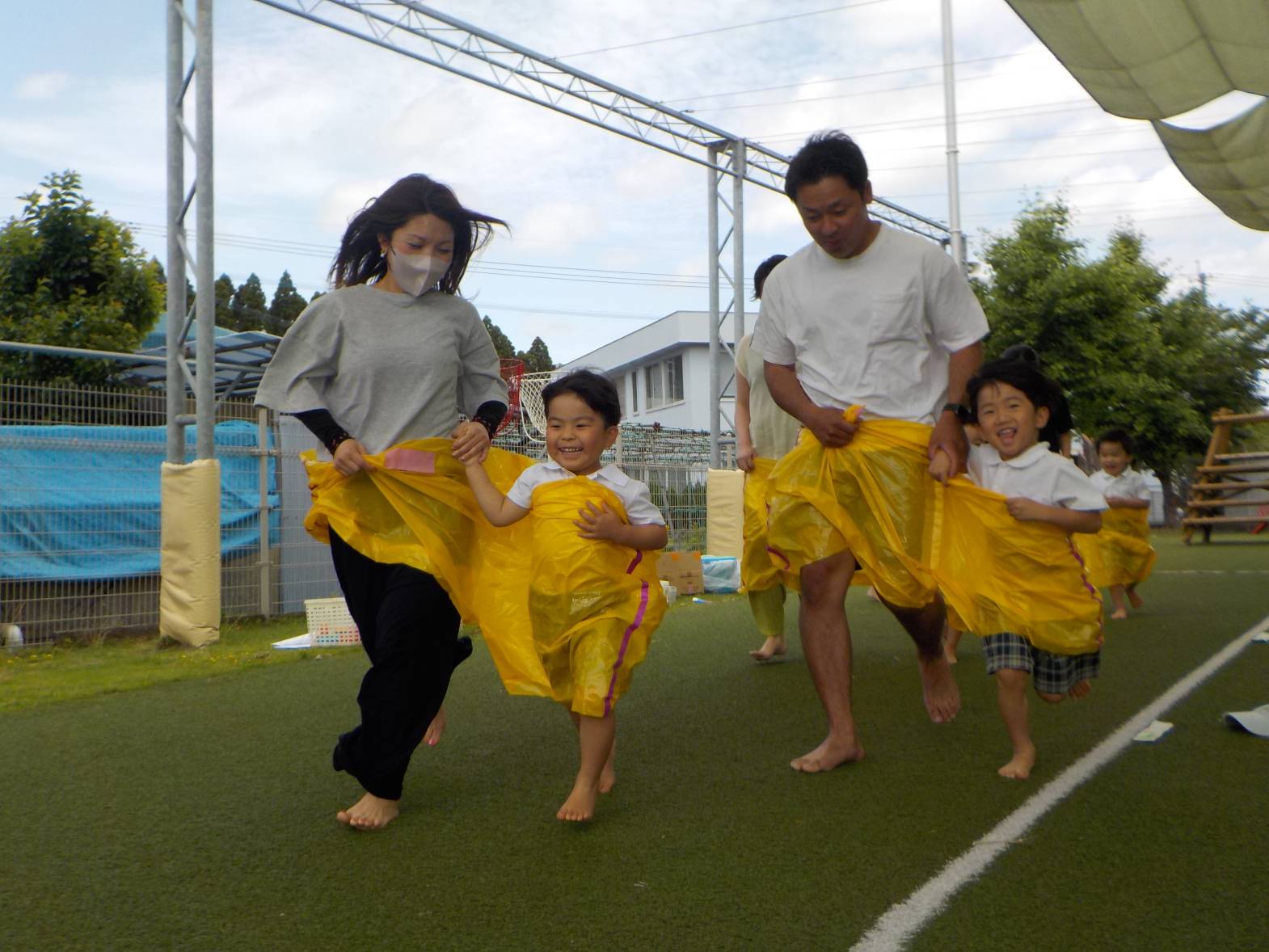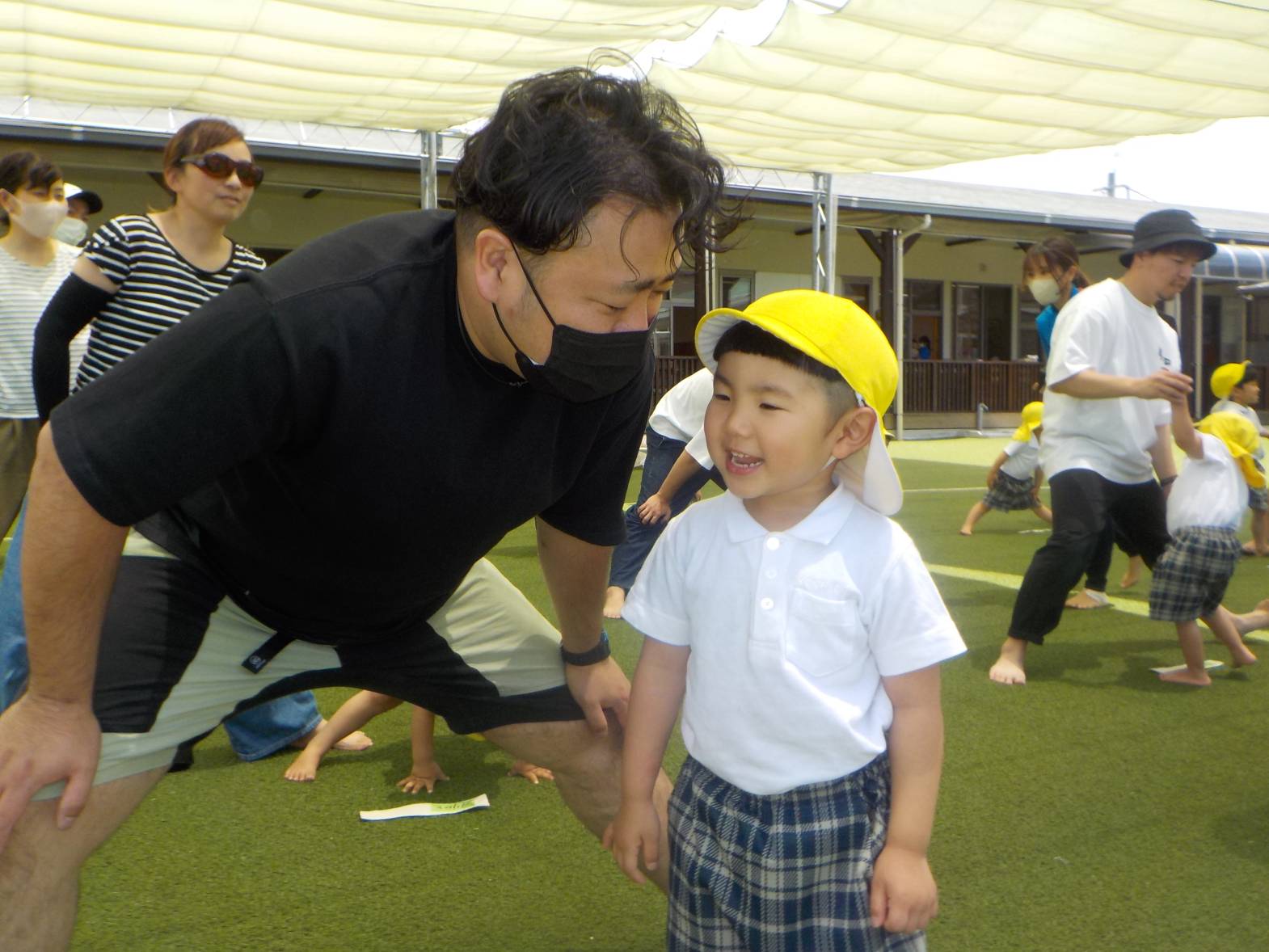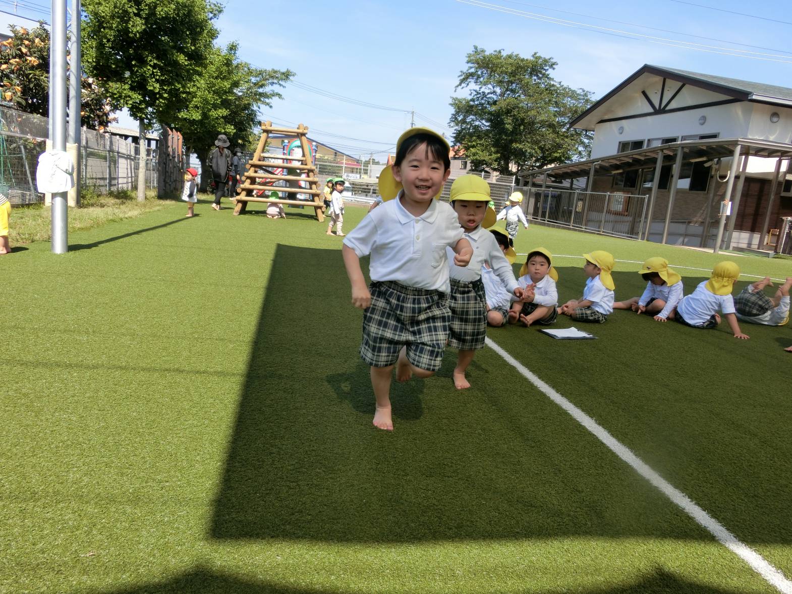 かけっこでは、お父さんお母さんに見守られながら前に出てくると、精いっぱいの声で「はーい!」返事をしてくれました。