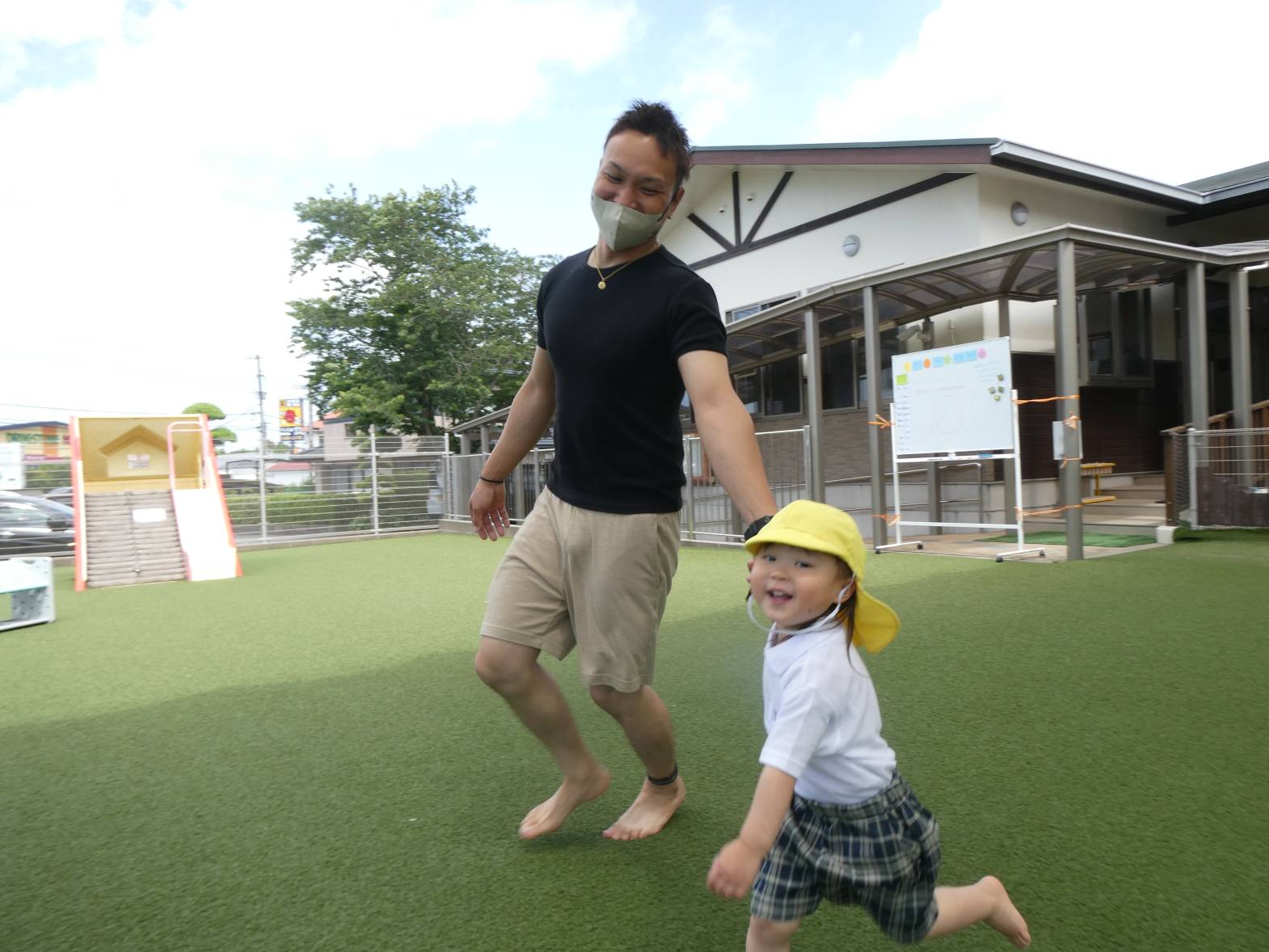 親子競技では、お父さんお母さんと障害物競争に取り組みます。「いち、に!いち、に!」と声を合わせて走ったり、「負けないぞ!」と対決したりと親子での競技を楽しみました。