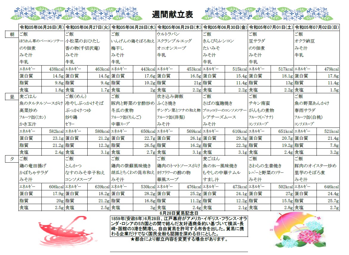 6月26日(月)~7月2日(日)の献立表です。ぜひご覧ください。