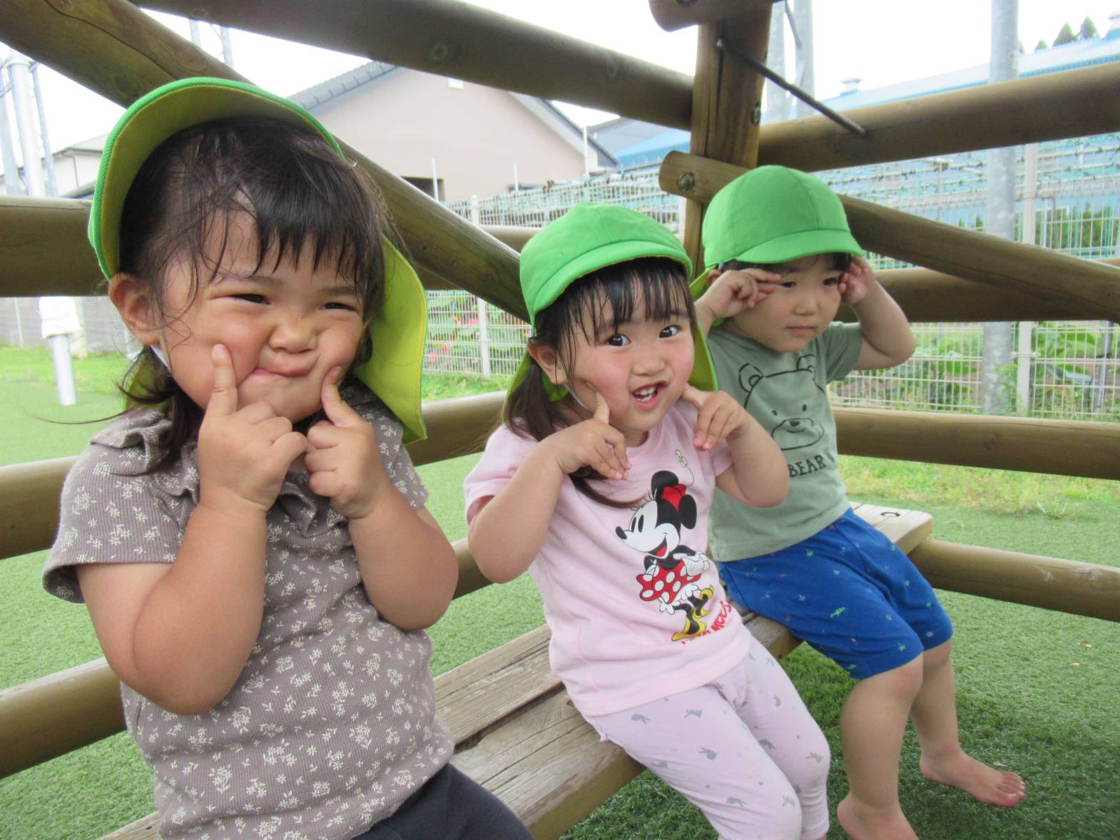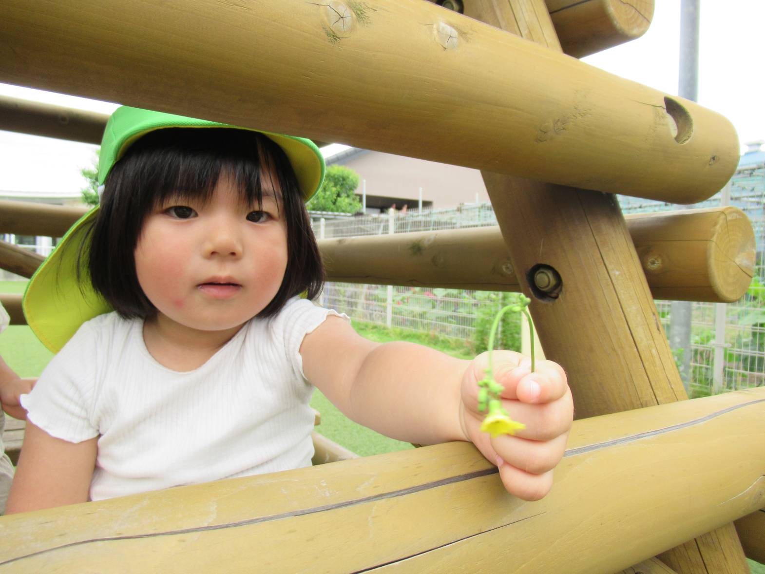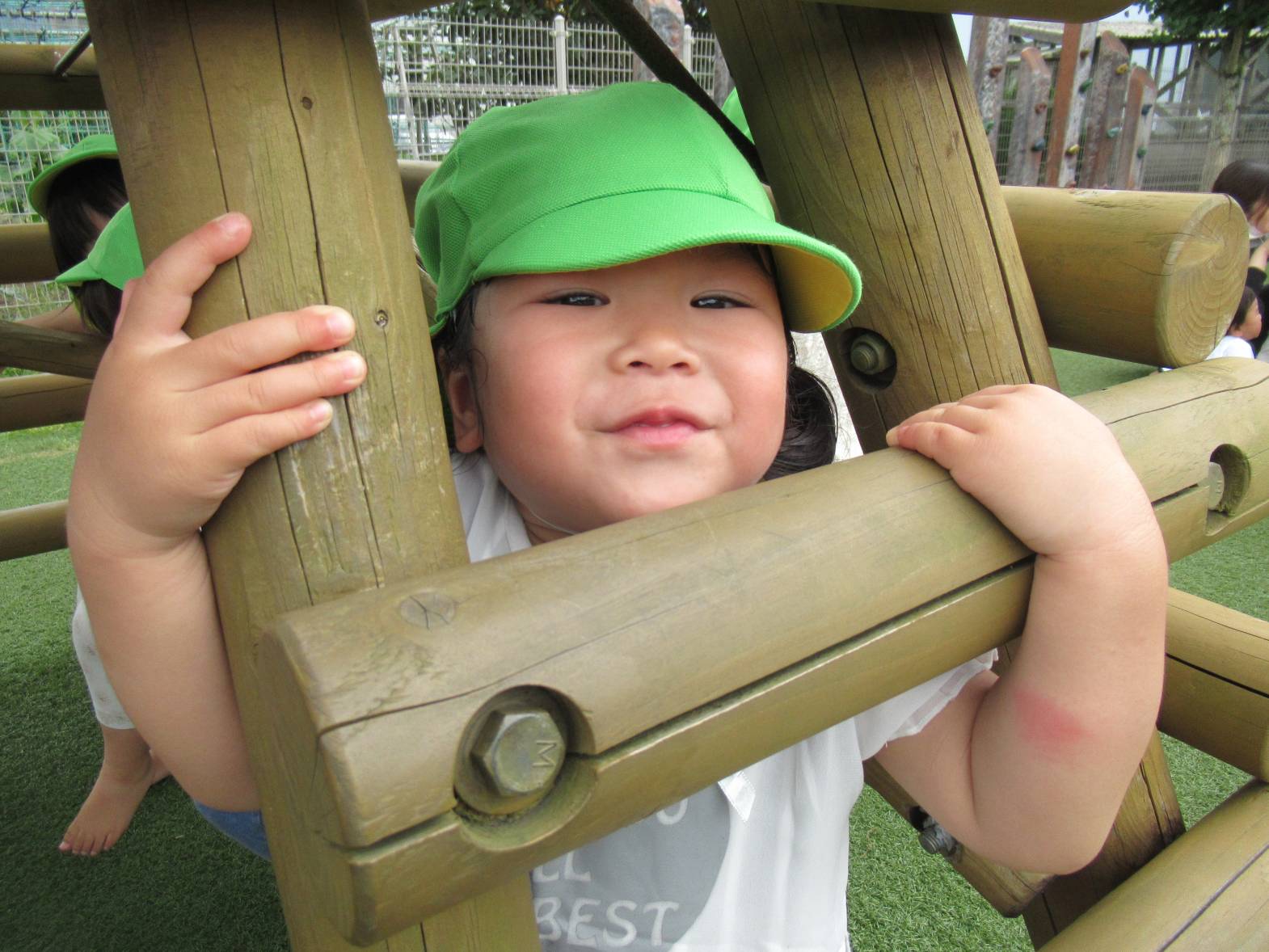 戸外遊びでは、好きな遊具で思い切り体を動かして遊んでいます! やぐらの中に入ると、「いらっしゃいませ~!」とお店屋さんごっこをしたり、「先生!」とやぐらの隙間から顔をのぞかせたりする子どもたち。 「〇〇ちゃんもおいで~!」とみんなでやぐらの中に入ることを楽しんでいるぱんだ組さんです。 蒸し暑くなってきたため、十分に水分補給や休憩をしながら、過ごしていきたいと思います。