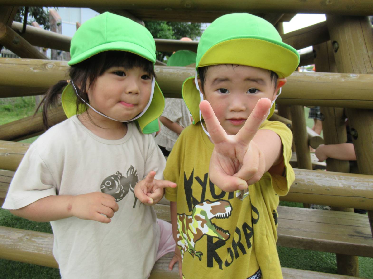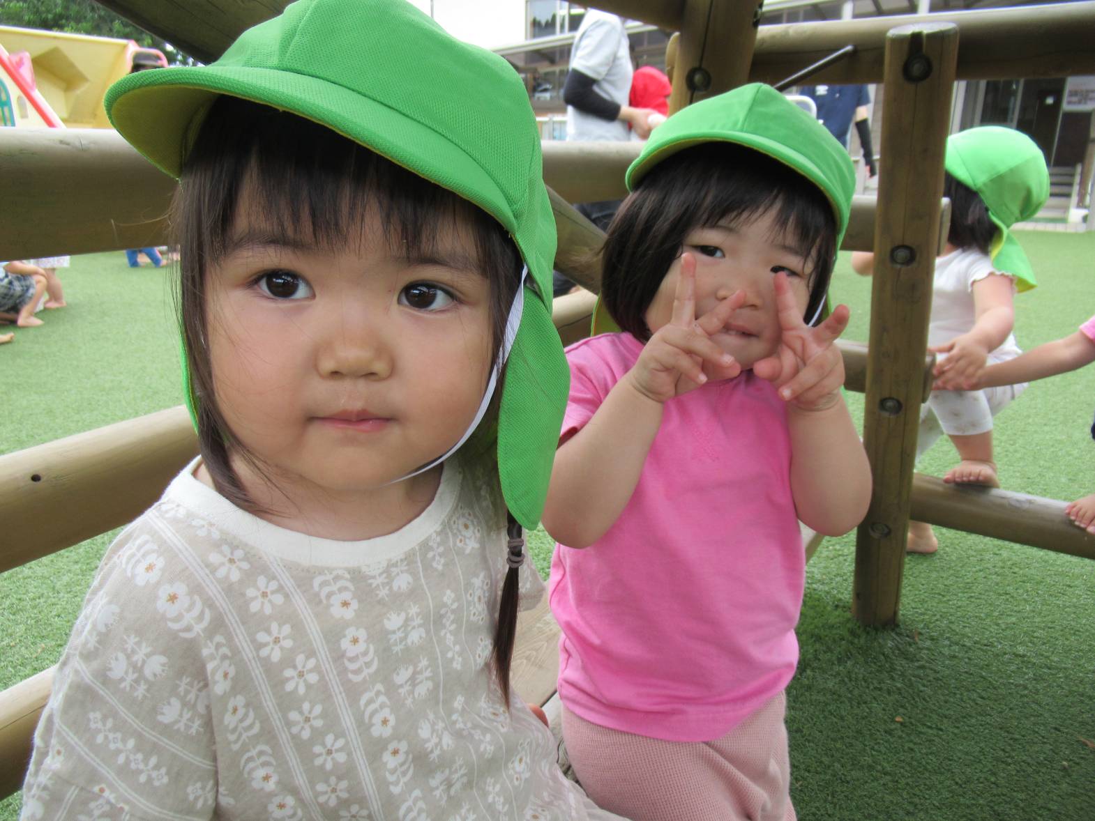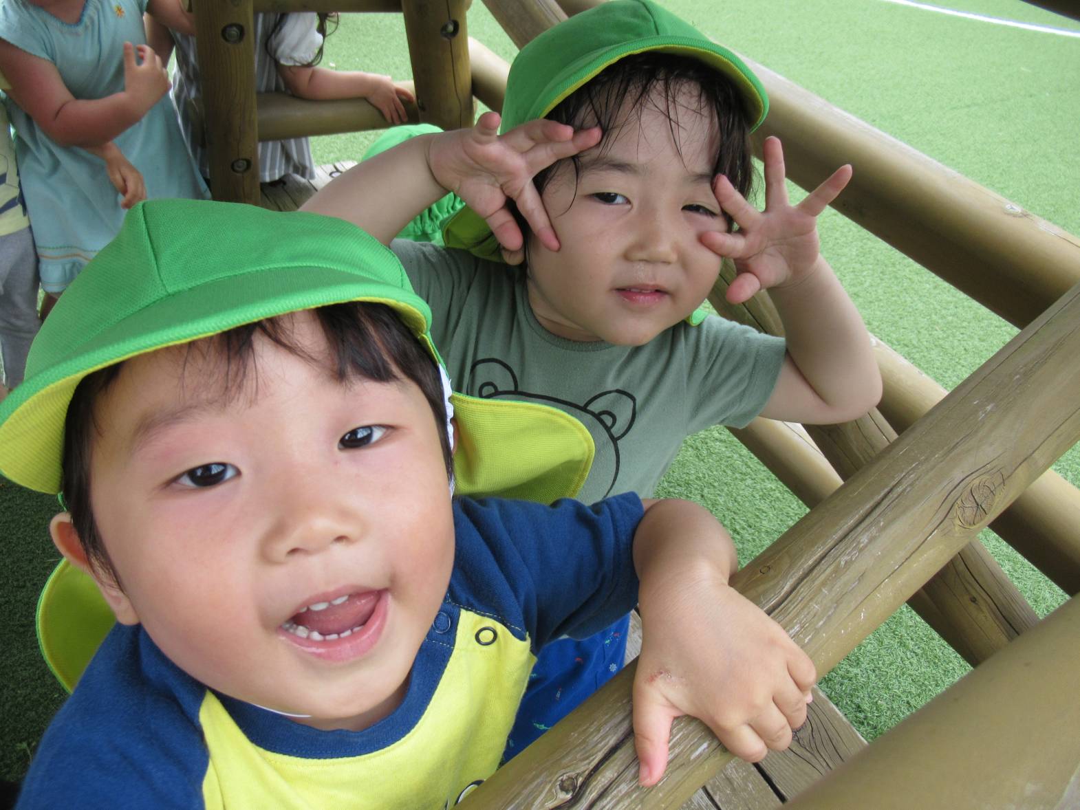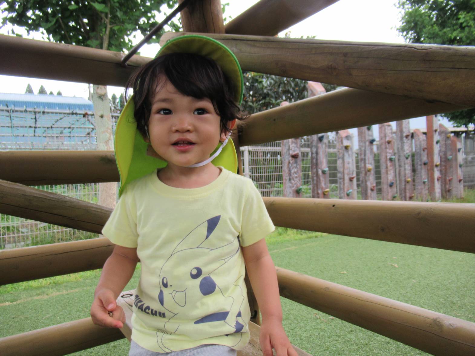 戸外遊びでは、好きな遊具で思い切り体を動かして遊んでいます! やぐらの中に入ると、「いらっしゃいませ~!」とお店屋さんごっこをしたり、「先生!」とやぐらの隙間から顔をのぞかせたりする子どもたち。 「〇〇ちゃんもおいで~!」とみんなでやぐらの中に入ることを楽しんでいるぱんだ組さんです。 蒸し暑くなってきたため、十分に水分補給や休憩をしながら、過ごしていきたいと思います。