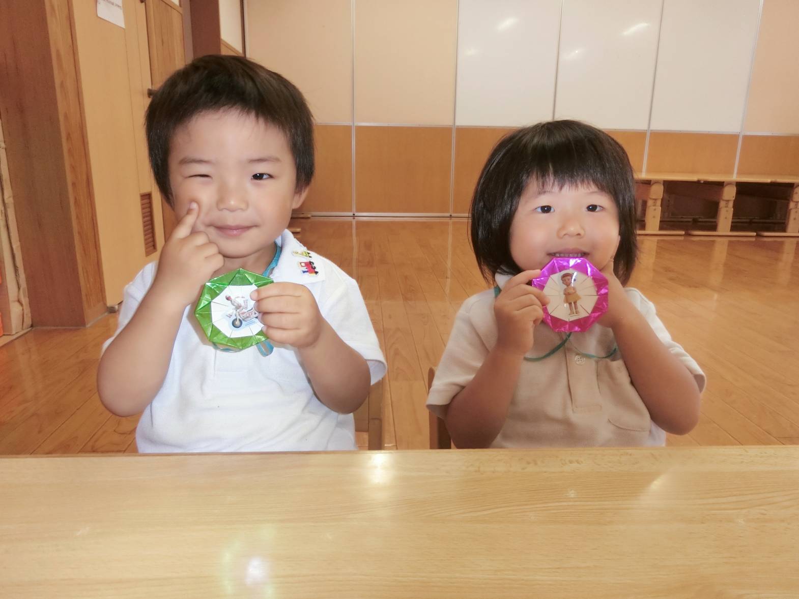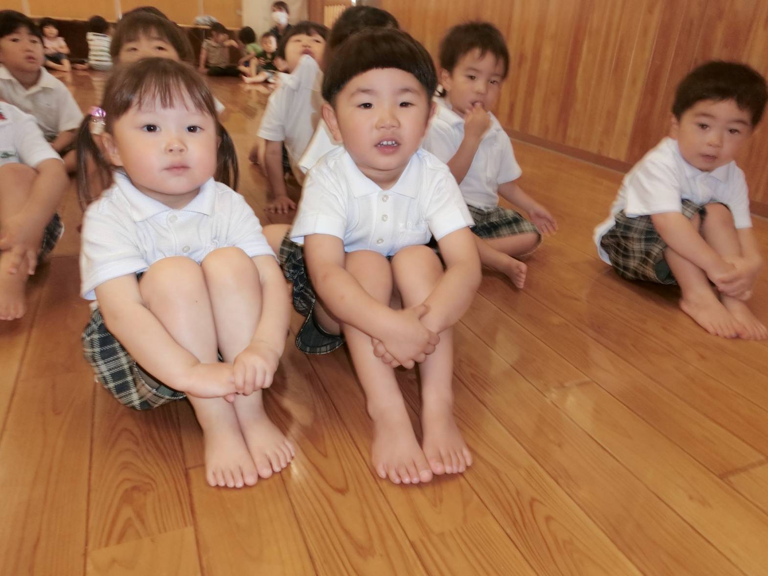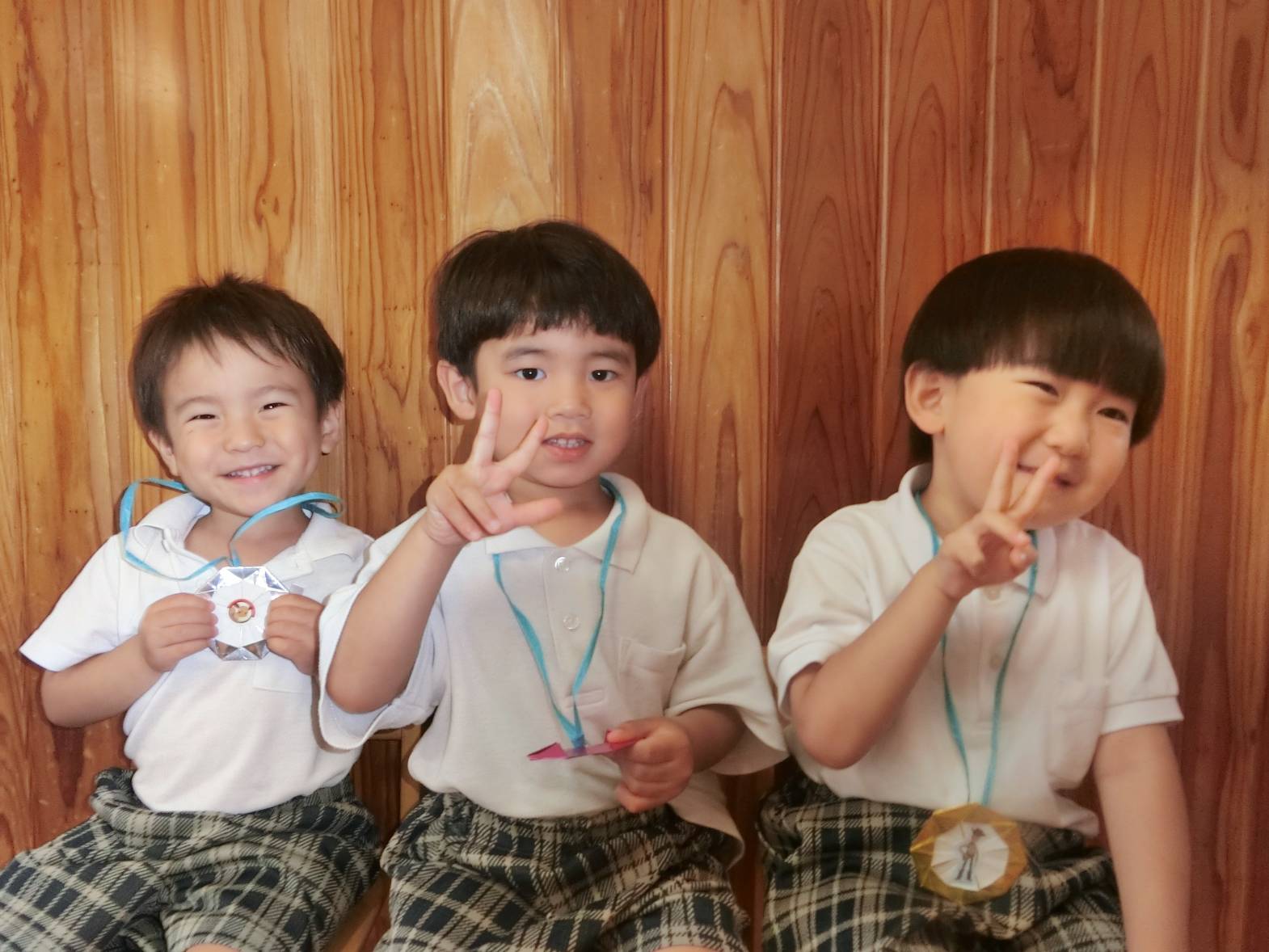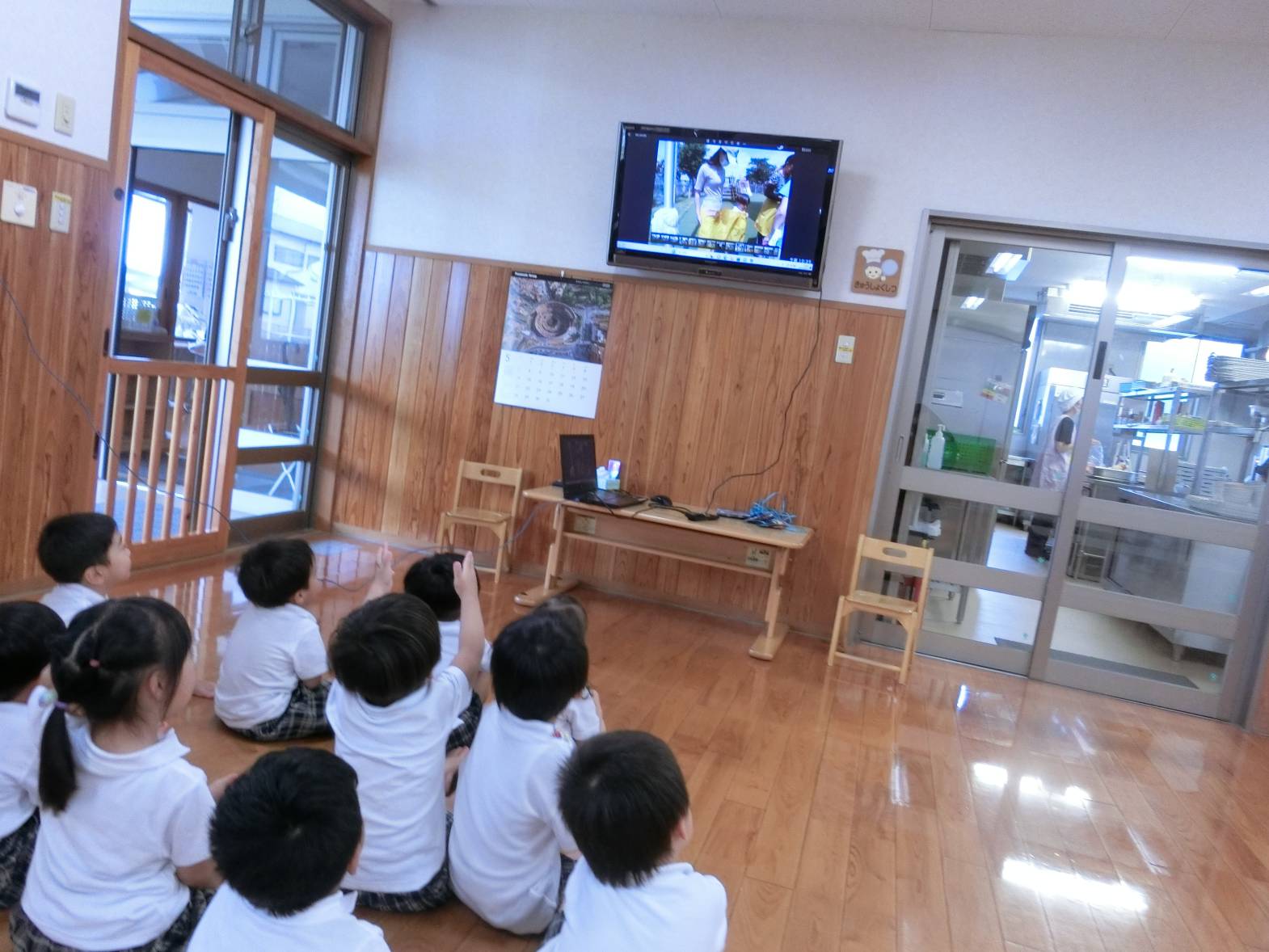 先日の親子レクリエーションの写真や動画の鑑賞会をしました! 子どもたちは、写真や動画を見て「これ、親子レクリエーションだよね。」、「見て、お父さんと走ってる。」と嬉しそうな様子です。 バルーンの動画を見ると、「いち、に、さん、し!」、「ファイト!」など動画を見ながら声を出したり、動いたりするりす組さん。 最後に、頑張ったみんなにメダルと好きなシールのプレゼントをすると大喜びの子どもたちでした!